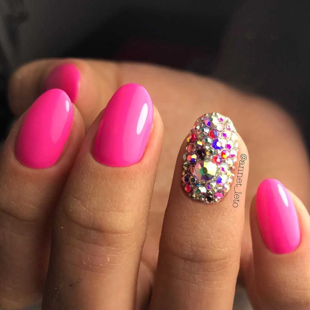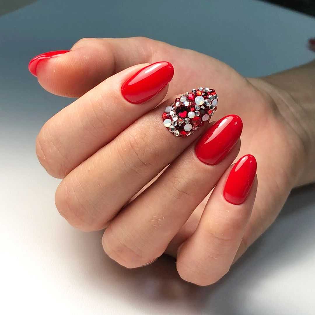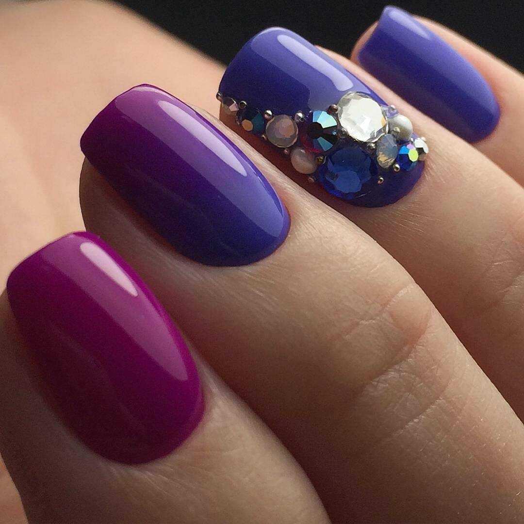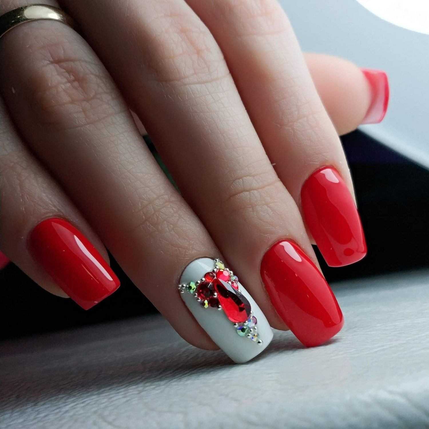 Все чаще яркий маникюр дополнительно покрывают специальным матовым лаком или топом. Благодаря чему оформление получается более сдержанным и в то же время элегантным. В то же время, стразы компенсируют утраченную яркость и преподносят маникюр совершенно по-другому. Ведь их блеск становится гораздо более заметным и эффектным. Это современное решение выбирают модницы для вечерних или праздничных образов. Особенно это касается покрытия в красном, изумрудном, синем и фиолетовом цвете.