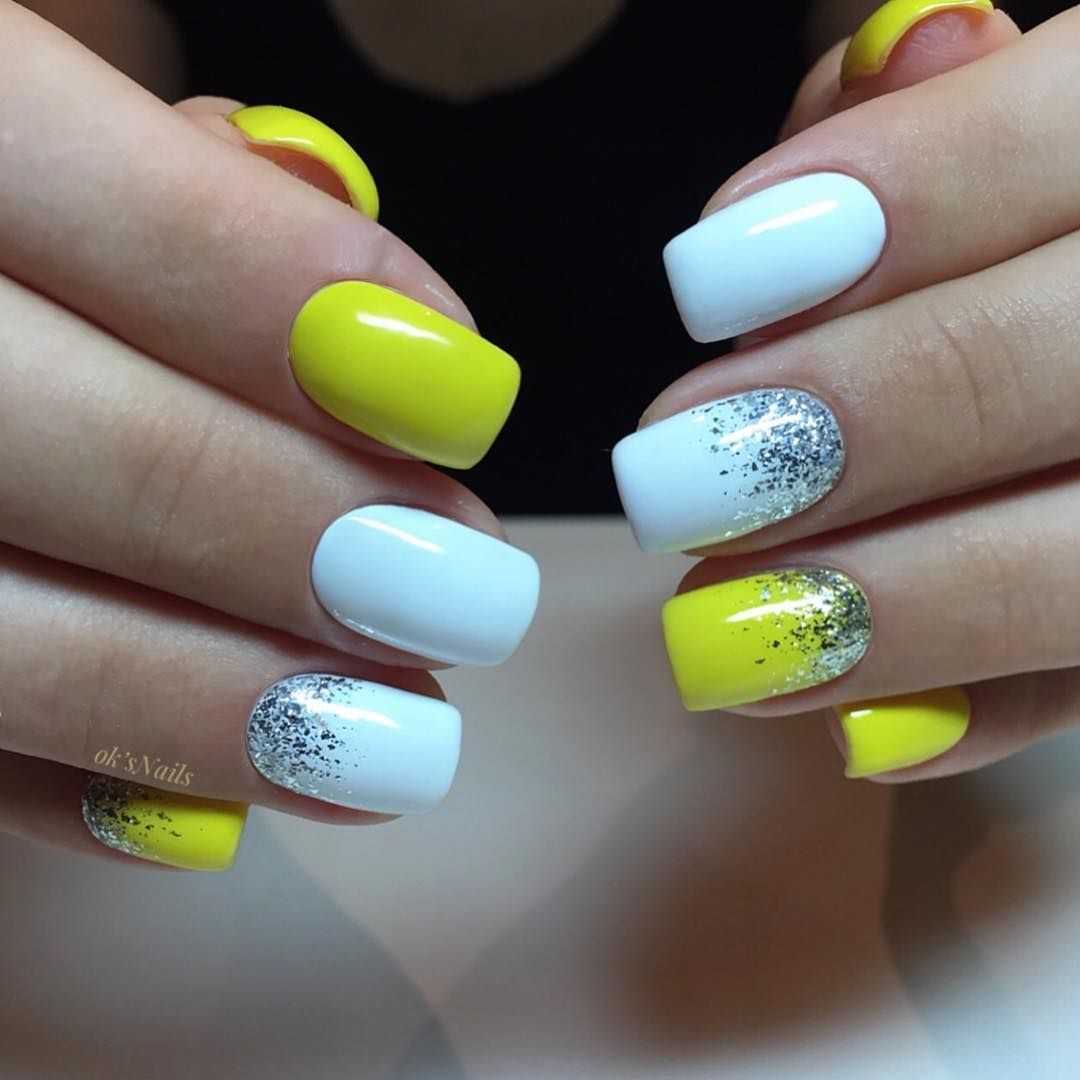 Этот популярный, стильный и красивый прием никогда не утратит своей популярности в сфере нейл-арт индустрии. Известные и модные тенденции делятся на два типа – эффект градиента белого цвета с плавным переходом в блестки, а также растягивание сверкающих блесток на ногтевой пластине, покрытой белым тоном. При этом в любом из вариантов можно использовать блестки разного цвета и формы. Омбре, выполненное при использовании блесток, очень хорошо сочетается с отдельными длинными и острыми ноготками, покрытыми полностью сверкающим декором.