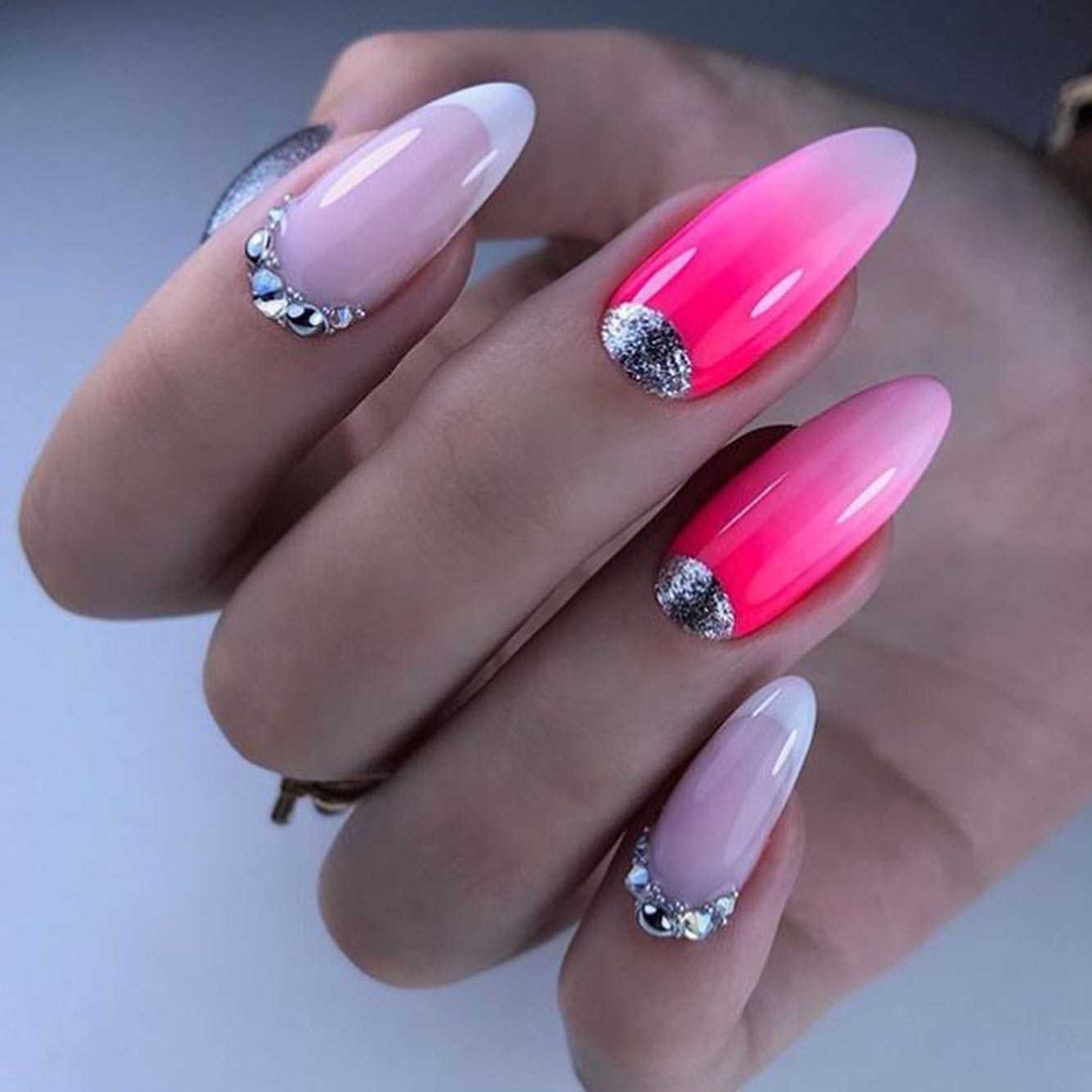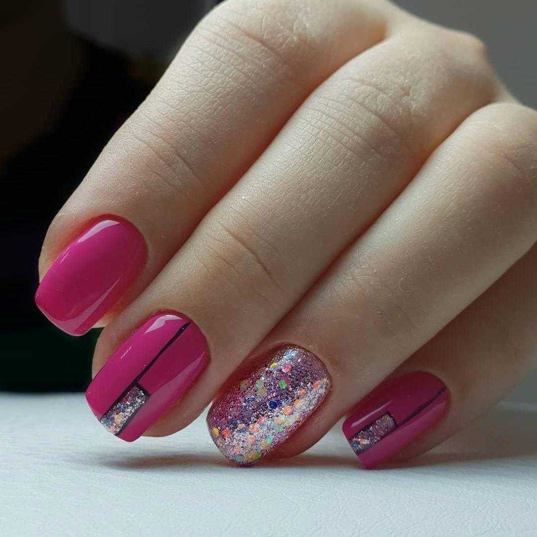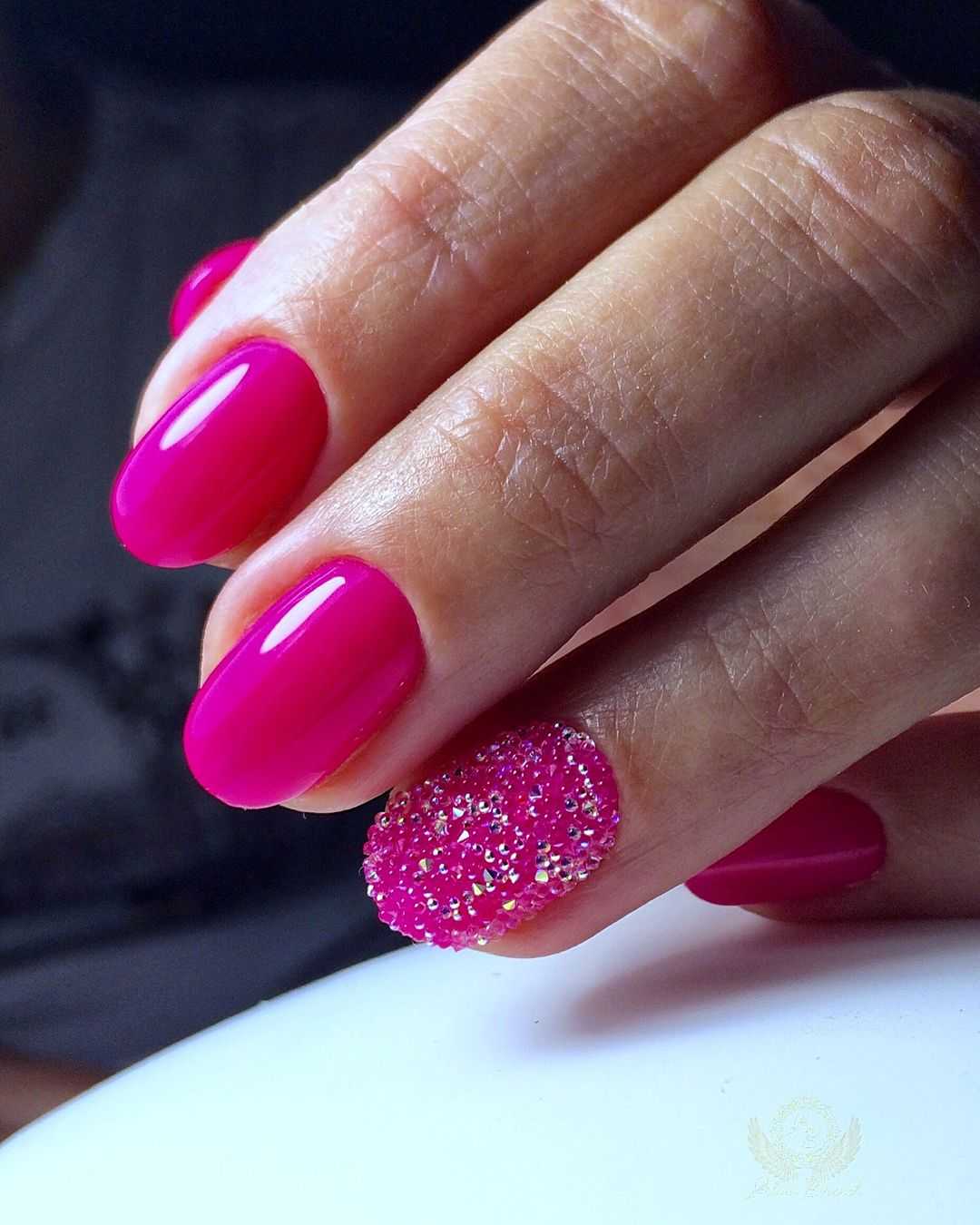 Использование в маникюре насыщенных оттенков совсем не ставит под запрет применение в оформлении блестящей акриловой пудры. Втирка в этом случае не только сглаживает яркость цветов, но и наполняет их лёгким волшебным блеском. Покройте свои ноготки жемчужным или перламутровым материалом. С таким сиянием даже неоновое покрытие будет выглядеть нежно и романтично. Стразы в этом случае гармонично украсят нескольких ногтевых пластин. В большинстве вариаций это россыпь мелких элементов, полоски или разнообразные узоры. Хрустальная крошка, покрывающая полостью один из ноготков, будет смотреться не менее эффектно.