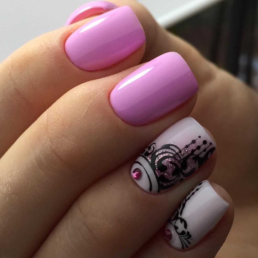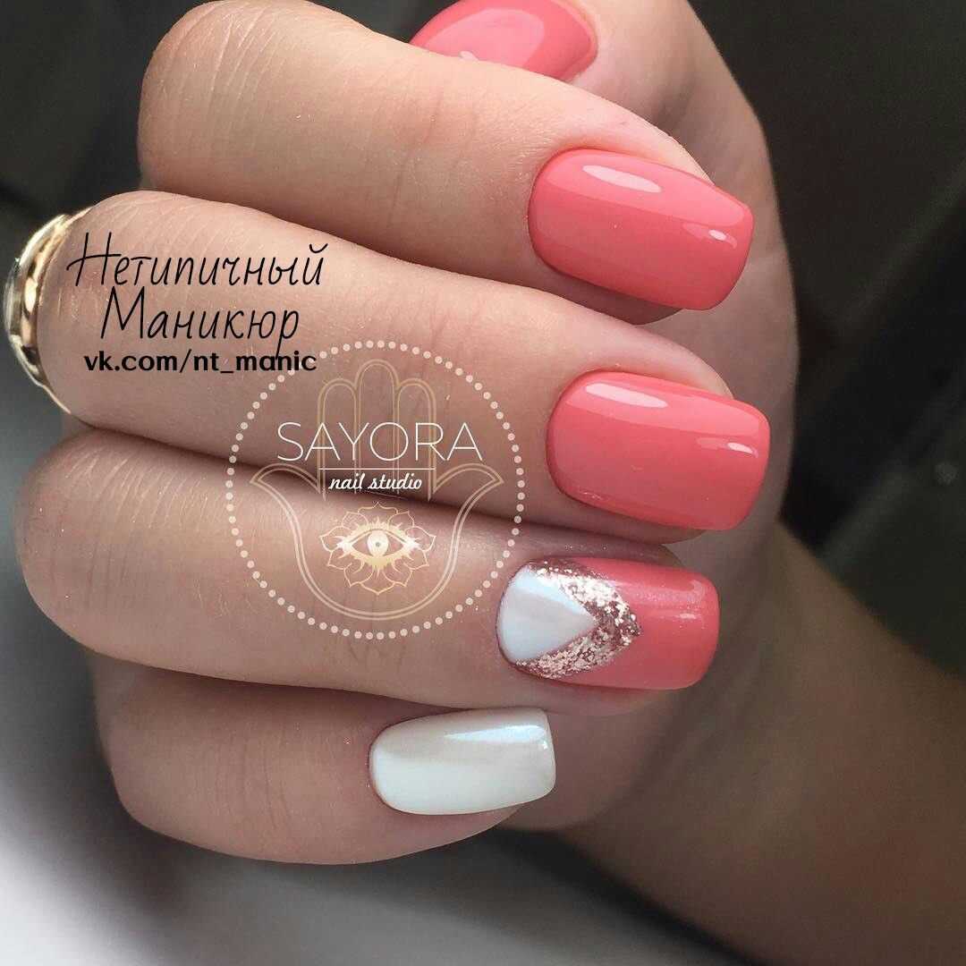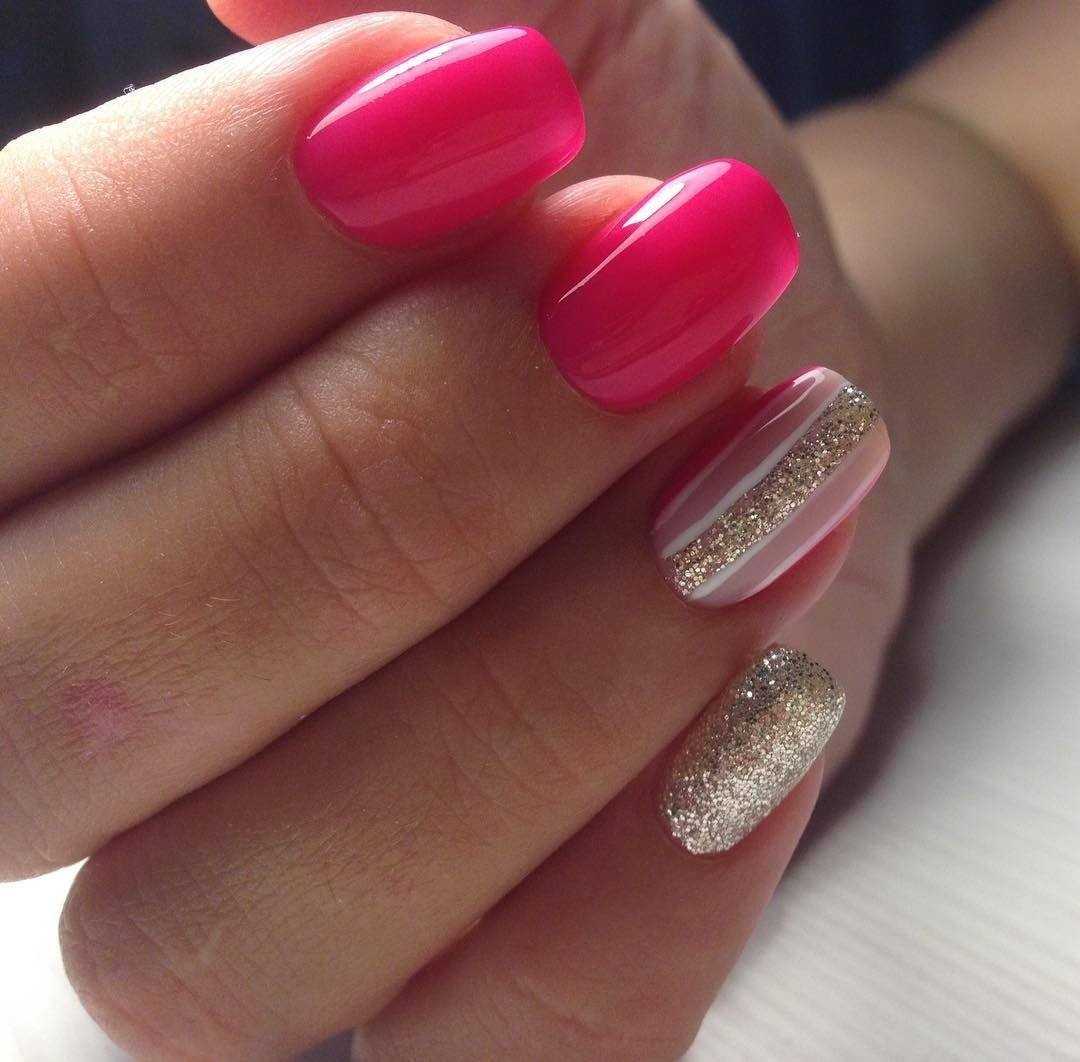 Использование в маникюре насыщенных оттенков совсем не ставит под запрет применение в оформлении блестящей акриловой пудры. Втирка в этом случае не только сглаживает яркость цветов, но и наполняет их лёгким волшебным блеском. Покройте свои ноготки жемчужным или перламутровым материалом. С таким сиянием даже неоновое покрытие будет выглядеть нежно и романтично. Стразы в этом случае гармонично украсят нескольких ногтевых пластин. В большинстве вариаций это россыпь мелких элементов, полоски или разнообразные узоры. Хрустальная крошка, покрывающая полостью один из ноготков, будет смотреться не менее эффектно.