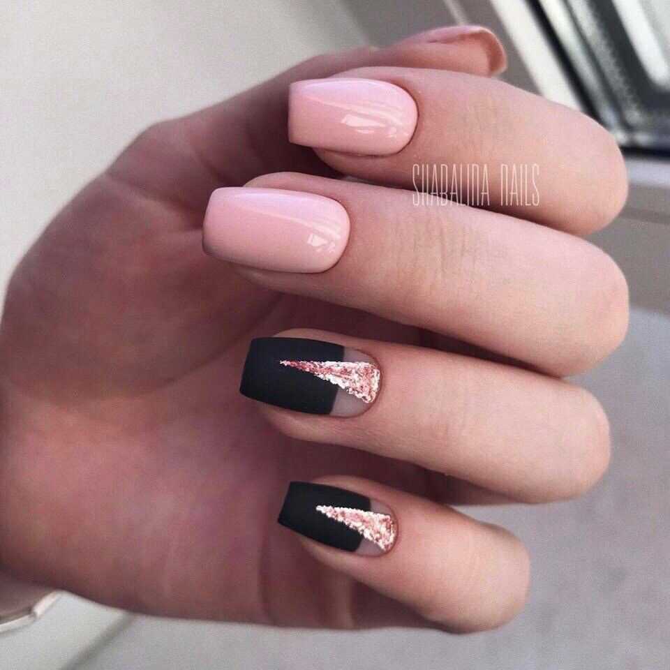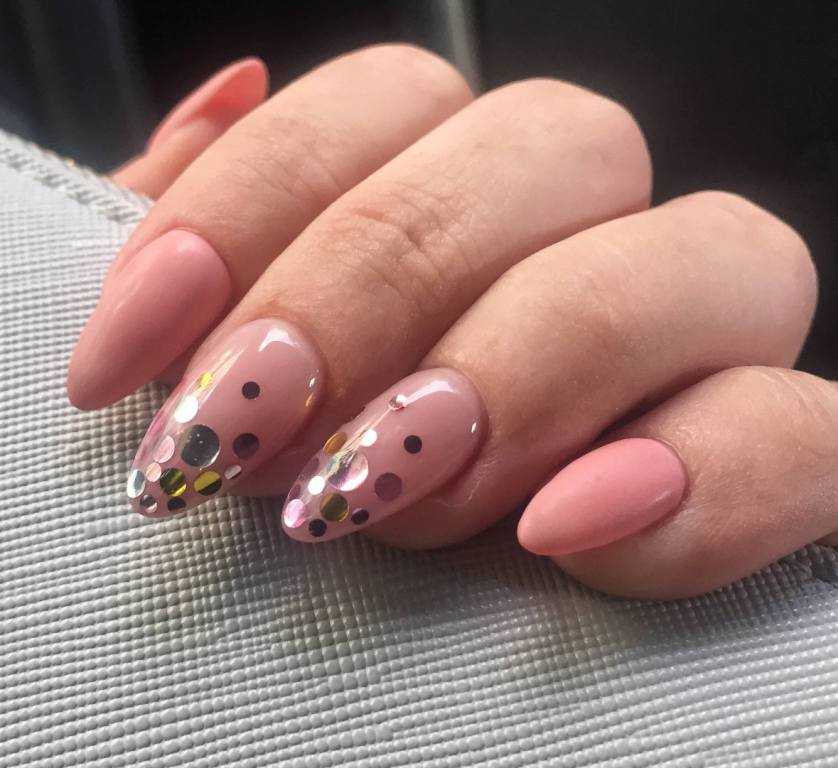 Пайетки отлично смотрятся с матовым розовым покрытием. Для эффектного дизайна достаточно украсить прикорневую зону пайетками и стильный нежный маникюр готов. Работать с пайетками также легко, как и с блестками. Используйте пайетки для создания повседневных и торжественных нейл-артов.