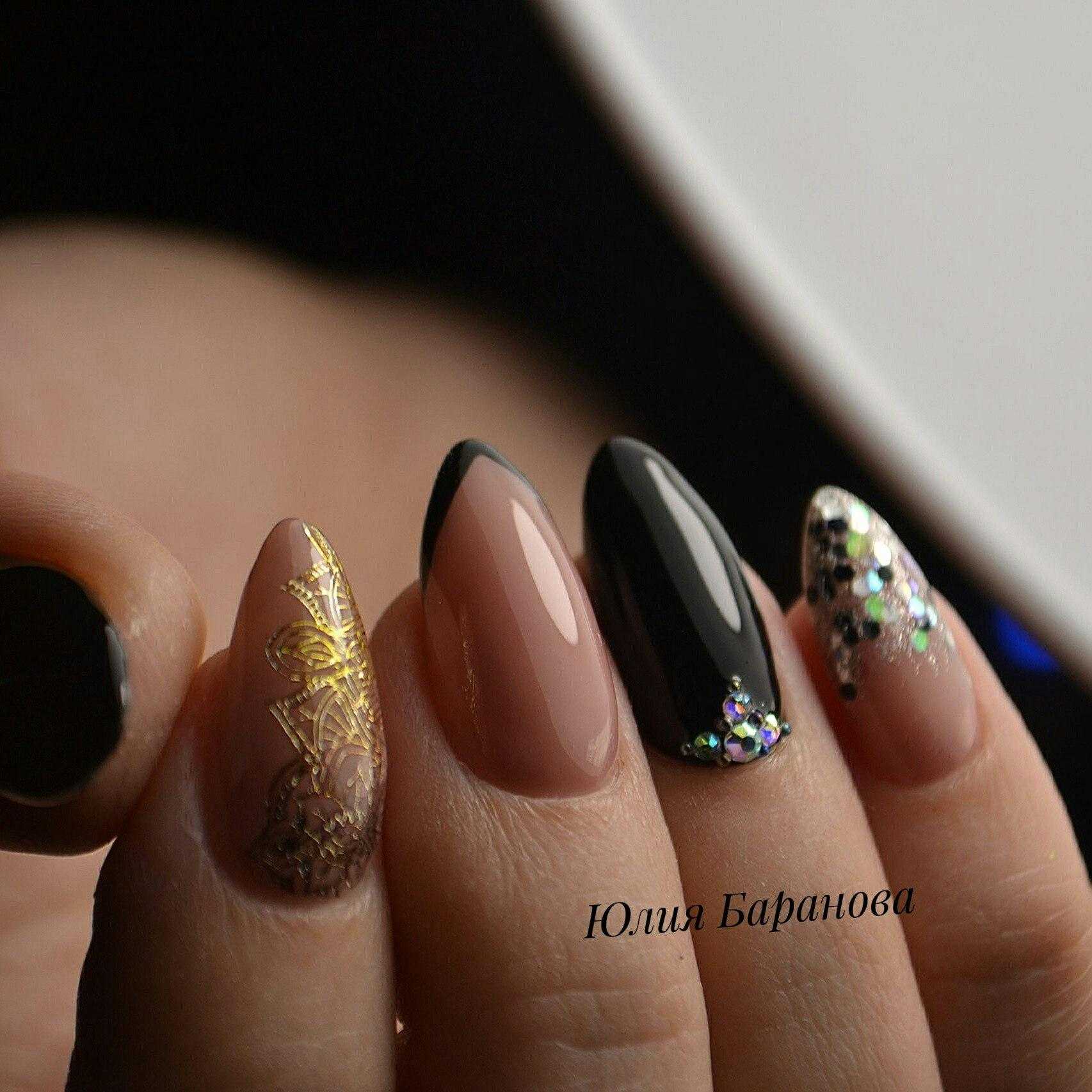 Однотонный черный маникюр без какого-либо декора, несомненно, будет выглядеть банально и пусто. Добавьте к черному цвету серебряные или золотые блестки и дизайн будет выглядеть гораздо эффектнее. Выбирайте для декора мелкий глиттер, втирку, меланж в черном цвете, “сахарок” и другие разновидности блестящего декора. Под дизайн отведите безымянный палец или мизинец. Так маникюр будет выглядеть сбалансировано и сдержанно.