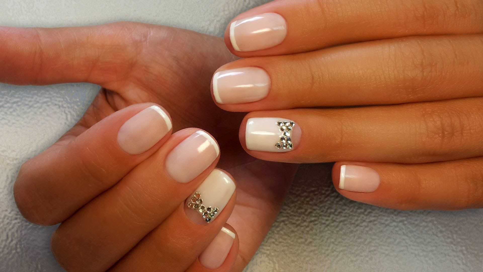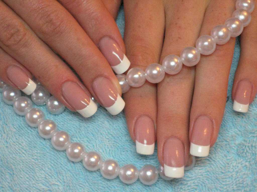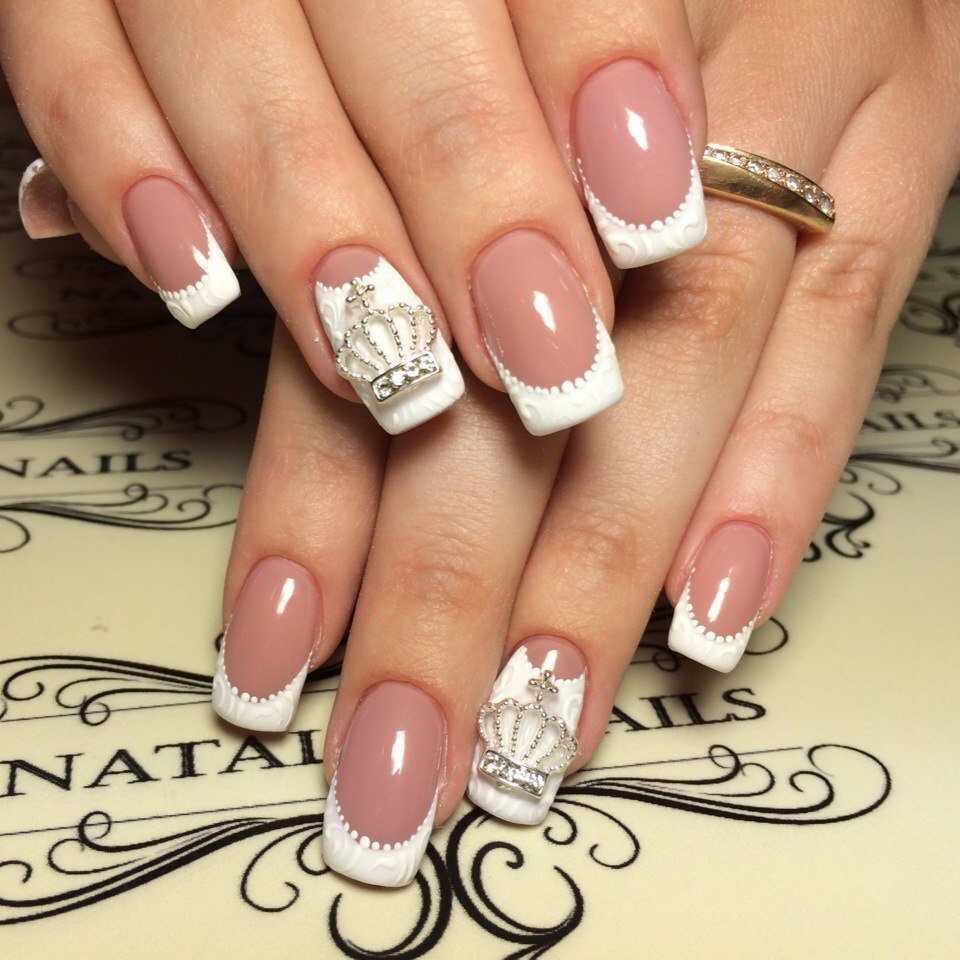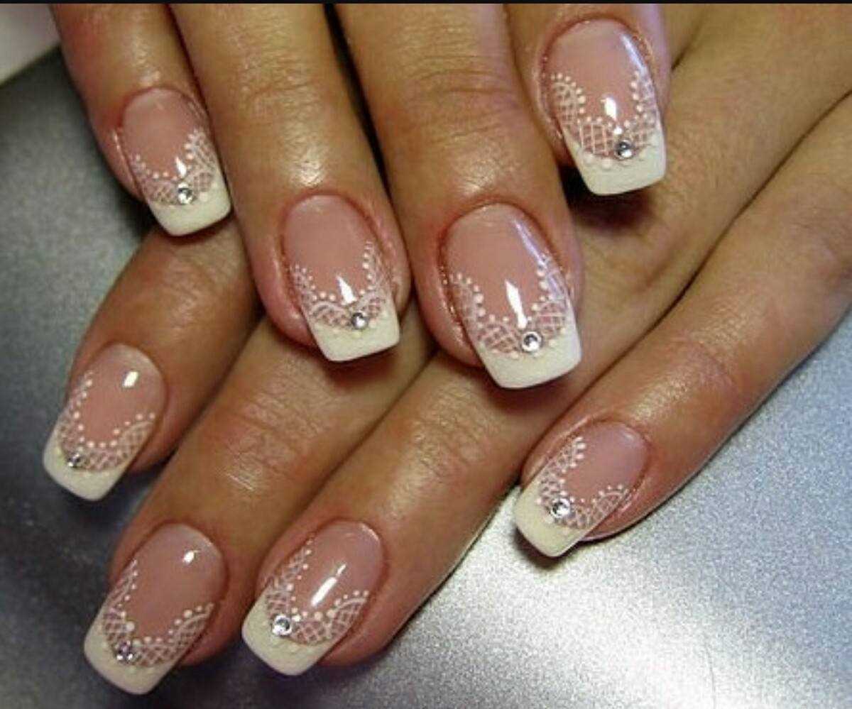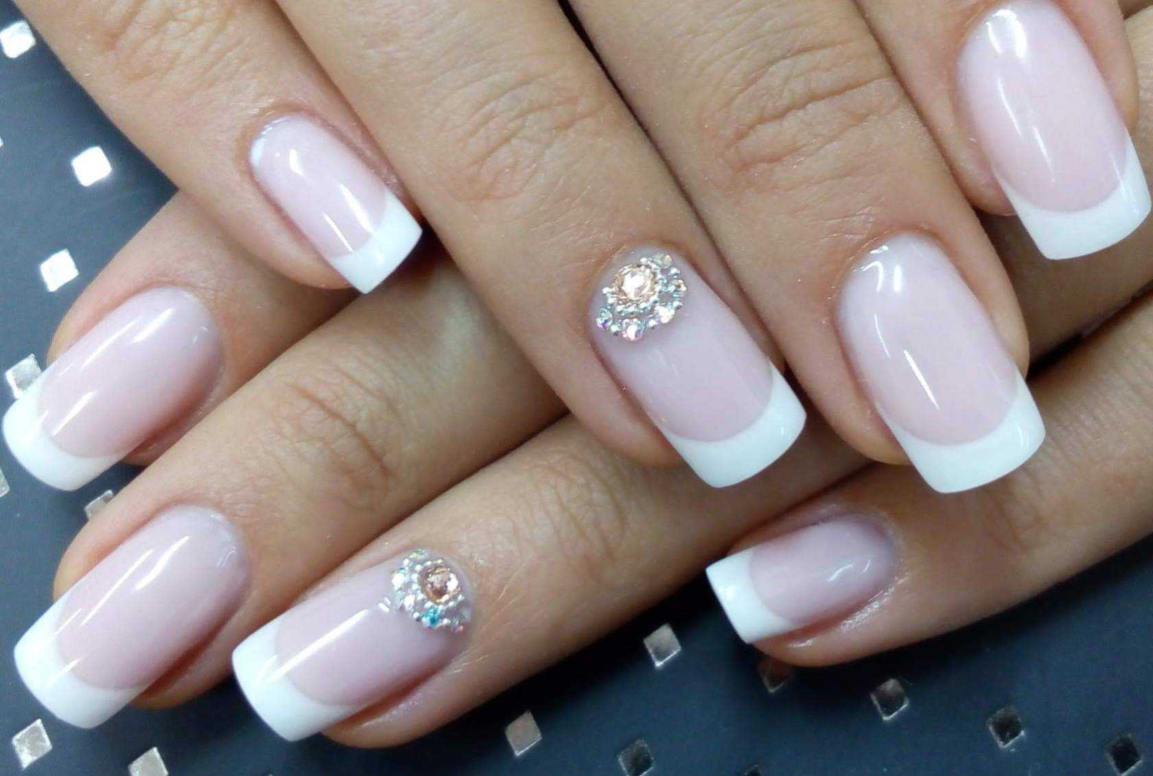 Цветовая гамма французского маникюра как нельзя лучше гармонирует со свадебным платьем невесты.