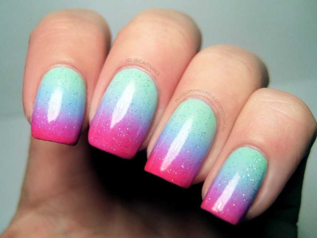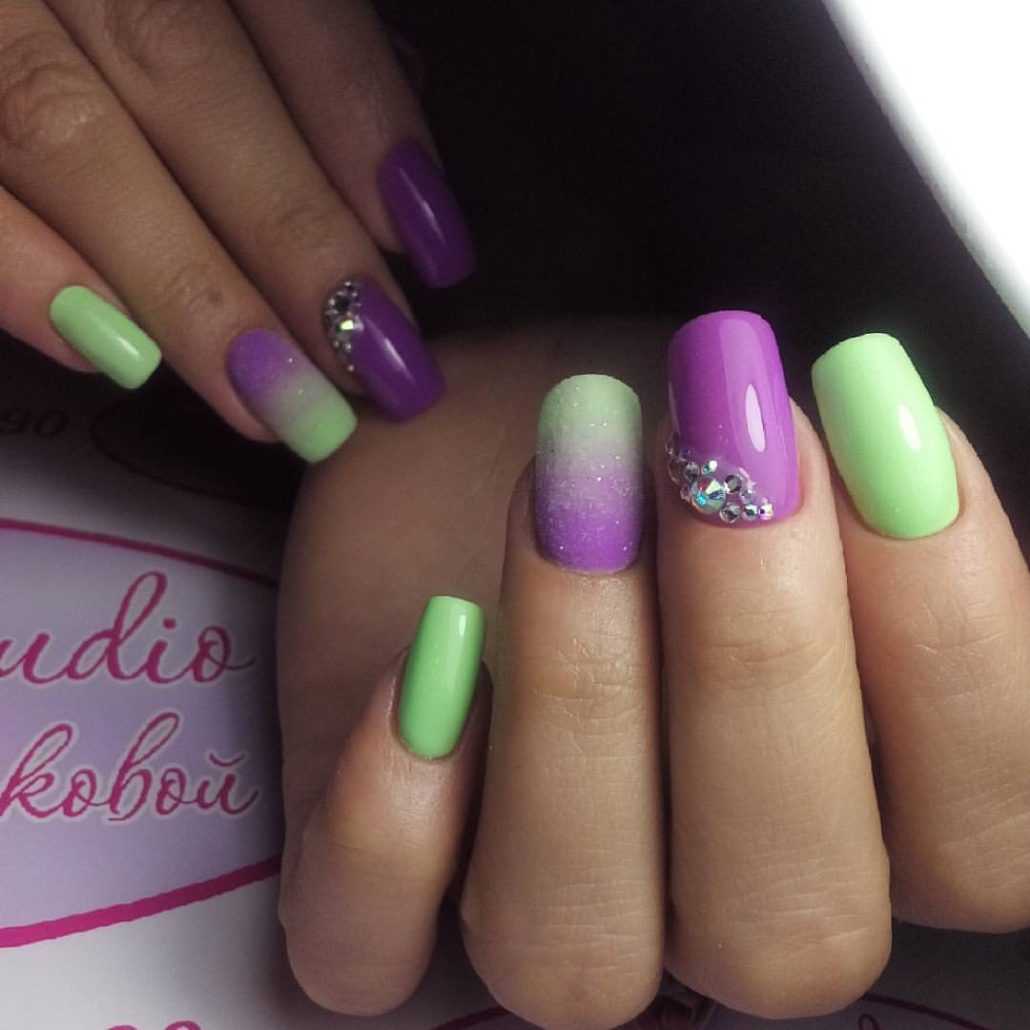 Яркие оттенки можно дополнить блестками или стразами. Популярным остается радужное покрытие, для которого используется не менее 3 разных цветов.