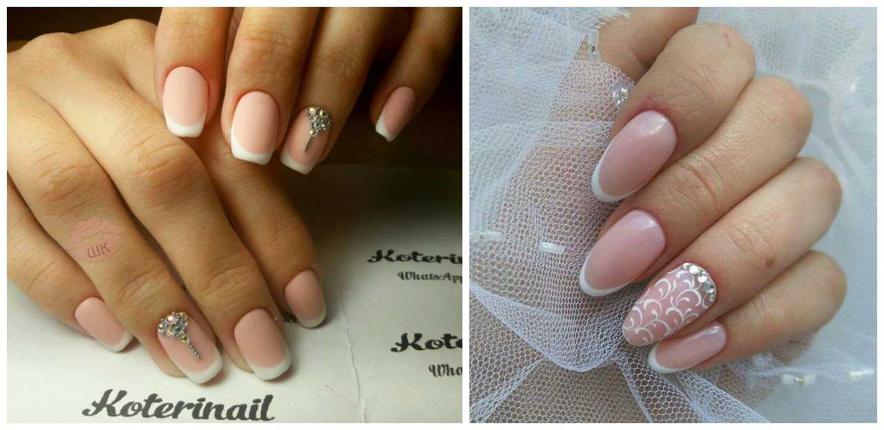 Не обходится французский свадебный маникюр без декора. Украсить можно как все пальчики, так и выбрать 1-2 акцентных ногтя и выполнить на них декор стразами, геометрическими рисунками, абстрактными вензелями.
