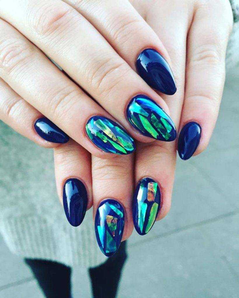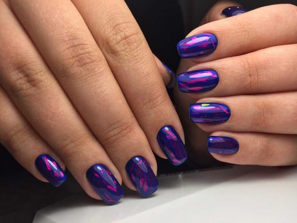При помощи небольших кусочков любой металлизированной фольги создается стильное покрытие. Наносить их можно, как на все ногти сразу, так и выделять ними акцентные ноготки.