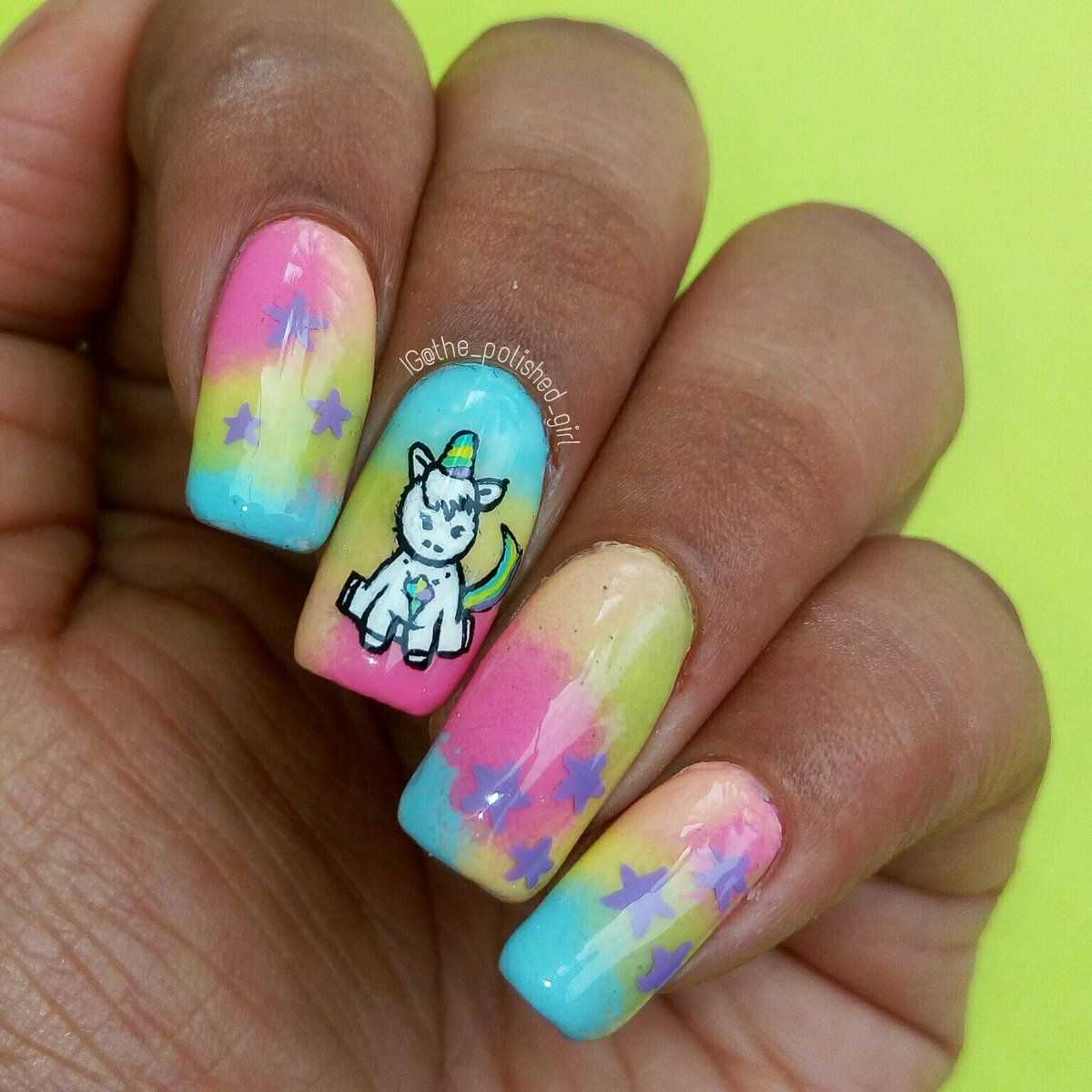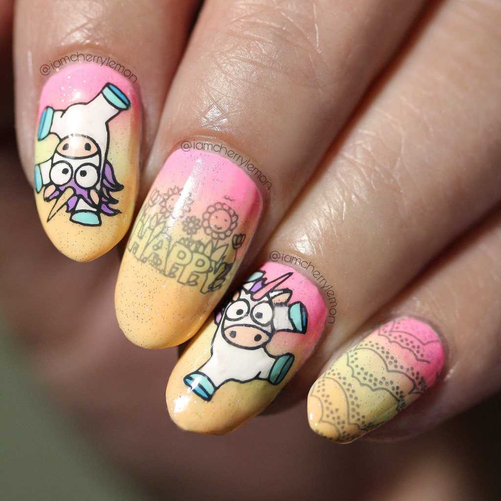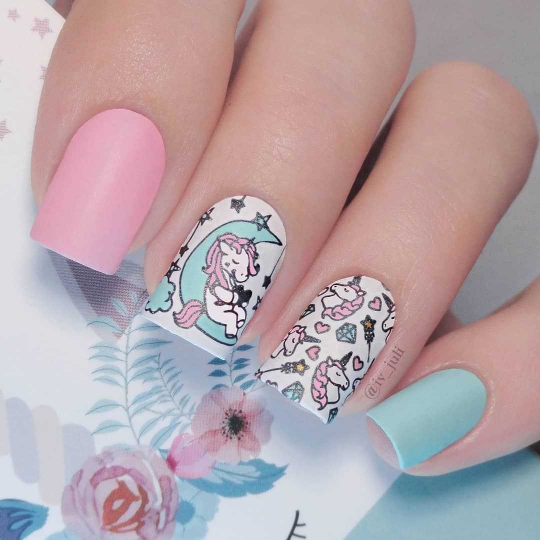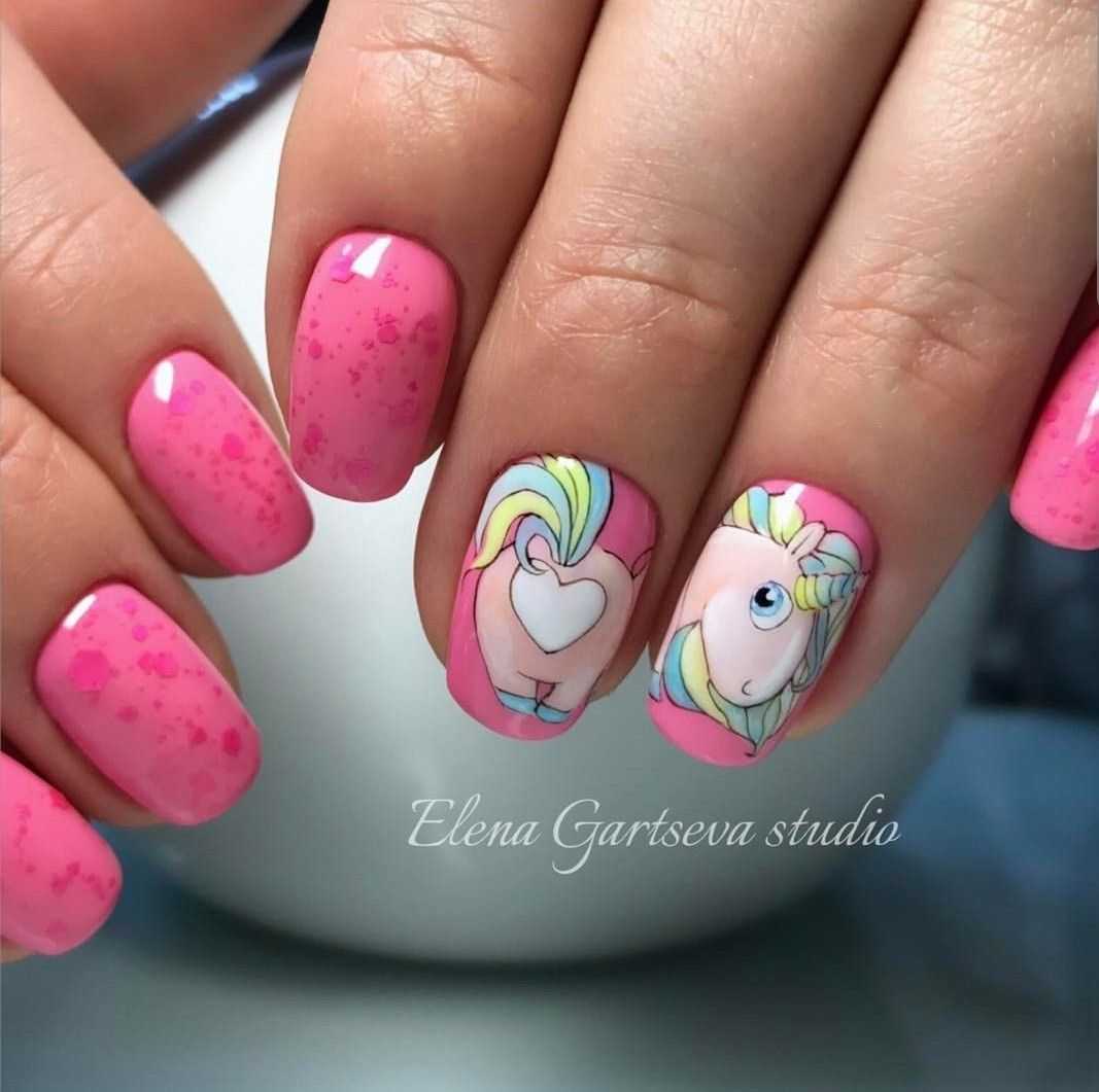 Прекрасный нейл-арт с единорогом на коротких ноготках