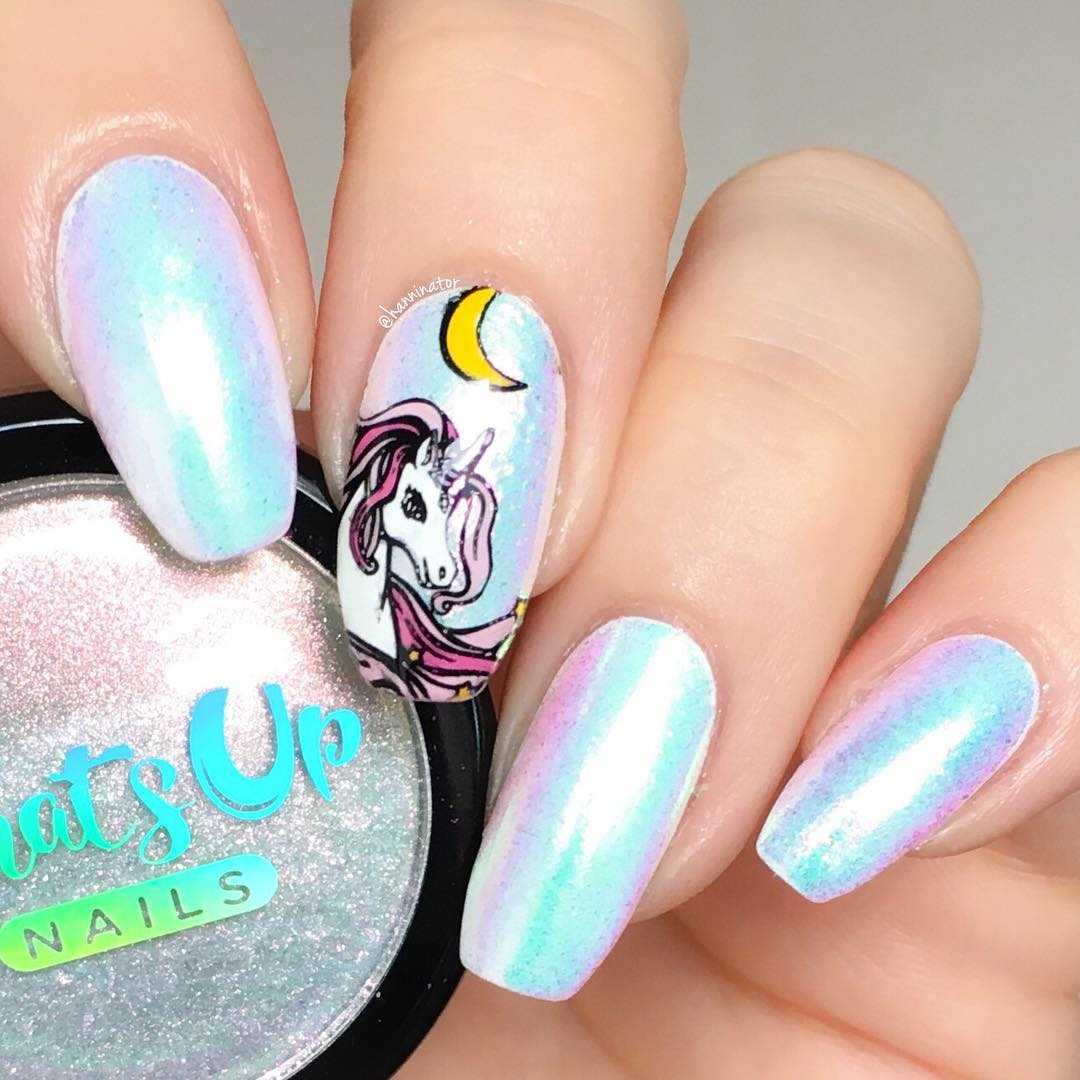 Пигмент для маникюра с единорогом используют нескольких видов: жемчужный перелив, голографическое мерцание, перламутр. Лак для ногтей в качестве базы используют исключительно светлых, нежных оттенков. Тогда маникюр считается выдержанным, с правильной цветовой гаммой.