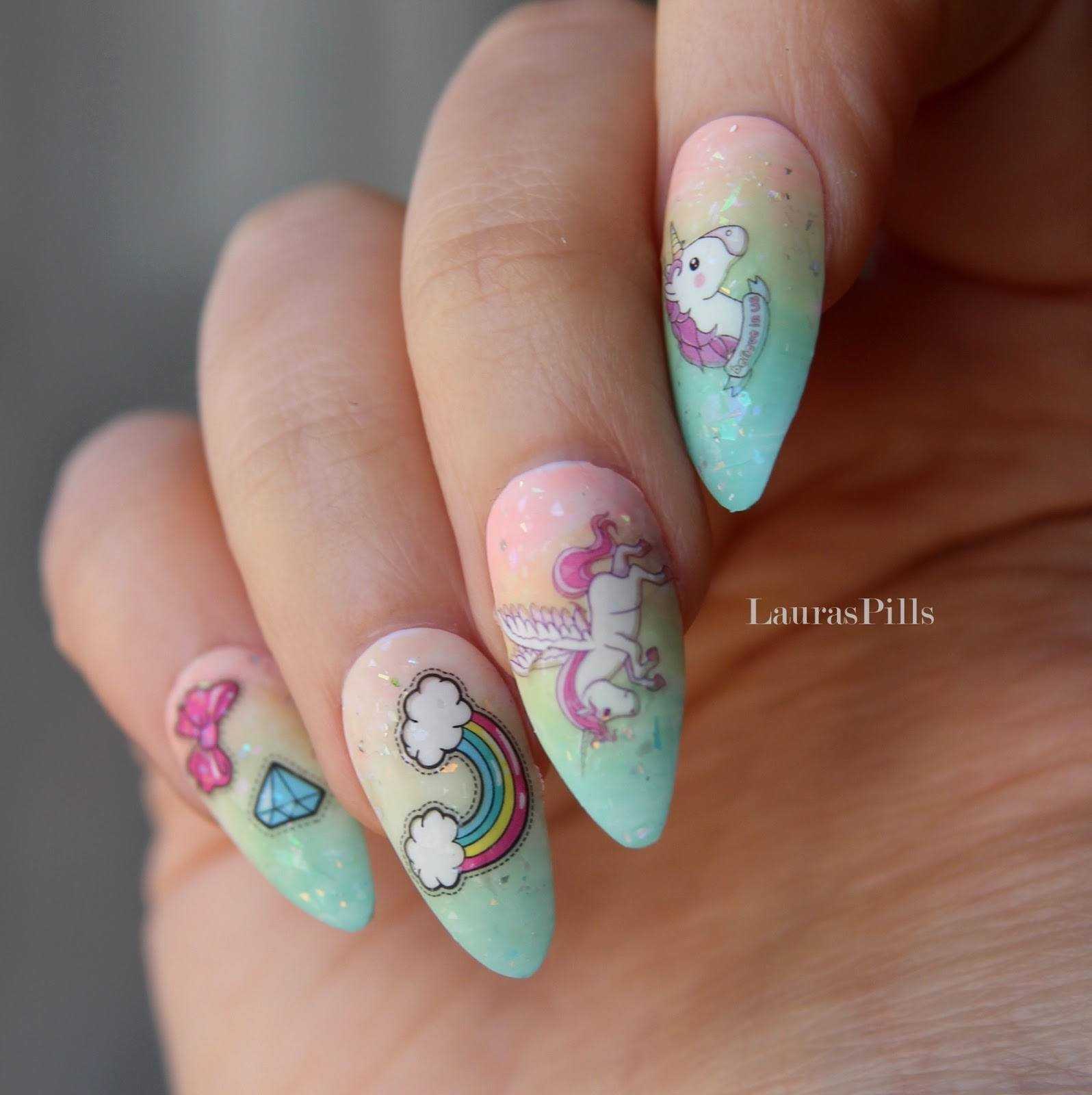 Единорог достаточно крупный рисунок, поэтому разместить его на коротких ногтях бывает сложно. Есть несколько вариантов решения проблемы: