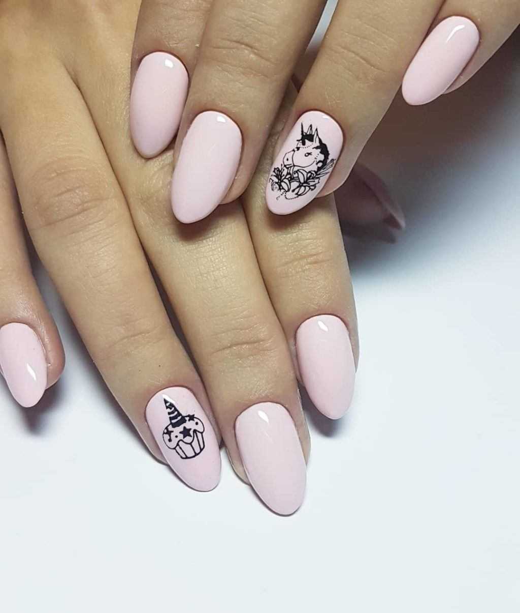 Те женщины, которые предпочитают в своем образе минималистичность, могут обратится к однотонному маникюру. Причем подобное оформление можно выполнить даже самостоятельно. В таком случае единорог может выступать обычной наклейкой.