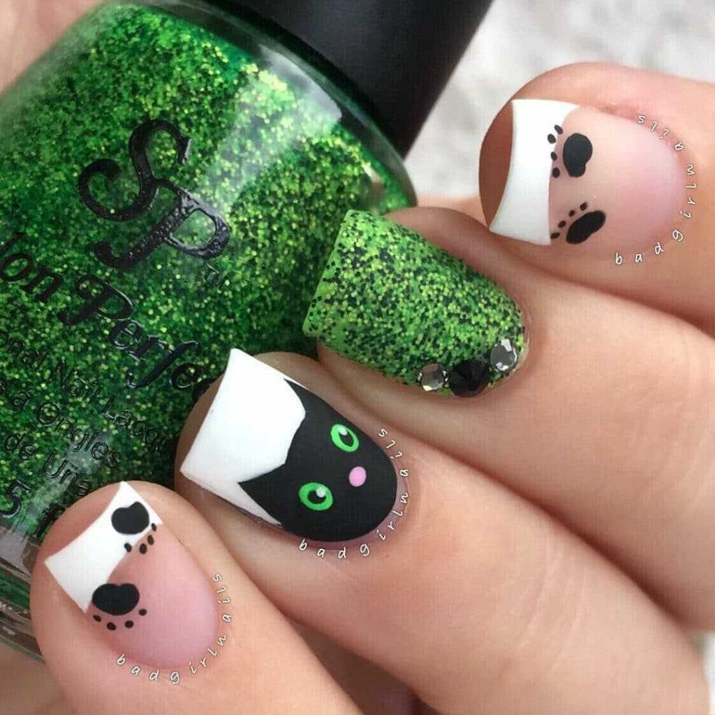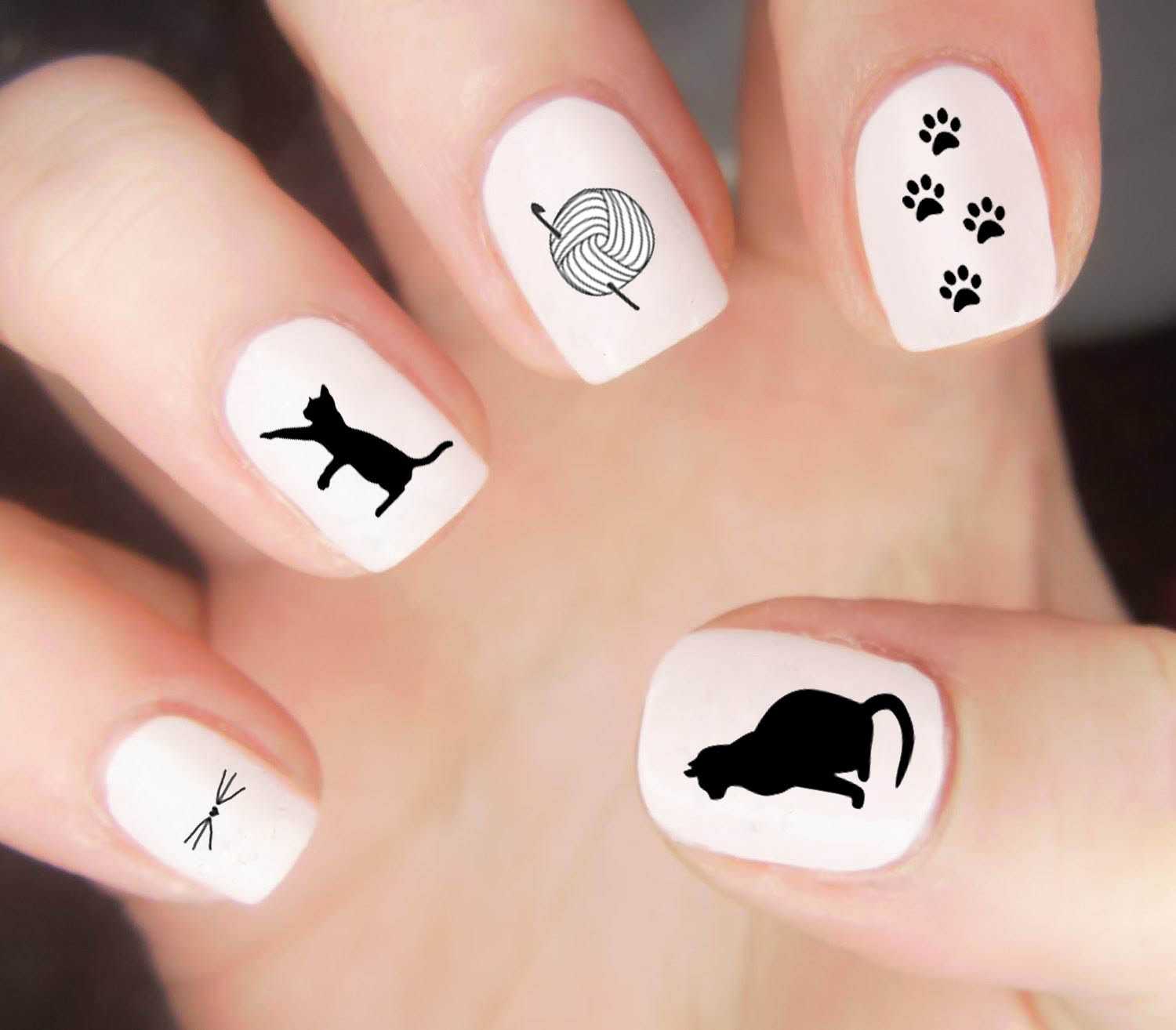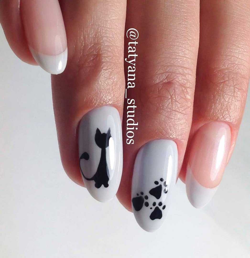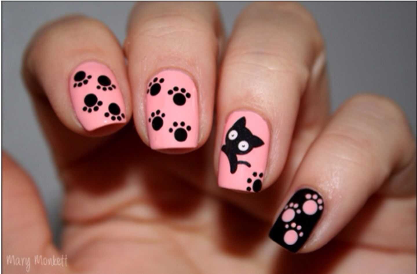 Короткие ноготки не повод отказываться от стильного дизайна с кошками. Чтобы маникюр получился выразительным внесите в него некоторые изменения. Вместо кошки изобразите на ногтях лапки, мордочки или силуэты.