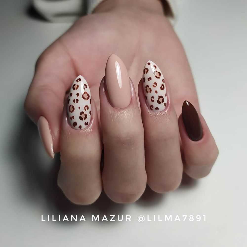 Конечно, классический маникюр с леопардовым принтом и покрытием всех пальцев хорошо смотрится на любых ногтях овальной формы. Но для такой формы интересным вариантом будет сочетание френча и леопардового принта на одном пальце.