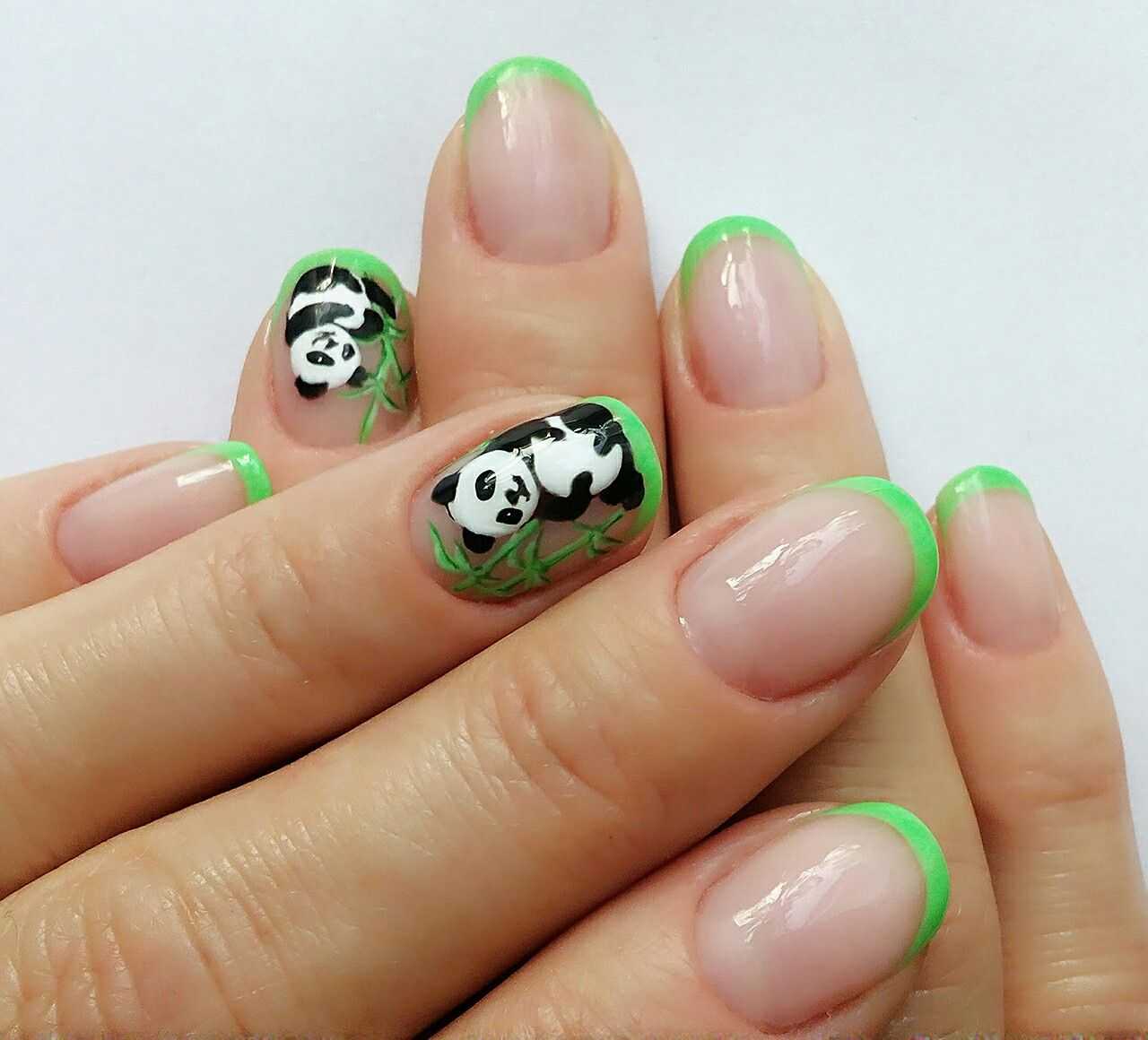 Классика френча настолько уникальна, что позволяет барышням дополнять маникюр разнообразными рисунками и декором на любой вкус. Панды в нашем случае, являются симпатичным дополнением линии улыбки, которая может как оформляться в виде забавной мордашки, так и просто украшаться отпечатками лапок пушистого медведя. В последнем примере, на одном из акцентных ноготков актуально нарисовать портретный рисунок панды, который станет фигурирующим в оформлении дизайна. Линия улыбки во французском маникюре с подобным персонажем может оставаться классического белого цвета или наоборот, прорисовываться контрастным чёрным. Любой из приведённых примеров смотрится очень симпатично.