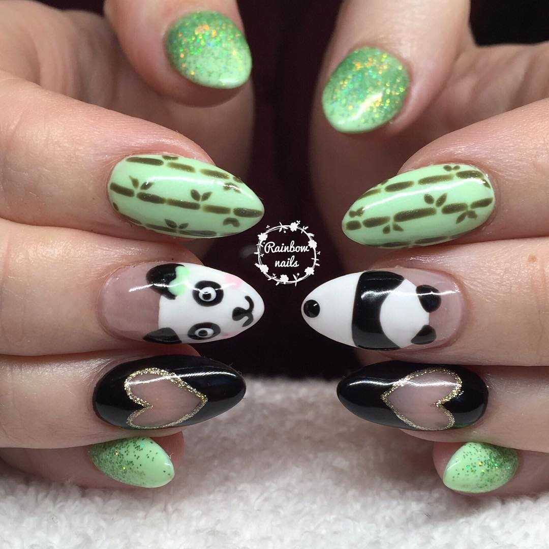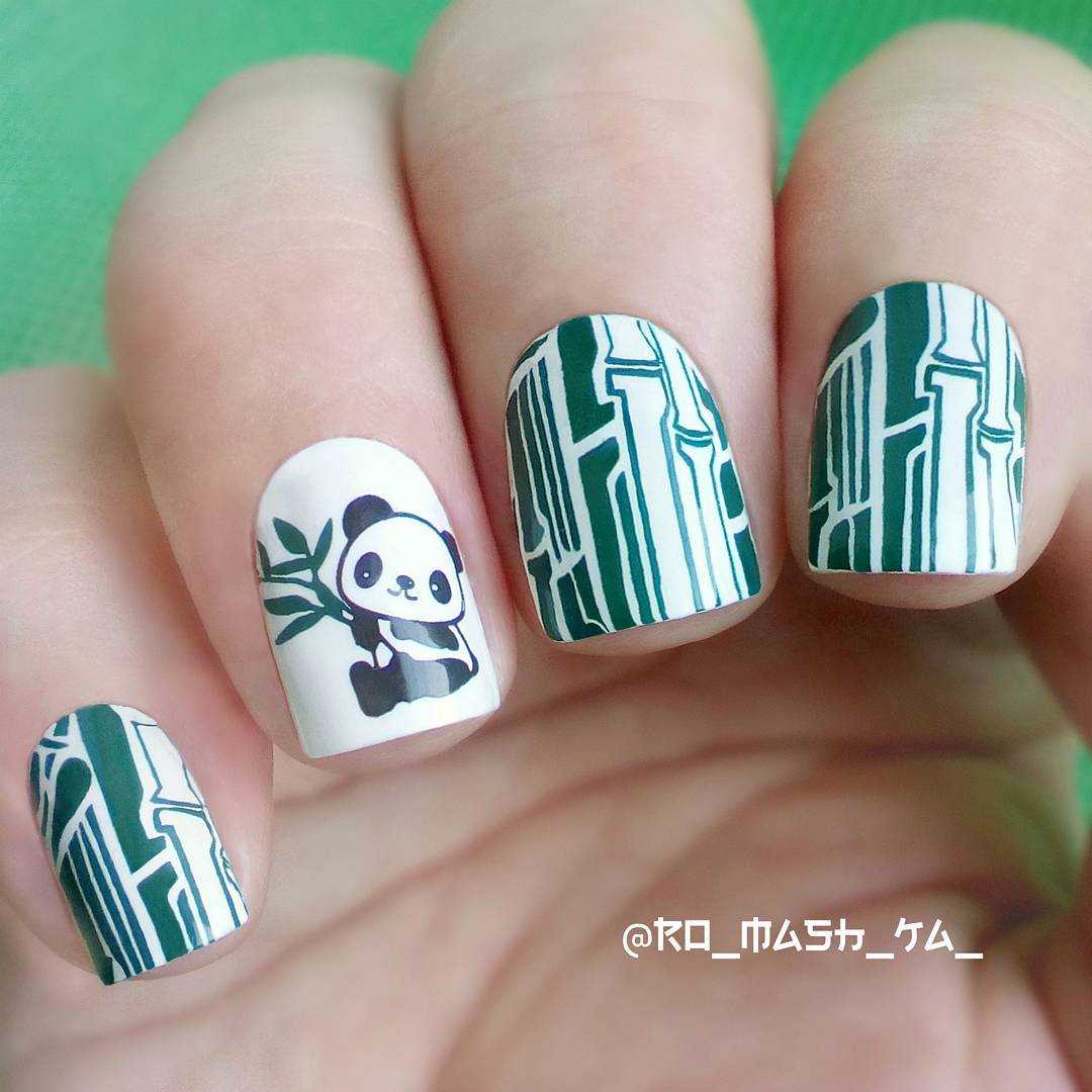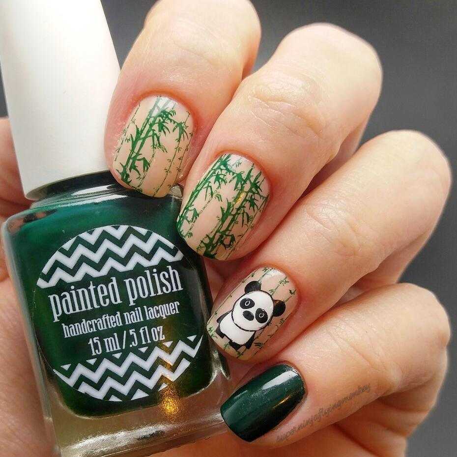 Шикарно смотрится маникюр, где изображение бамбука выполнено на слайдерах. Такой узор смотрится объемно и ярко. На слайдер можно нанести изображение панды с помощью стемпинга или ручной росписи.