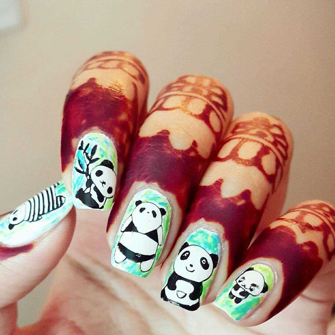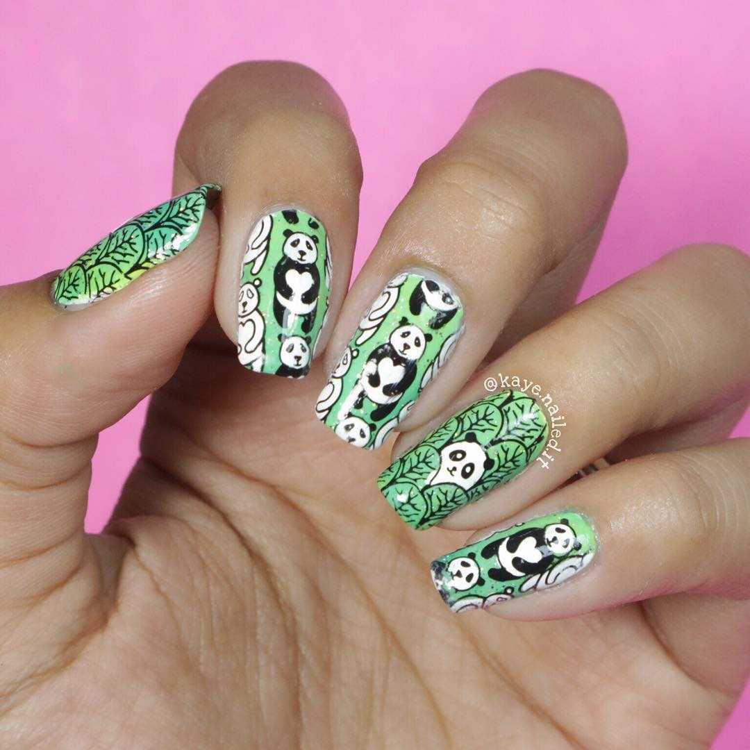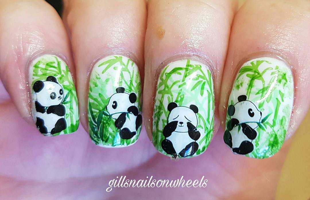 Шикарно смотрится маникюр, где изображение бамбука выполнено на слайдерах. Такой узор смотрится объемно и ярко. На слайдер можно нанести изображение панды с помощью стемпинга или ручной росписи.
