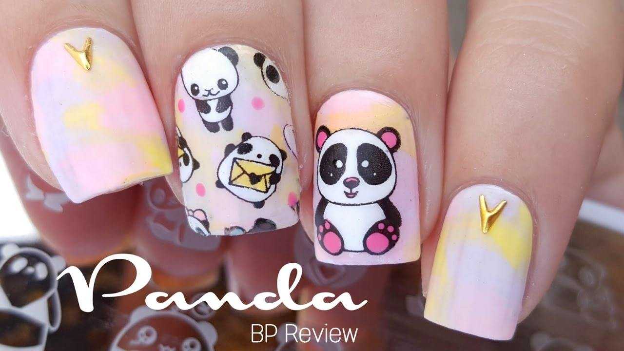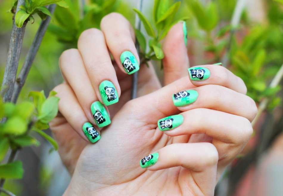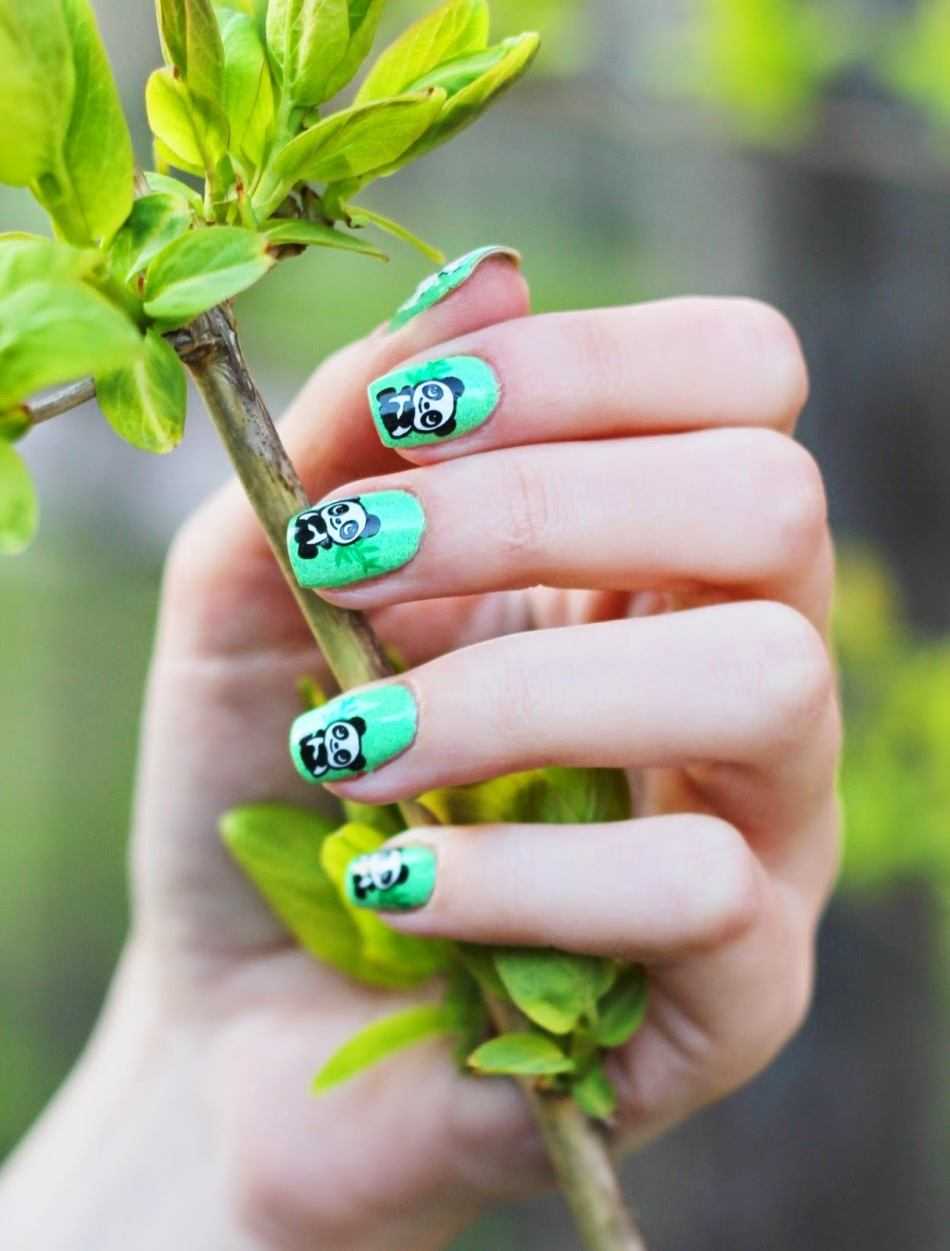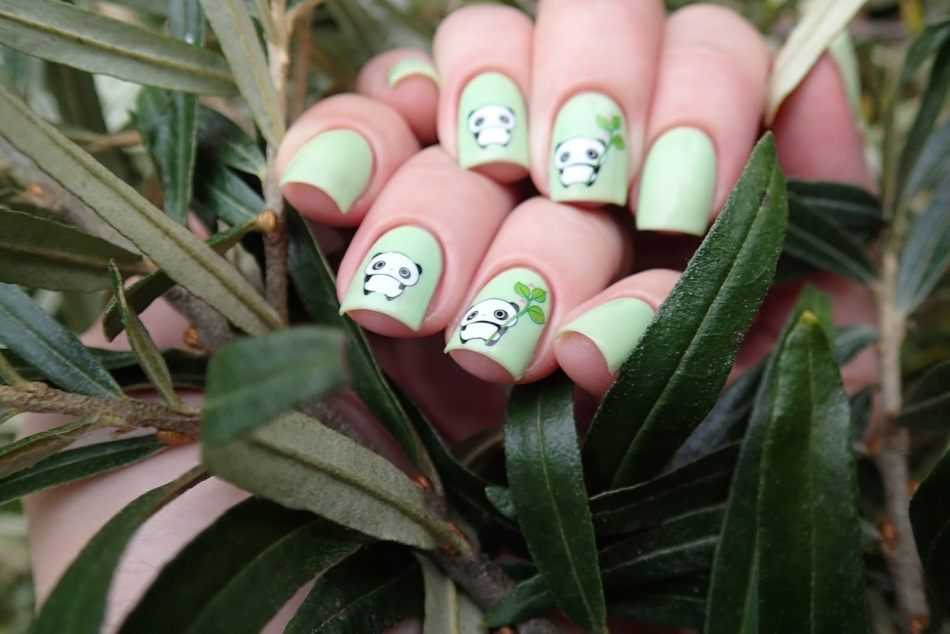 Рисунки можно наносить на прозрачное основание или подбирать оттенок, который будет подчёркивать все детали, например, сиреневый, розовый, серый, фисташковый, оранжевый, зелёный или бежевый. Для прорисовки листиков бамбука, любимого лакомства этих милых созданий, отдайте предпочтение нежно-зелёному или изумрудному оттенку, а в остальном, полагайтесь на свою фантазию. Главная задача не переусердствовать с яркими покрытиями.