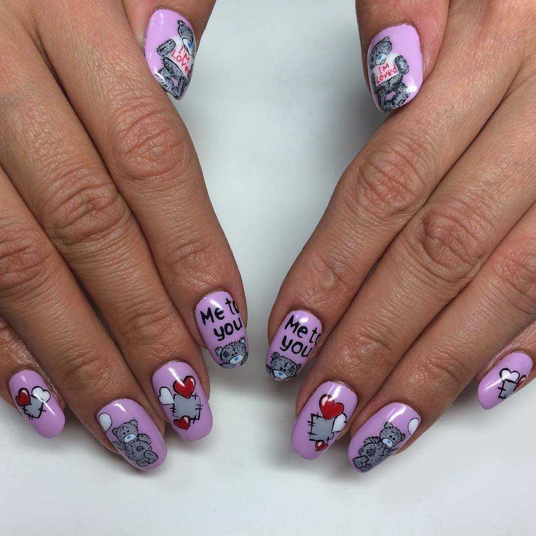 Весьма необычный рисунок на ноготках в виде мишки Тедди или Микки Мауса все чаще находит отклик в сердцах современных модниц. Всем знакомы эти персонажи с самого детства и практически каждая мечтала в детстве о такой игрушке. Что ж, времена идут и теперь такие рисунки все чаще появляются на ноготках в сочетании с романтичными сердечками. Выглядит это всего особенно мило.