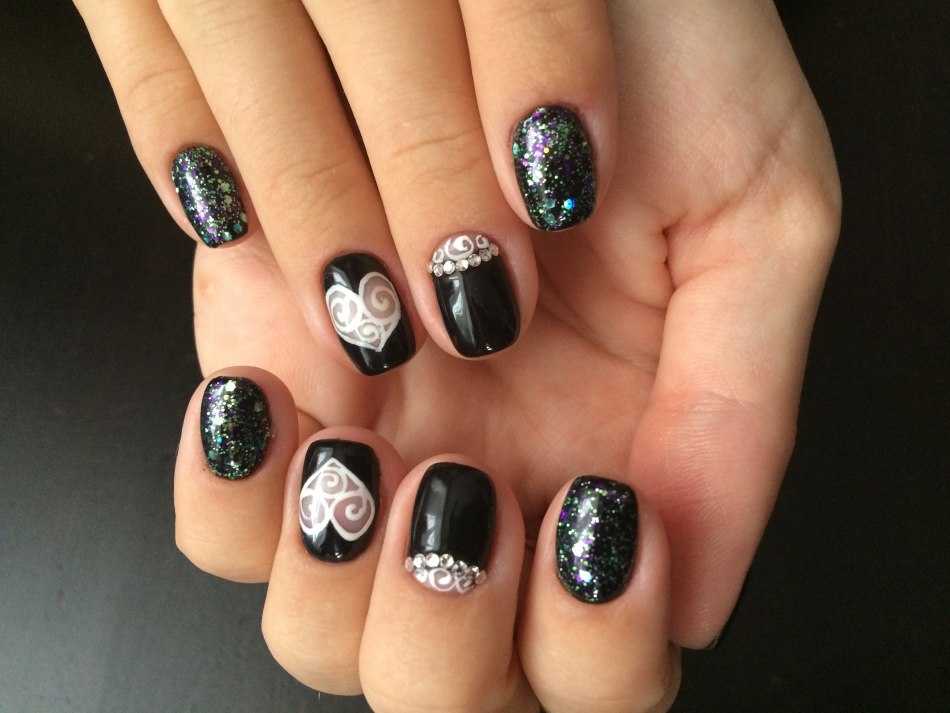 Сделать маникюр в черном цвете решится далеко не каждая девушка. Несмотря на то, что смотрится он очень красиво, многие до сих пор считают его слишком мрачным. Но тем не менее, если дополнить такой дизайн рисунком или декором в виде сердца, то смотреться он будет совершенно по-другому. К тому же, можно добавить и другие цветные акценты.