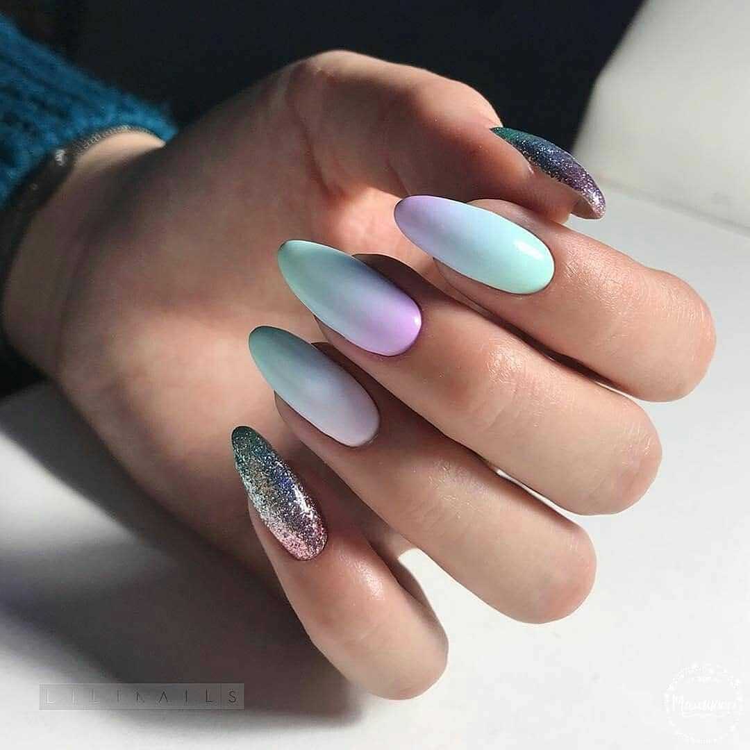 Еще одним весенним трендом в новом сезоне станет использование всевозможных блесток. Блестящий пигмент ассоциируется с праздником, но при правильном использовании такой маникюр может быть повседневным и будничным. Мелкий шиммер лишь слегка разнообразит образ. Дизайнеры предлагают не ограничивать себя и использовать блестки любого цвета и размера по желанию.
