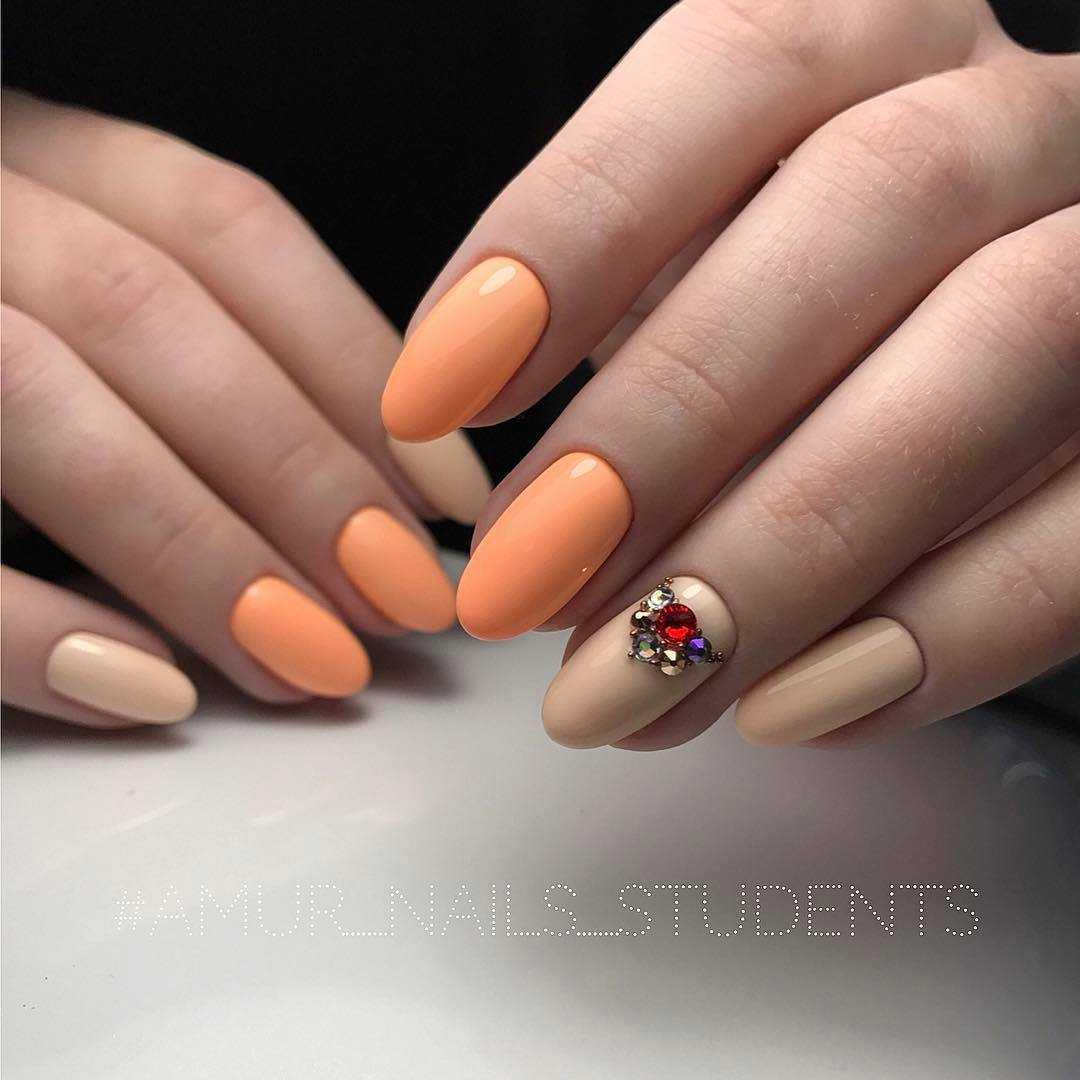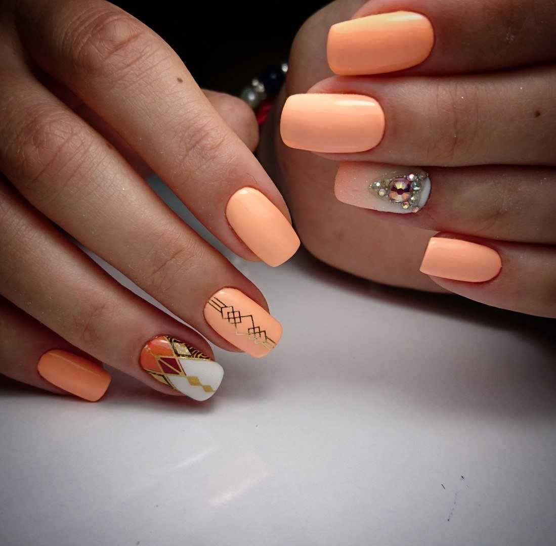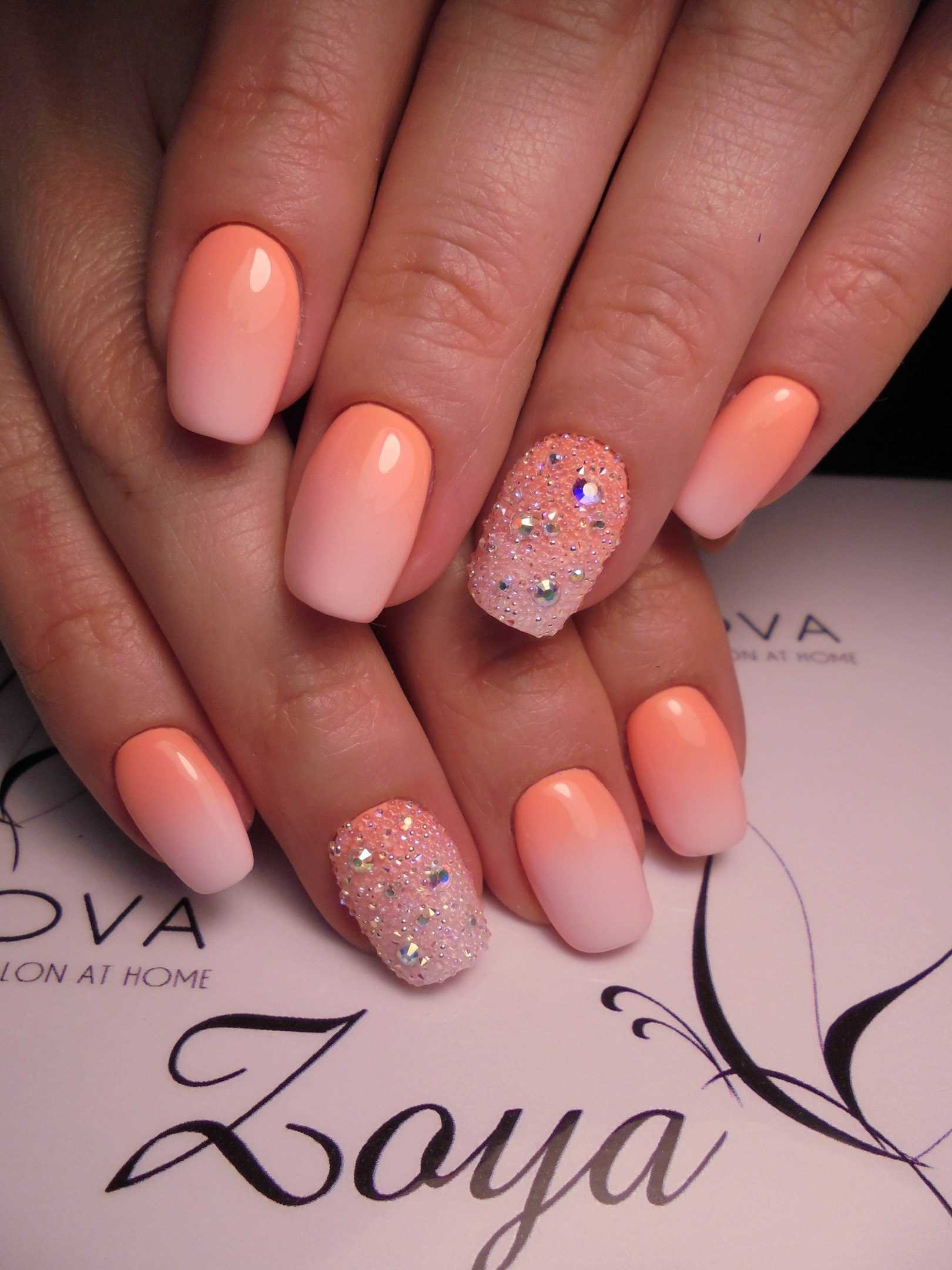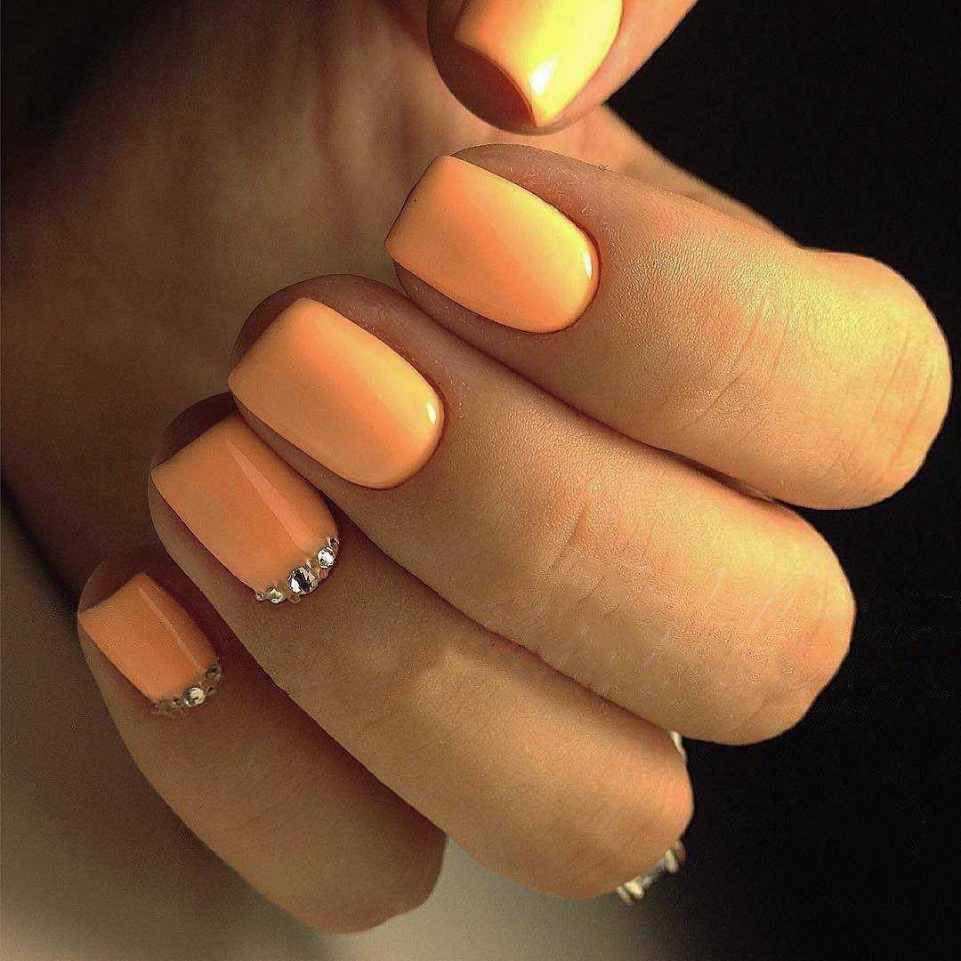 Для создания стильного однотонного нейл-дизайна можно использовать как один из приглянувшихся вам оттенков, так и отдать предпочтение одновременно нескольким тонам. Весьма оригинально в этом случае смотрится нанесение покрытий в стиле градиент, когда переход оттенков выполняется от ноготка к ноготку. Стразами в однотонном маникюре можно украсить область ногтевых пластин в прикорневой зоне, создать на нескольких ноготкам симпатичные узоры или выделить полностью безымянный пальчик россыпью мелких сверкающих камней. Любой из примеров расположение декора на персиковом фоне будет смотреться очень красиво.