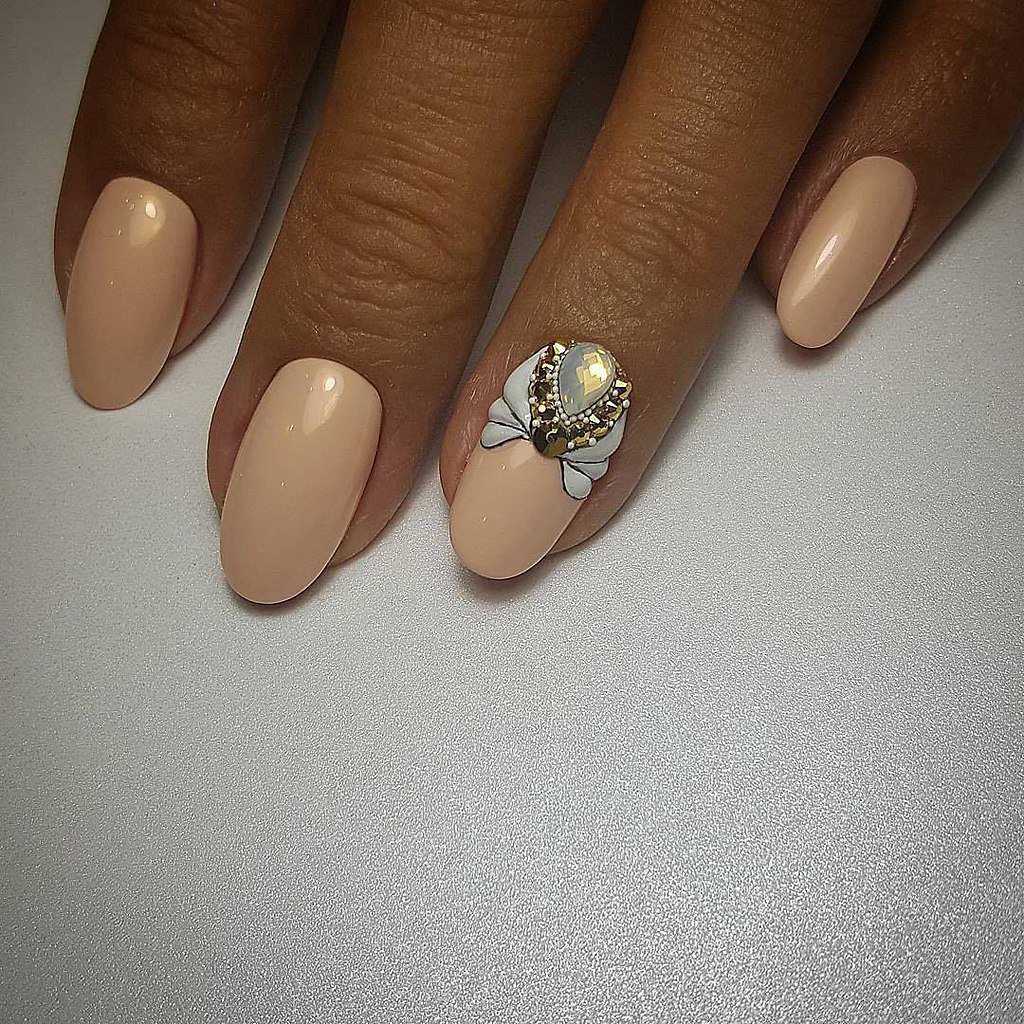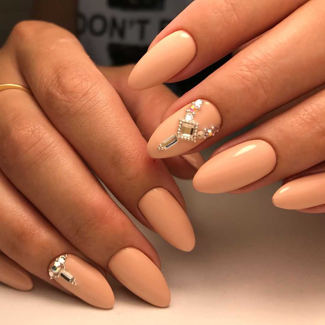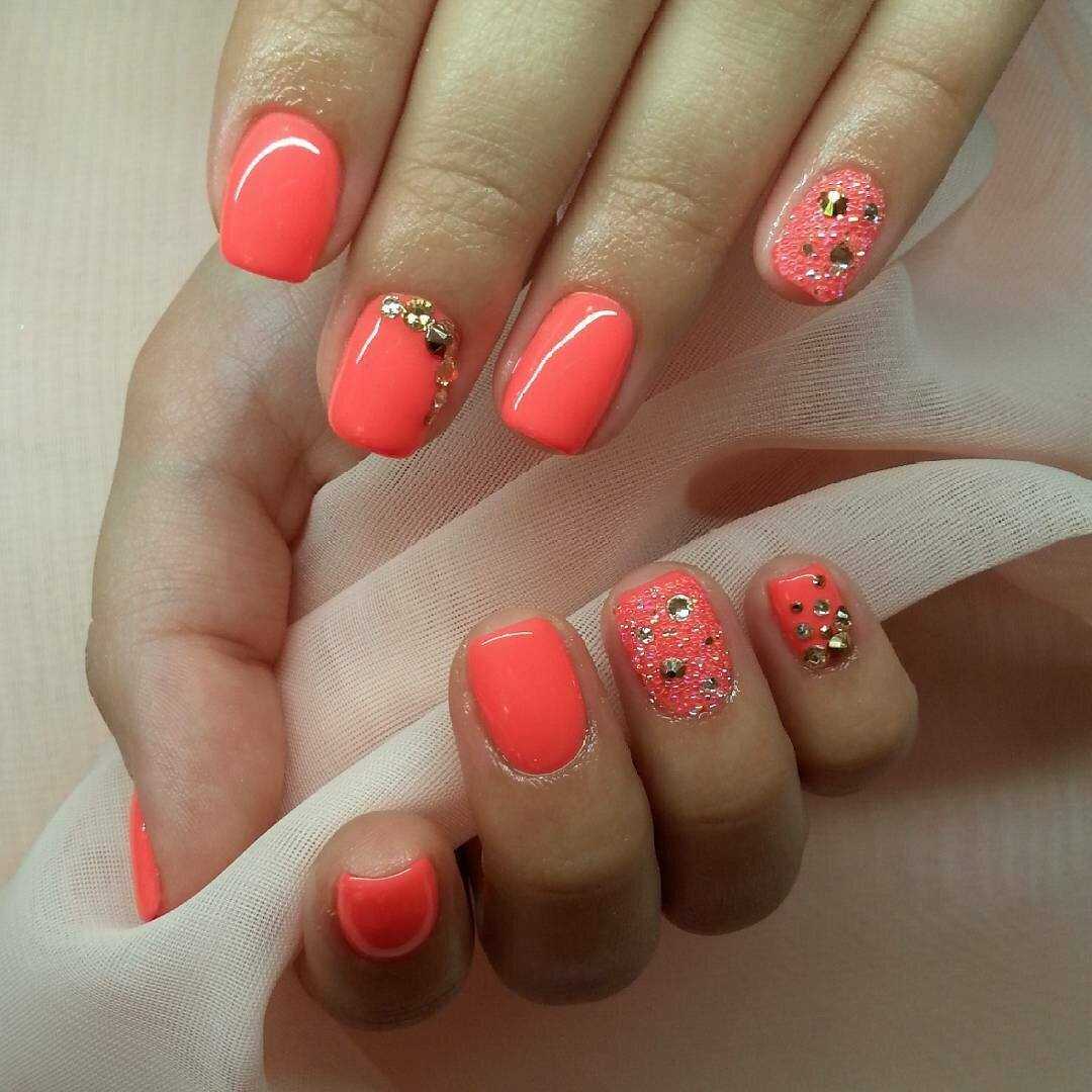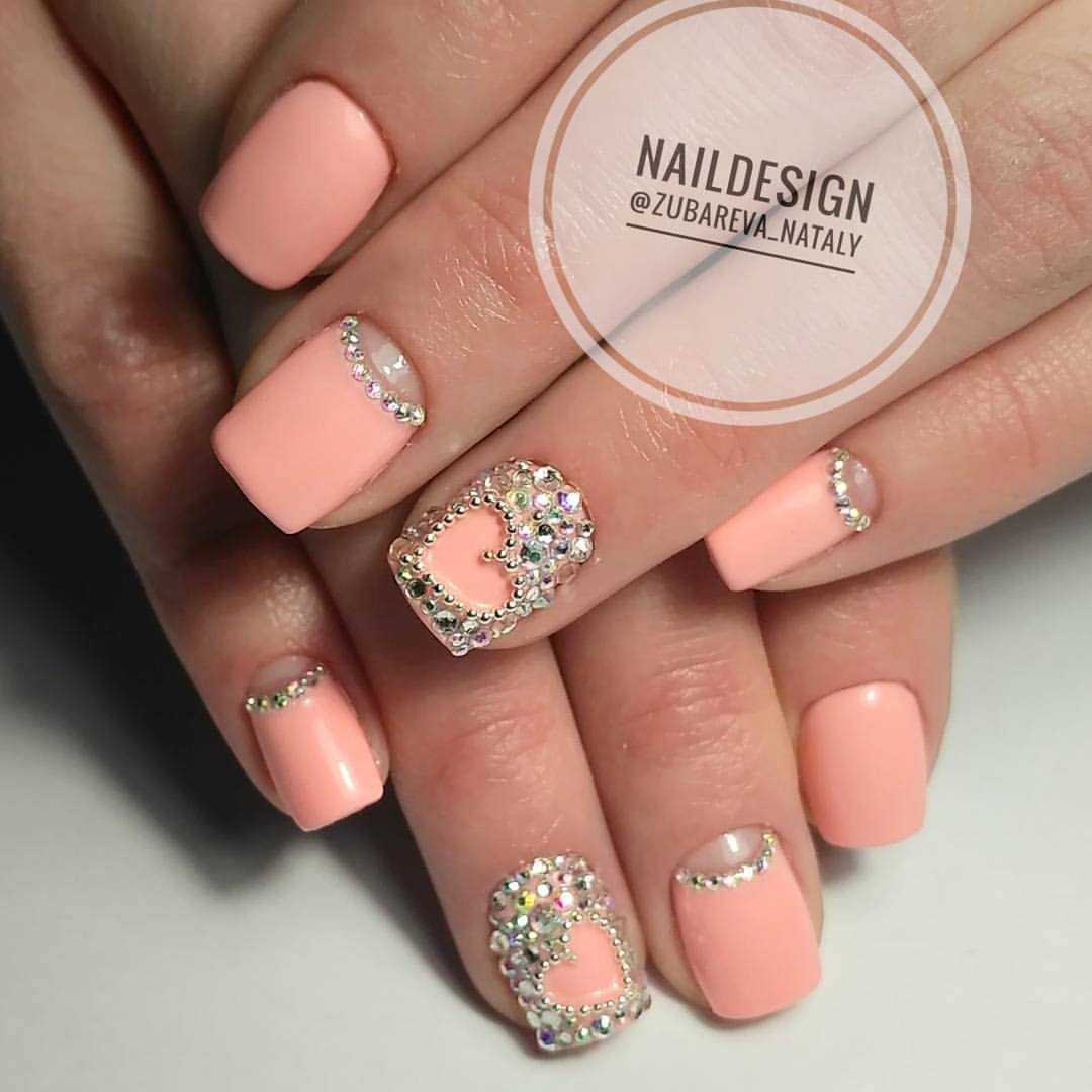 Для создания стильного однотонного нейл-дизайна можно использовать как один из приглянувшихся вам оттенков, так и отдать предпочтение одновременно нескольким тонам. Весьма оригинально в этом случае смотрится нанесение покрытий в стиле градиент, когда переход оттенков выполняется от ноготка к ноготку. Стразами в однотонном маникюре можно украсить область ногтевых пластин в прикорневой зоне, создать на нескольких ноготкам симпатичные узоры или выделить полностью безымянный пальчик россыпью мелких сверкающих камней. Любой из примеров расположение декора на персиковом фоне будет смотреться очень красиво.