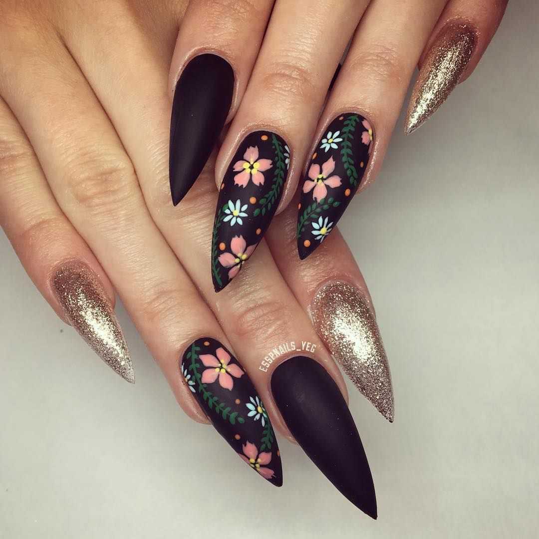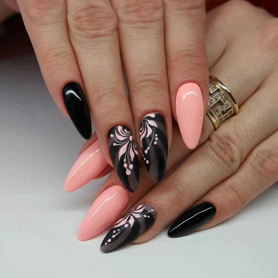 Градиентный маникюр часто используют в качестве фона для последующего декорирования. Например, стильно выглядит дизайн с черными веточками и листьями на ярком градиентном фоне.