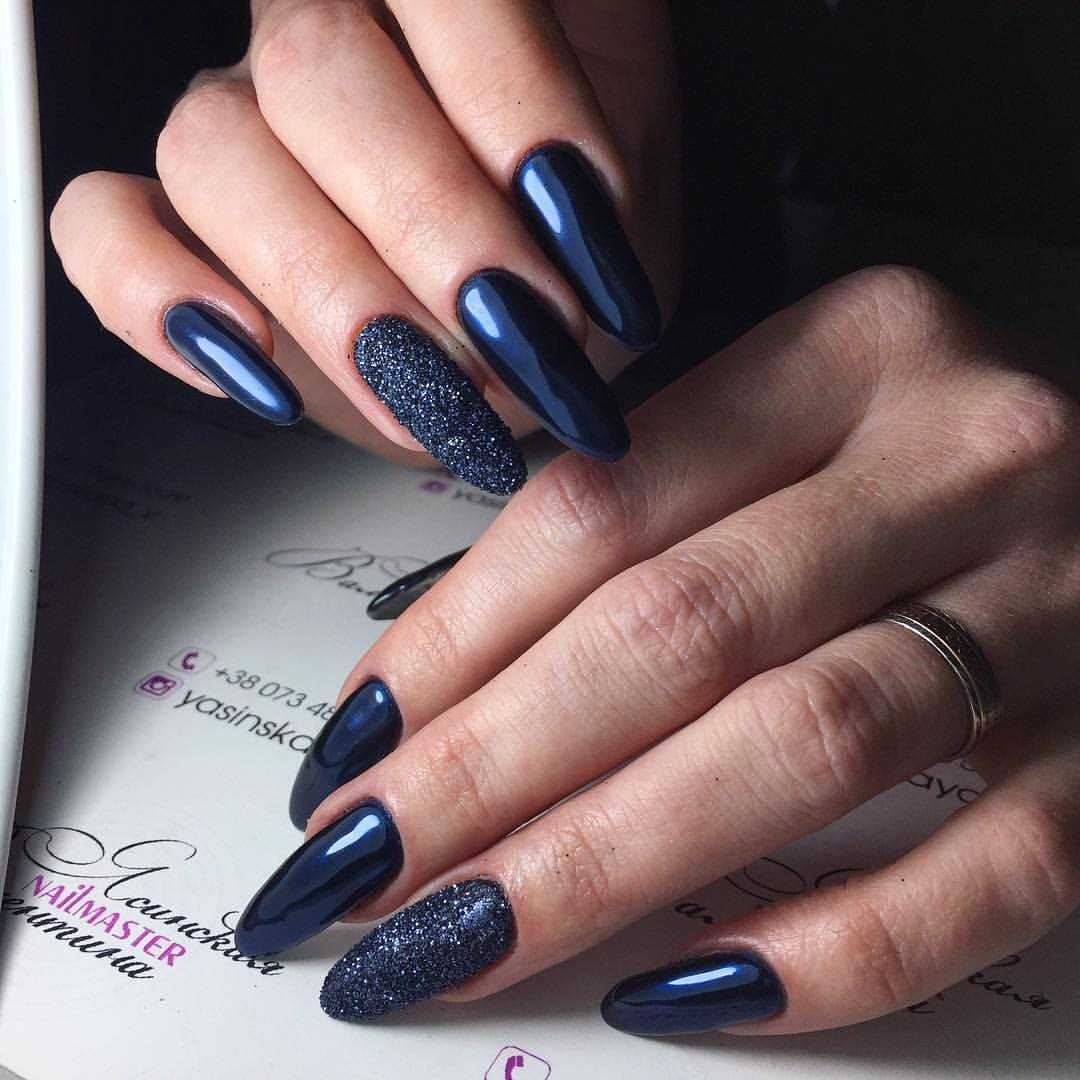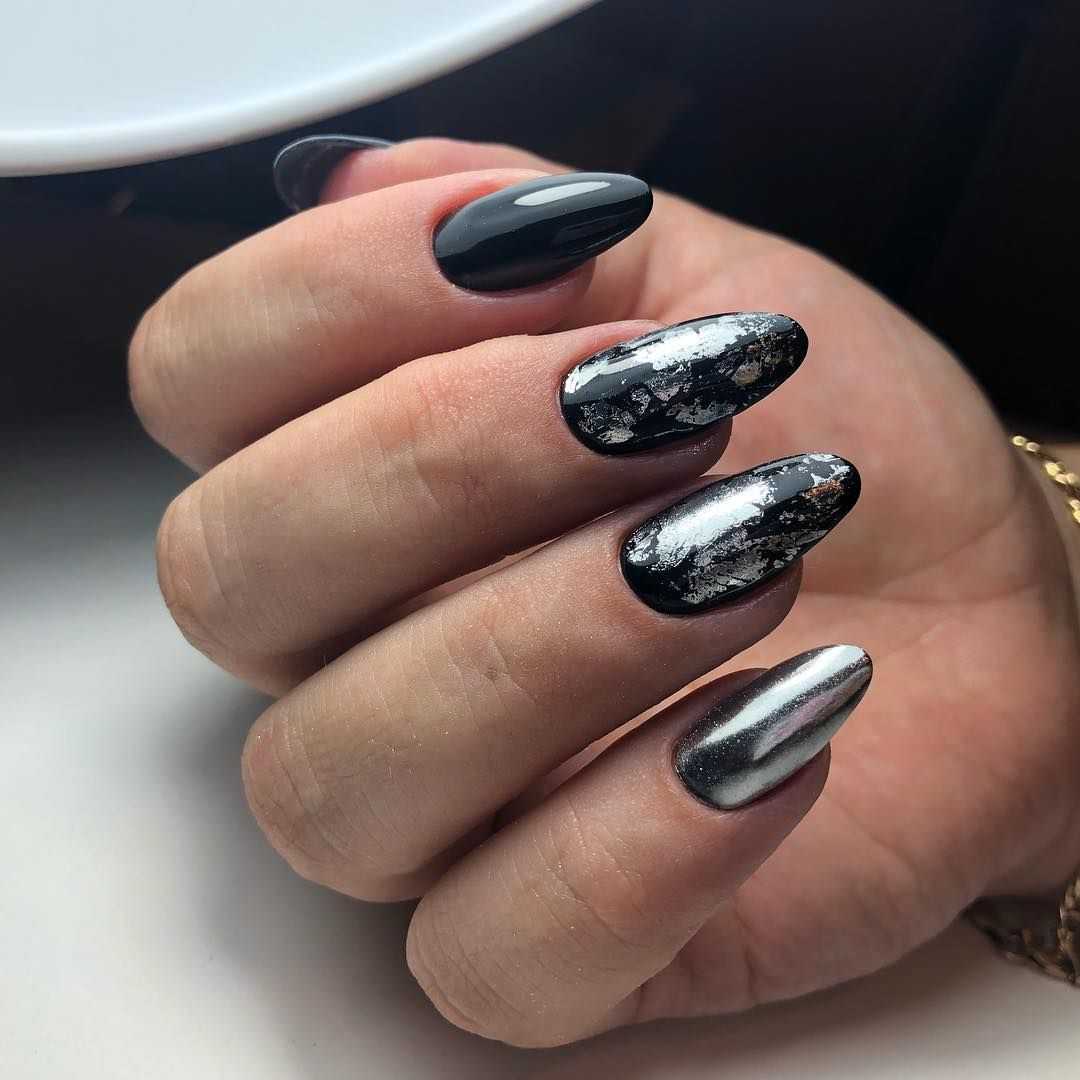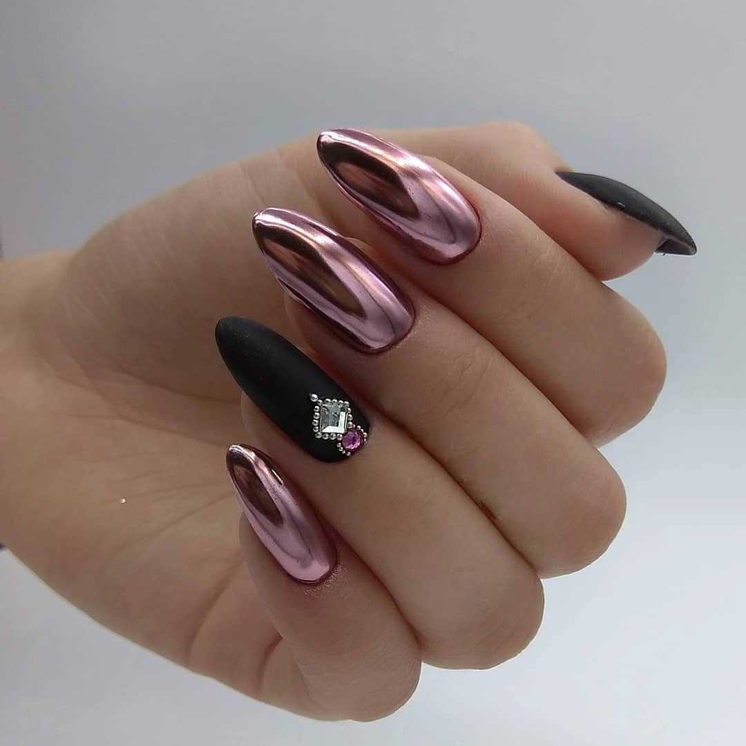 Чёрный лак на ногтях уже давно не ассоциируется с неформальными субкультурами, смотрится очень сдержанно и в модном сезоне 2021 считается признаком элегантности. Он прекрасно сочетается со многими известными техниками оформления и чудесно смотрится с украшениями и декором. Втирка в нашем случае, также не является исключением. Вы даже не представляете себе, насколько богато и шикарно выглядит такой тёмный маникюр с переливами пудры. Это может быть вариация однотонного нейла с блестящими переливами на каждом ноготке, комбинированный дизайн с блестящими и матовыми ногтями, маникюр с втиркой и рисунками или примеры нанесения пигмента в виде переходов градиента, когда на ногтевой пластине используется несколько цветов акриловой пудры. Не смотря на некую мрачность и бесконечную глубину, чёрный лак можно назвать идеальной базой для создания подобного дизайна.