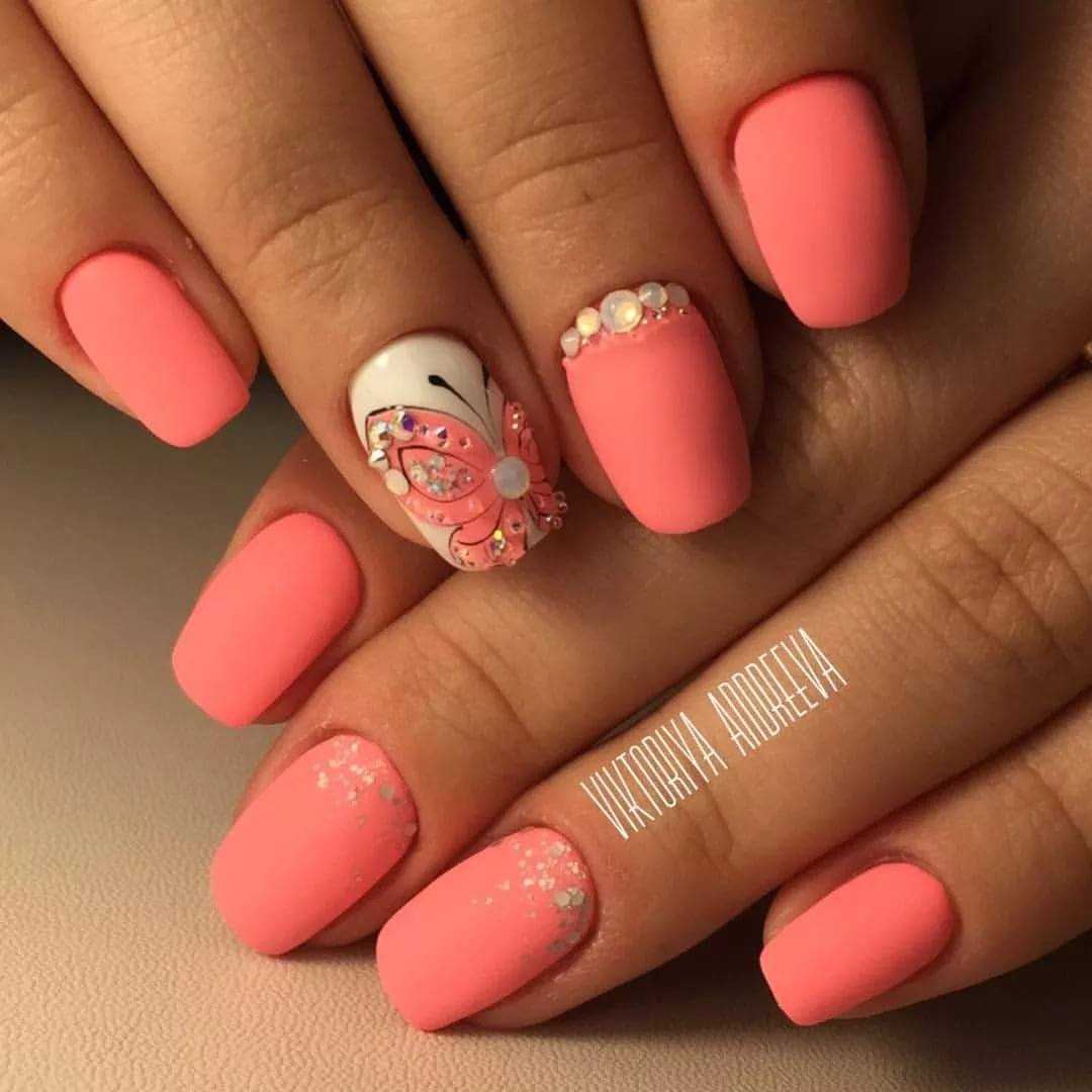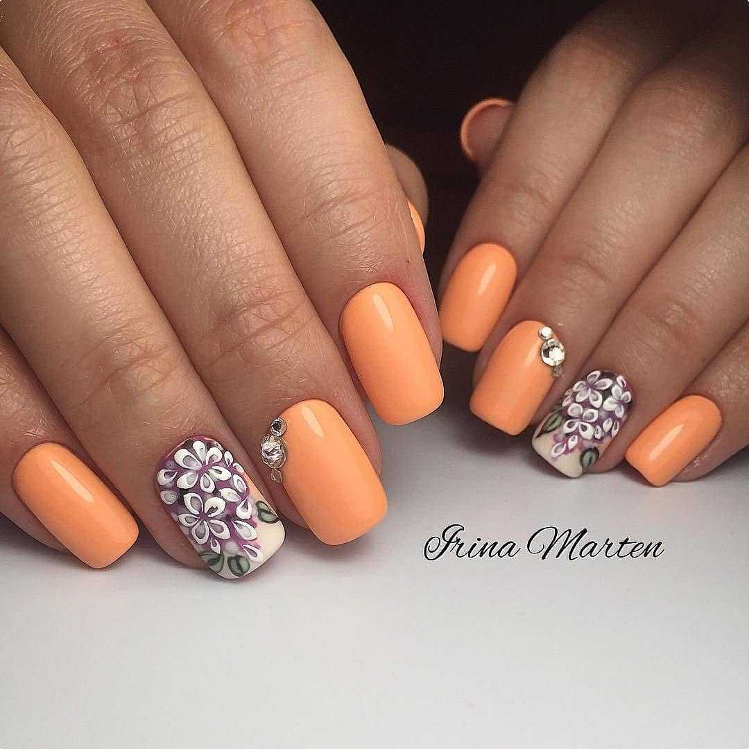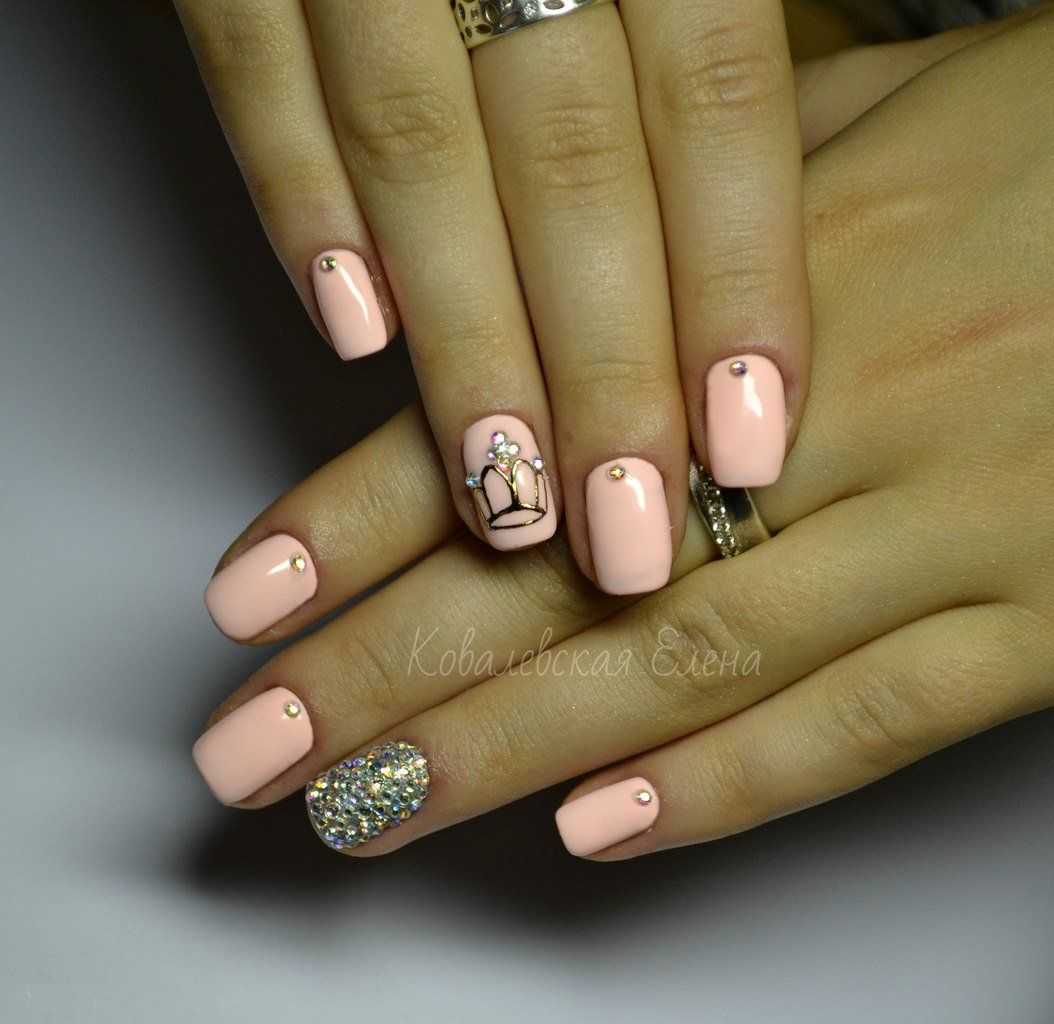 Удивительное сходство персиковой гаммы с натуральным оттенком кожи позволяет ни на минуту не сомневаться в актуальности выбора такого покрытия для создания стильного нейл-арта на короткой длине. При этом персиковые тона не сливаются с оттенком кожных покровов, смотрятся достаточно выразительно, женственно и утончённо. Среди модных вариаций оформления лаконичные идеи однотонного маникюра, выполненные в стиле минимализм, для которого расположения одиночных кристаллов на каждом ноготке будет вполне достаточно. А также симпатичные цветочки, пудровые или объёмные рисунки, лунный дизайн, френч, матовый дизайн, маникюр с вертикальными полосками, позволяющими визуально вытянуть ноготки, выделение стразами пластины на безымянном пальчике и многие другие идеи. К тому же, персиковый лак уместно смотрится в строгих образах, а как известно, короткие ноготки считаются очень популярными в кругах деловых леди.