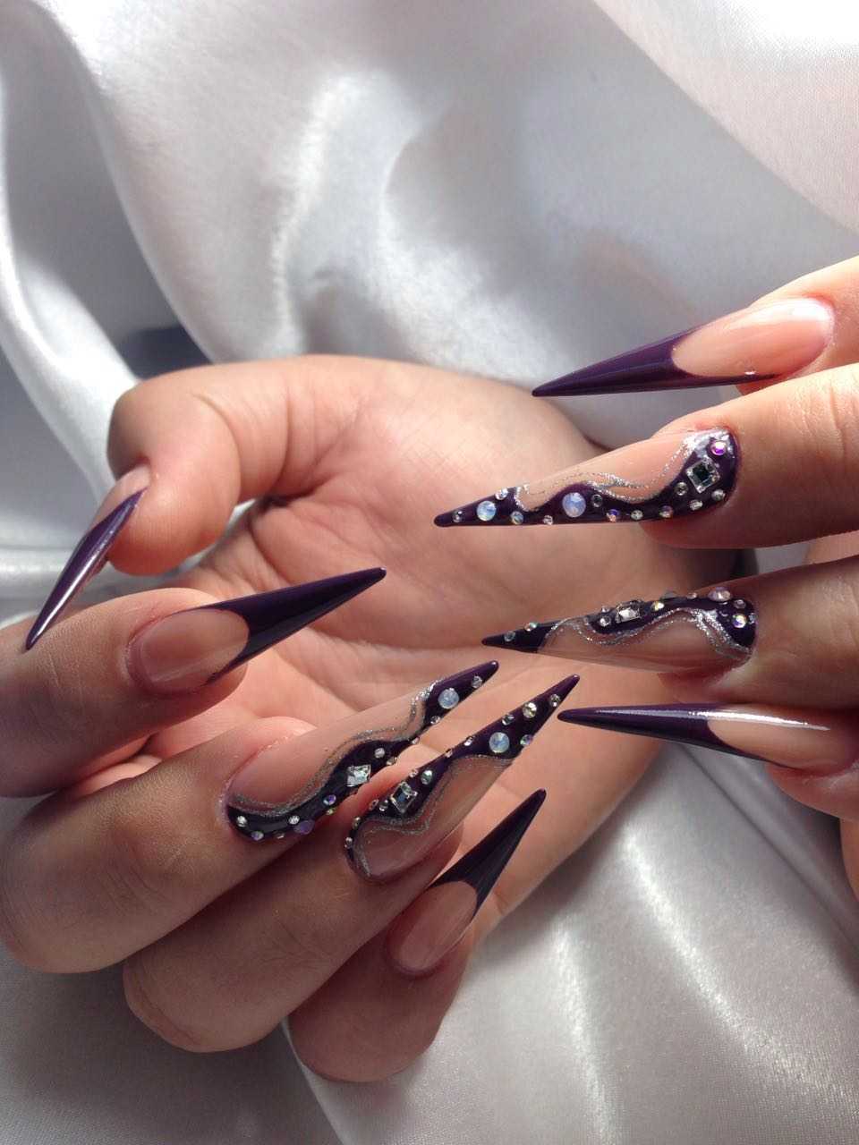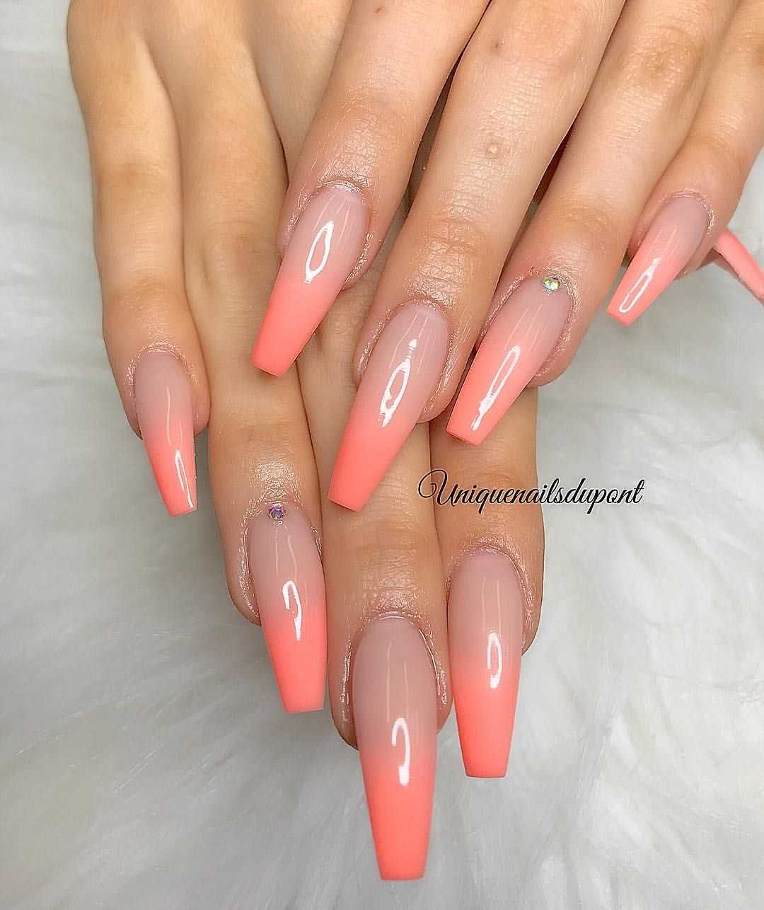 Градиентный маникюр отлично смотрится на длинных ногтях. На них получается расположить плавный переход оттенков, показать глубину используемых тонов и при желании дополнить дизайн стразами или флористикой.