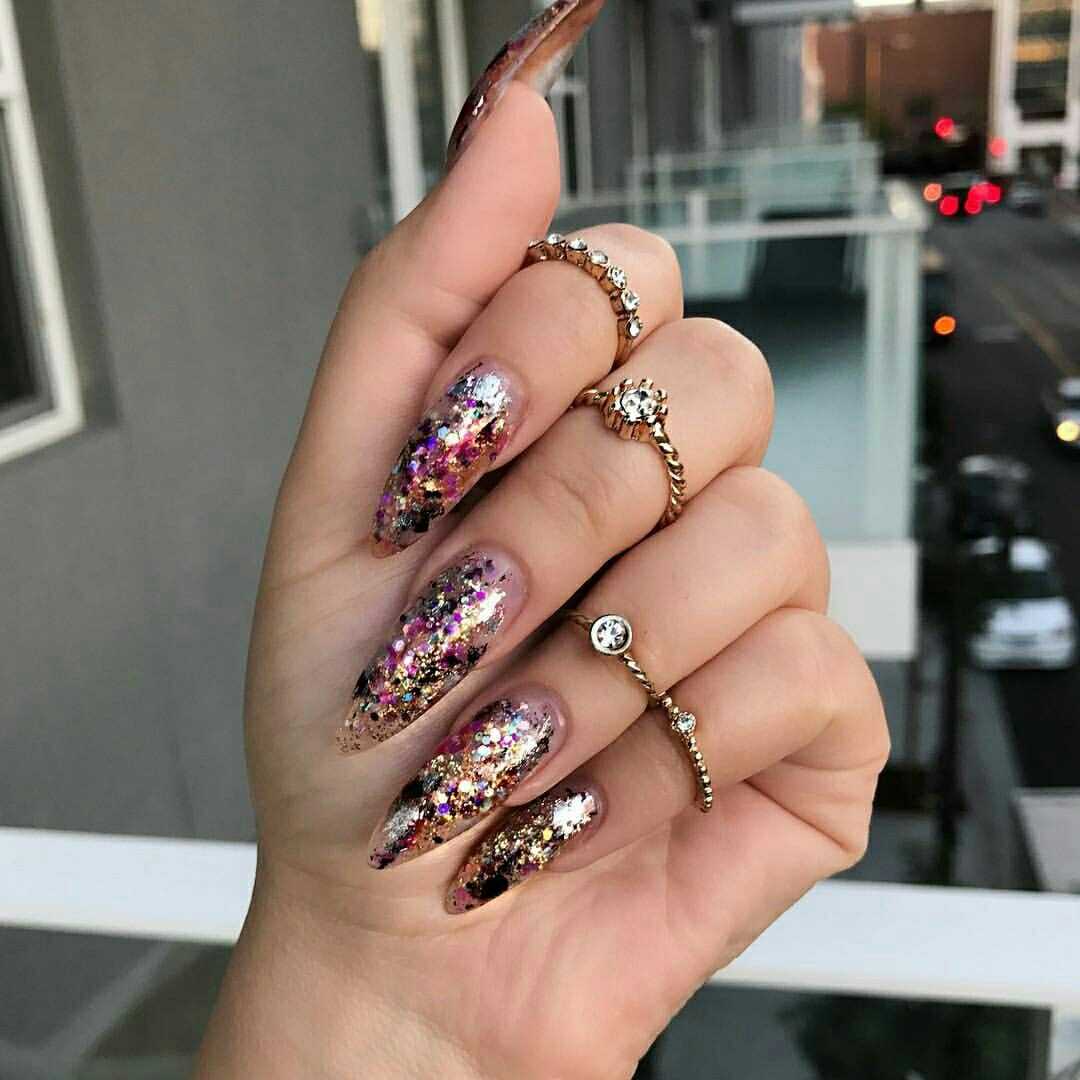 Способов создания блестящего декора множество. В первую очередь, это привычные сухие блестки и глиттер. Достаточно покрыть ногти сплошным слоем гель-лака с блестками, чтобы они выглядели изысканно и стильно.