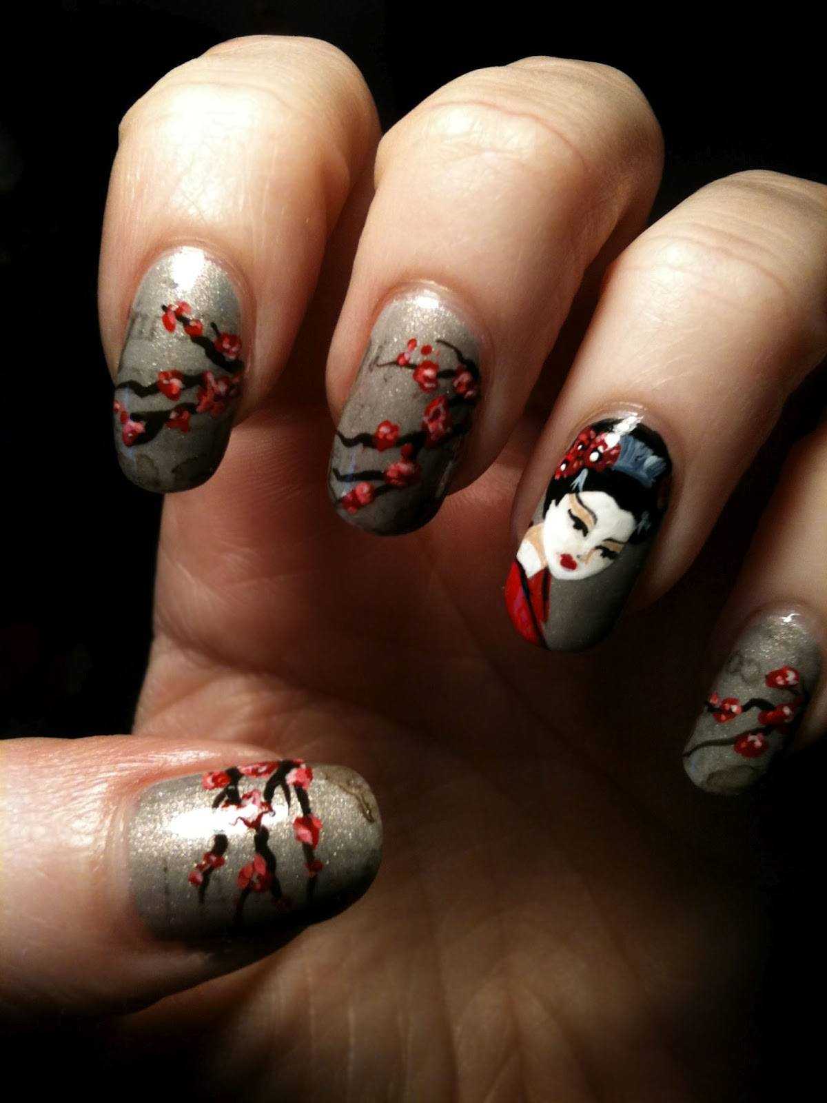 Как видите, дизайн ногтей в восточном или японском стиле предлагает массу идей и возможностей для украшения ногтей. Такой маникюр существенно отличается от привычных нам вариантов дизайна необычным рисунком и цветовой палитрой. А представьте, как красиво и необычно будут смотреться на ваших ногтях веточки сакуры и иероглифы, забавные рожицы персонажей аниме-комиксов или узоры, оформленные в стиле мехенди. Это действительно что-то новое и необычное!