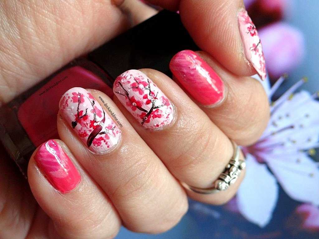 Маникюр с сакурой выполняется в розовом, малиновом, красном и других тонах. В качестве дополнения дизайна можно использовать изображение пагоды и иероглифов. Для выполнения этих узоров используются слайдеры или стемпинг. Сакура и другие японские мотивы красиво смотрятся на белом или другом светлом фоне. Дизайн должен получится очень нежным и женственным, как сама сакура, которая как известно считается символом женственности и скромности.