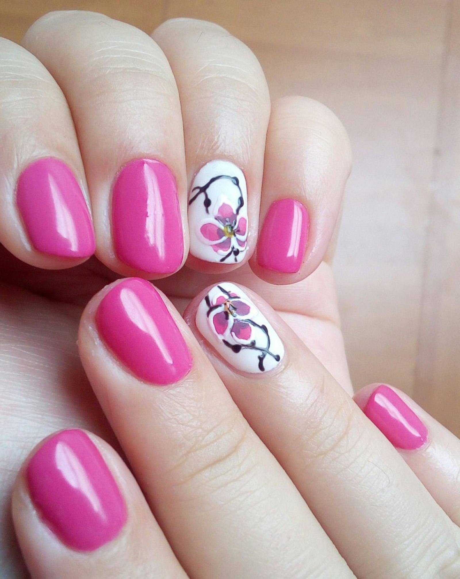 Кроме того, покрытие на коротких ноготках не обязательно должно быть светлым. Яркие, насыщенные оттенки лишь подчеркнут красивый, изысканный дизайн в виде сакуры.