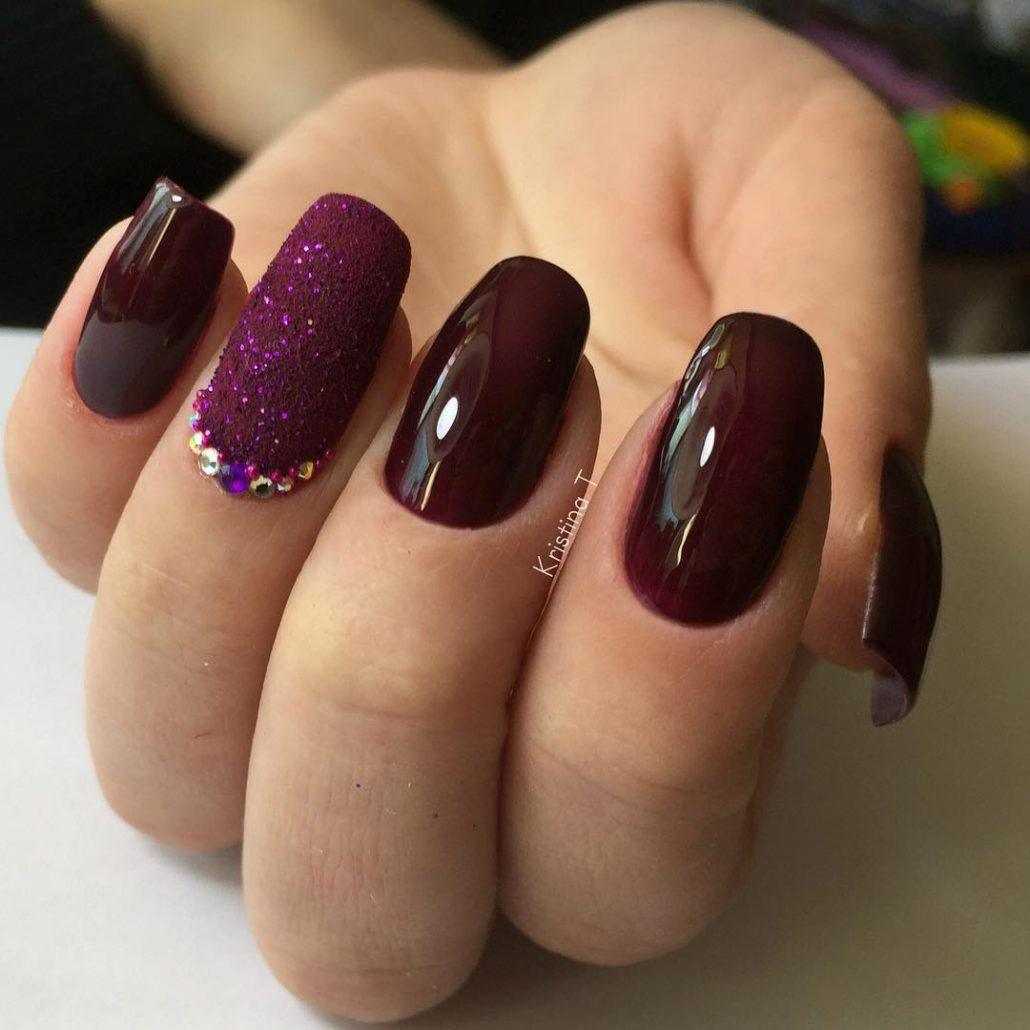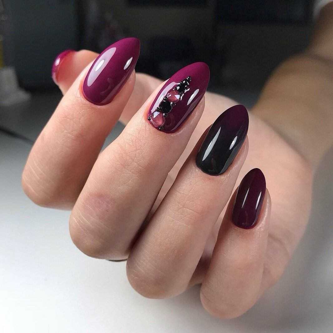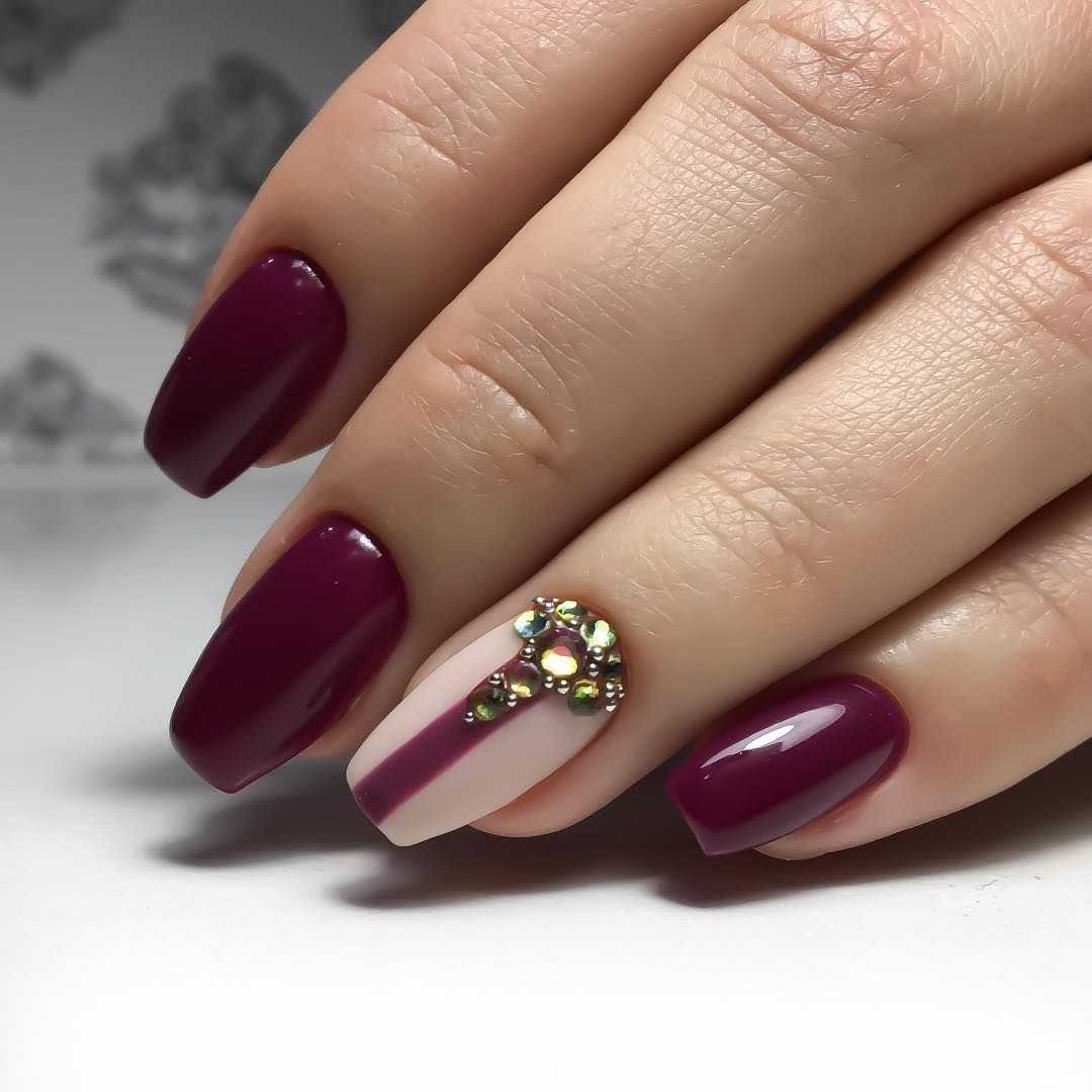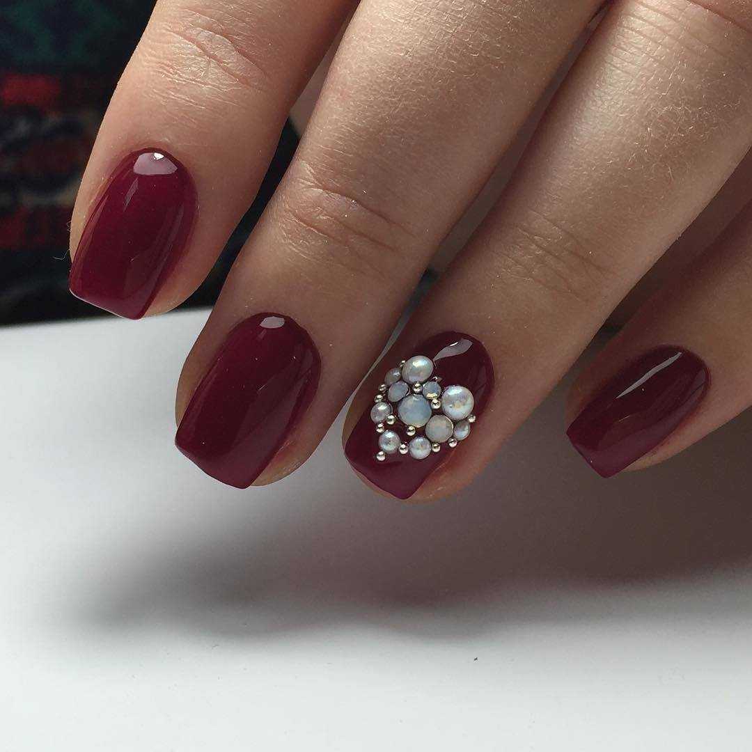 Стразы используются для декорирования однотонного черного, бордового, синего, белого маникюра. Расположить стразы можно несколькими способами: