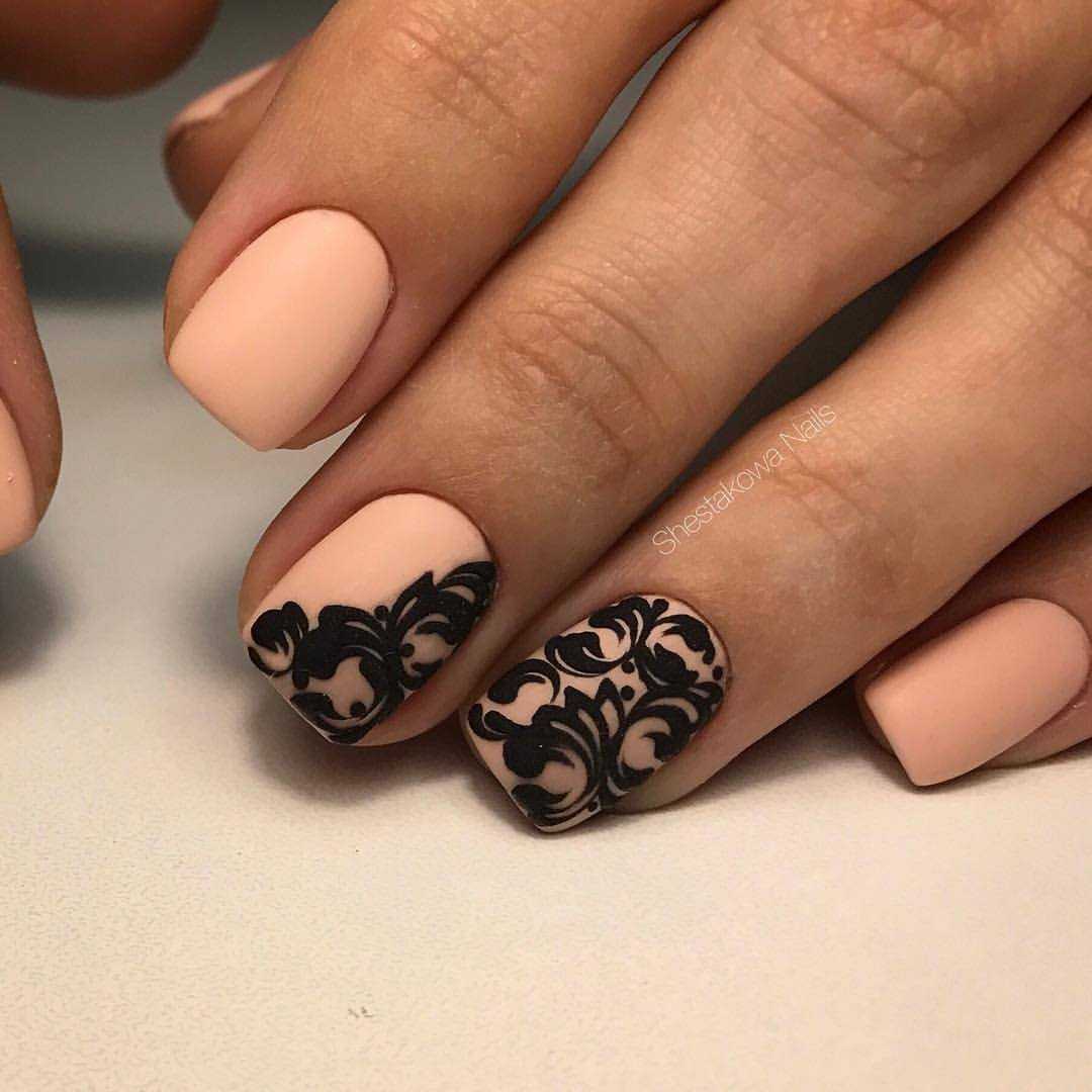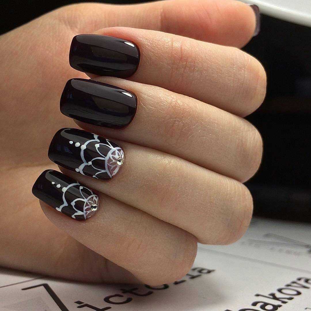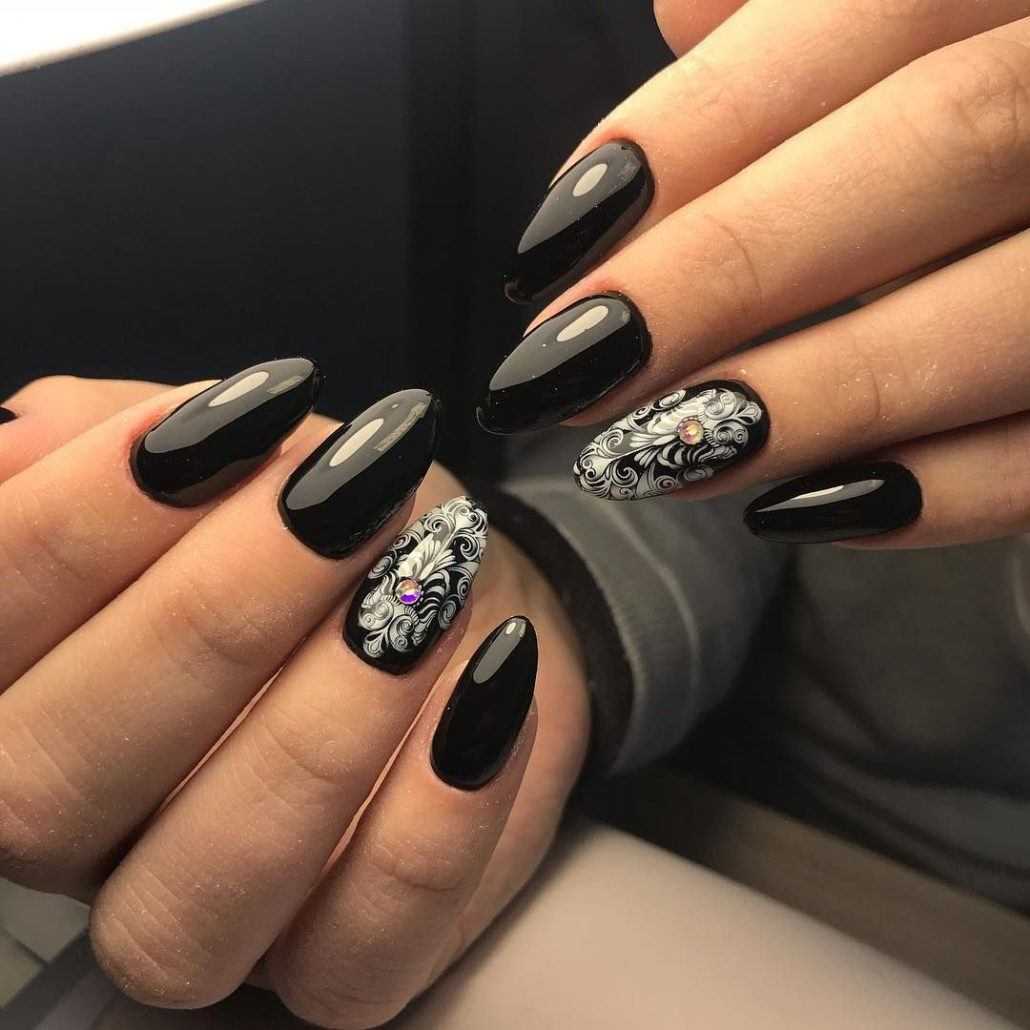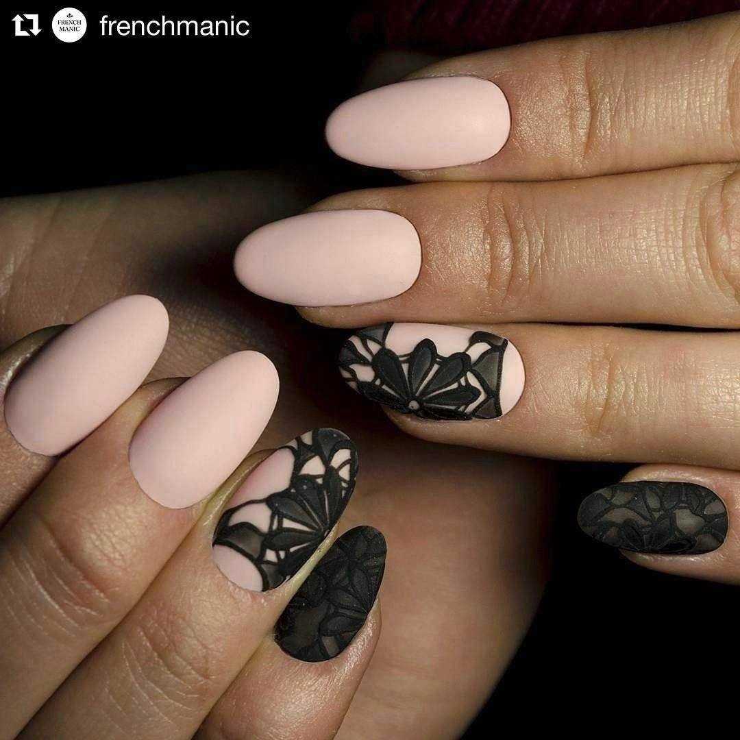 Черные ажурные узоры на ногтях выглядят благородно и очень женственно. Они придают всему образу нотки таинственности и неприступности. Чтобы дизайн выглядел стильно и ухоженно, используйте ажурный узор на 1-2 пальцах, остальные ногти покройте однотонным черным лаком. Что касается самого рисунка, то это могут быть классические кружевные узоры, точки с помощью дотса, геометрические фигуры, цветы.