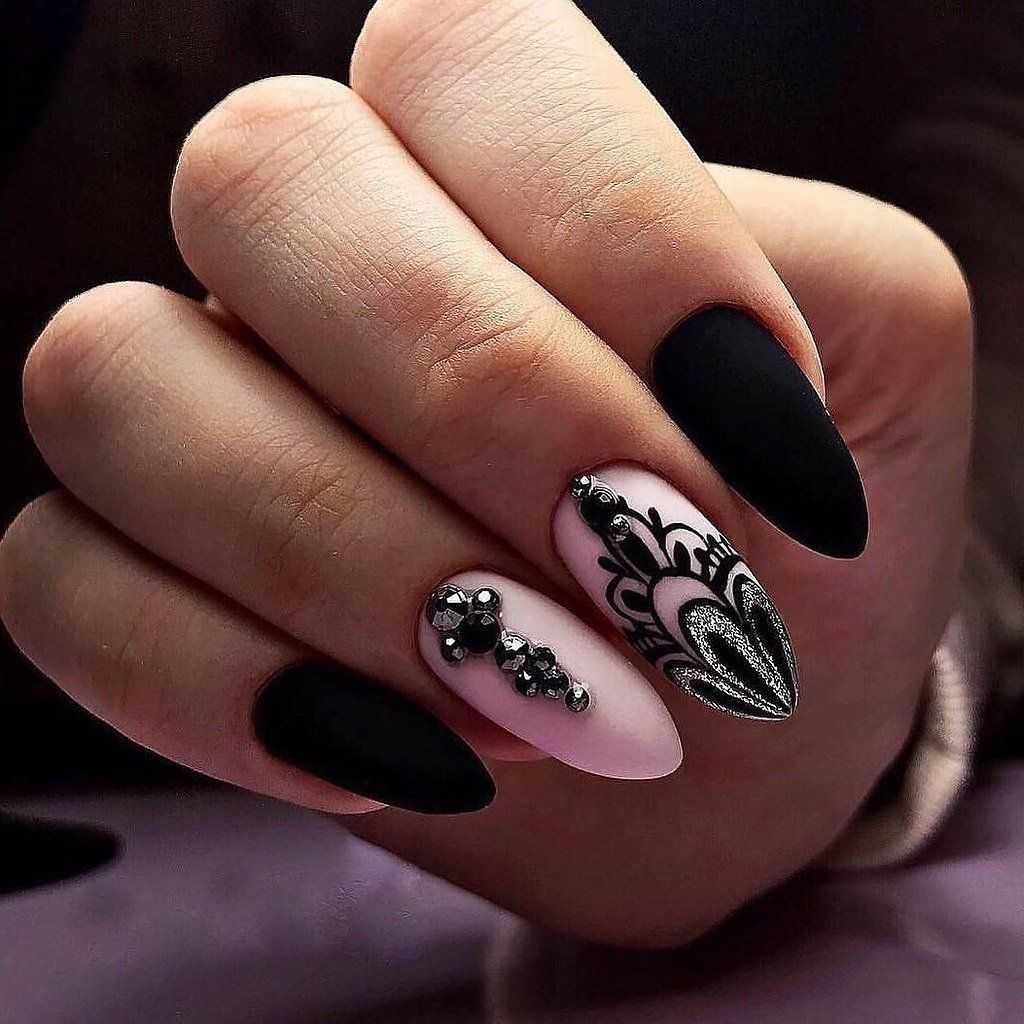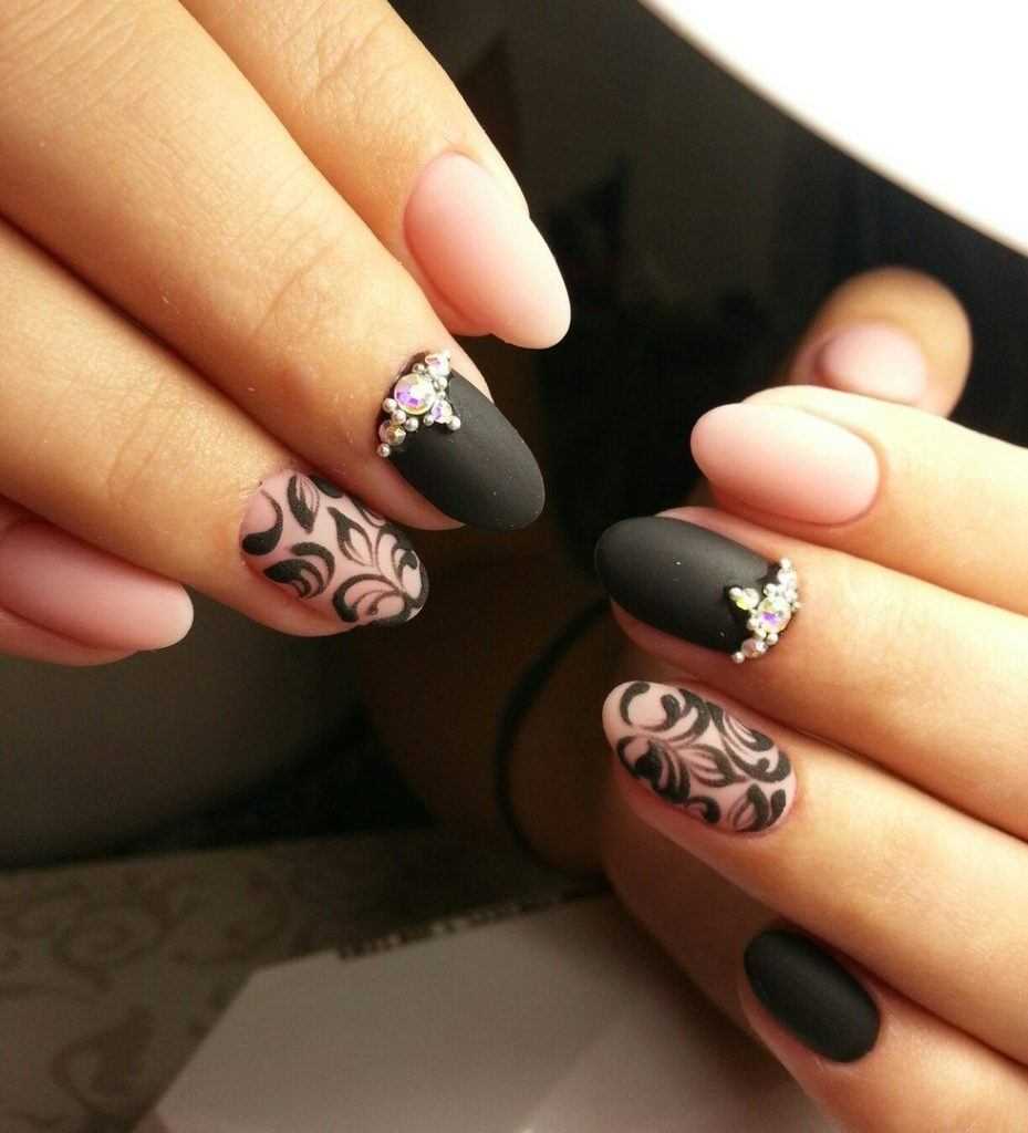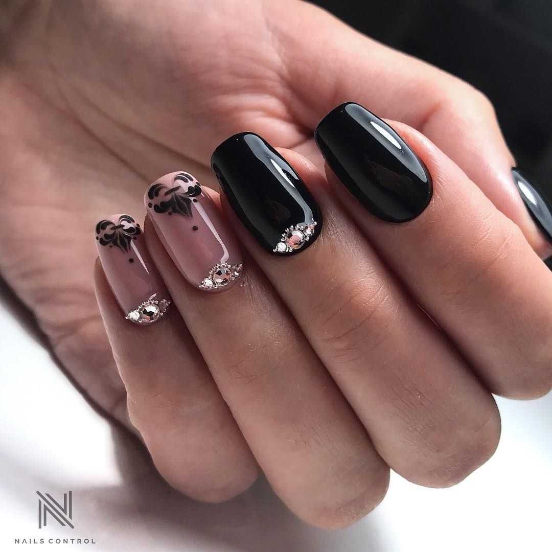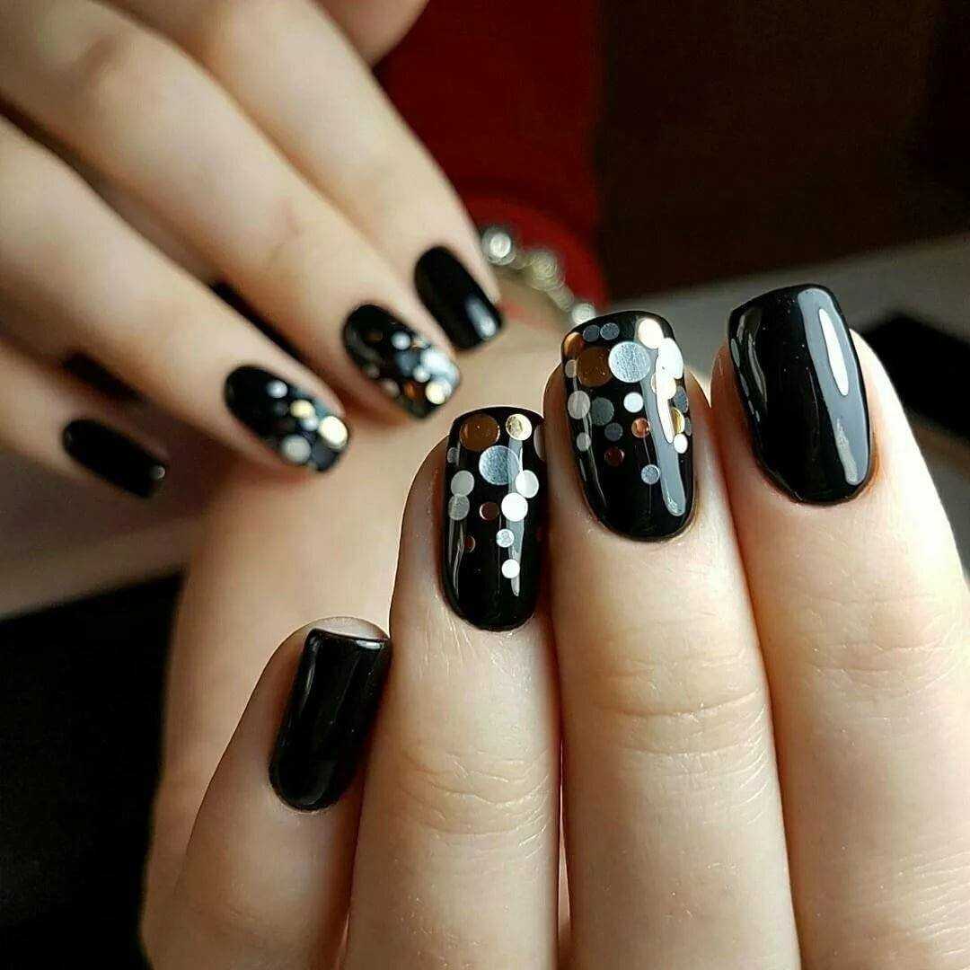 Черные ажурные узоры на ногтях выглядят благородно и очень женственно. Они придают всему образу нотки таинственности и неприступности. Чтобы дизайн выглядел стильно и ухоженно, используйте ажурный узор на 1-2 пальцах, остальные ногти покройте однотонным черным лаком. Что касается самого рисунка, то это могут быть классические кружевные узоры, точки с помощью дотса, геометрические фигуры, цветы.