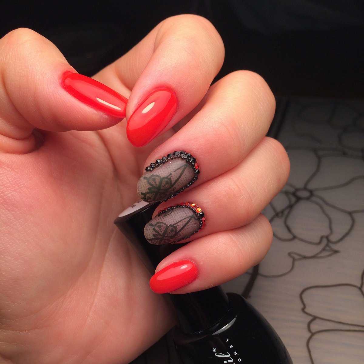 Способ создания красного маникюра вуаль практически не отличается от предыдущих нейл-артов. Кружево, точки, цветы, геометрия – все это великолепно выглядит в красном насыщенном цвете. Что касается контрастов, то лучшим дополнением красной вуали будет черные элементы. Черно-красный маникюр выглядит по-настоящему шикарно и обворожительно.