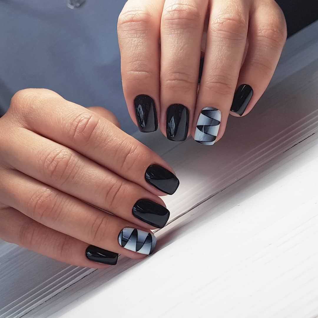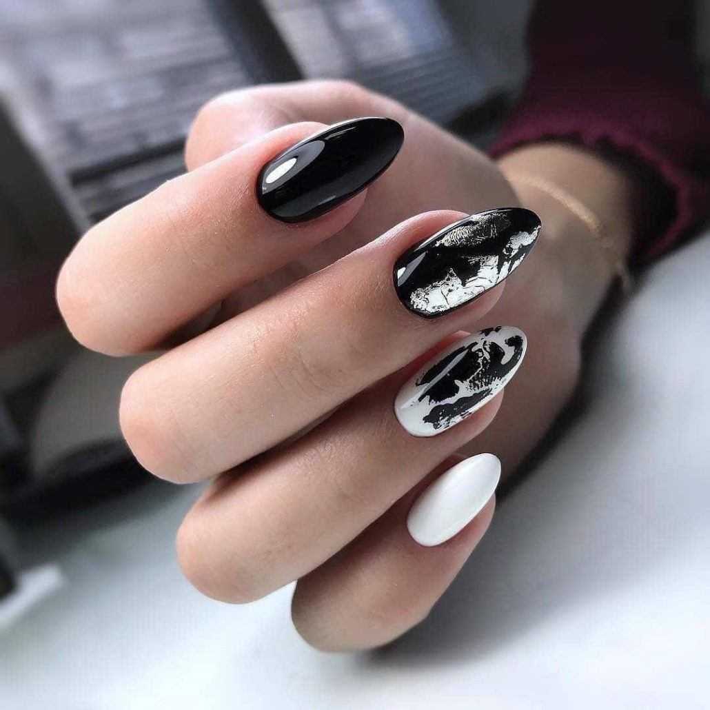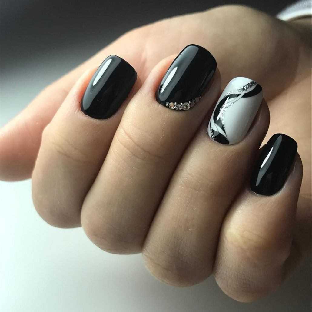 Великолепно выглядит сочетание черного и белого в одном дизайне. Такой маникюр идеально подойдет для торжеств или делового стиля. При этом стоит заранее определиться какой оттенок будет доминирующим в вашем нейл-арте и исходя из этого строить весь нейл-арт.