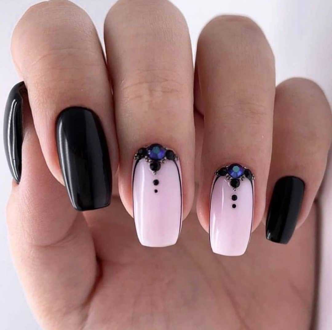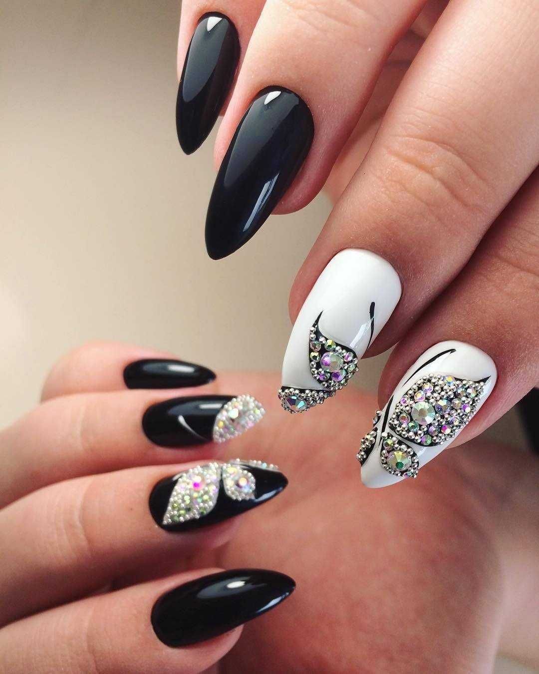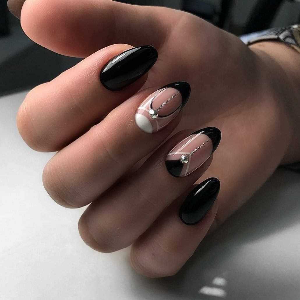 Великолепно выглядит сочетание черного и белого в одном дизайне. Такой маникюр идеально подойдет для торжеств или делового стиля. При этом стоит заранее определиться какой оттенок будет доминирующим в вашем нейл-арте и исходя из этого строить весь нейл-арт.