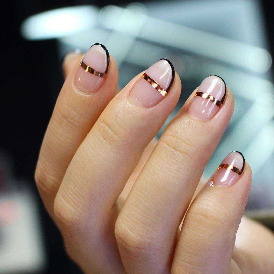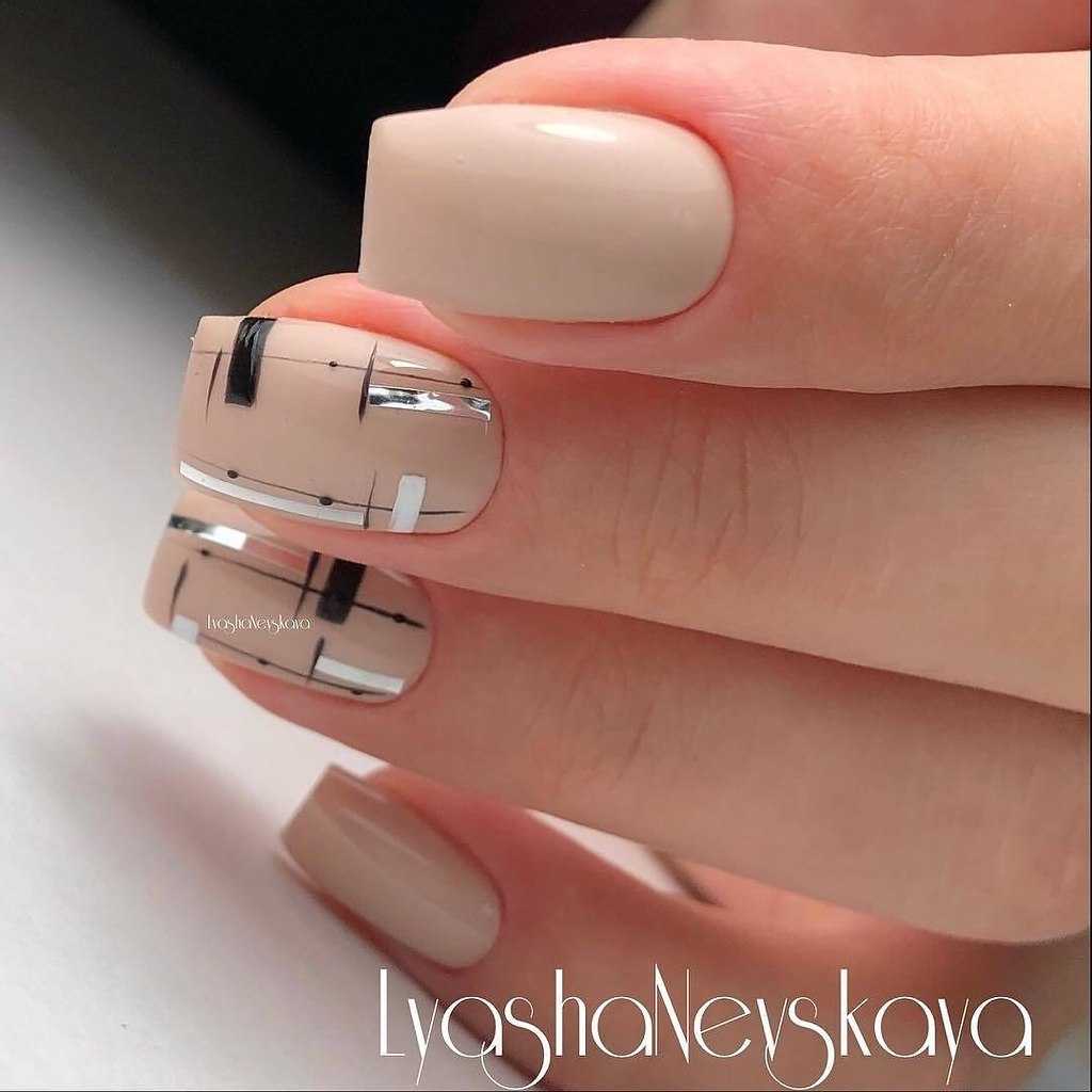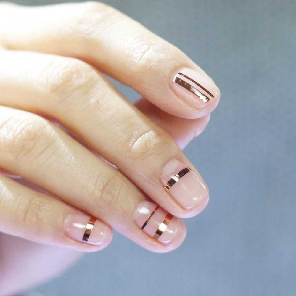 Полоски можно расположить вдоль и поперек ногтя, оформить в виде хаотичных фигур. Дизайн с линиями легко выполнить самостоятельно. Для этого используйте тонкую маникюрную кисть и проведите ею по поверхности ногтя как можно ровнее. Для создания изысканного дизайна для особых случаев воспользуйтесь маникюрными полосками. Они позволят создать идеальные линии с переливающимся эффектом.
