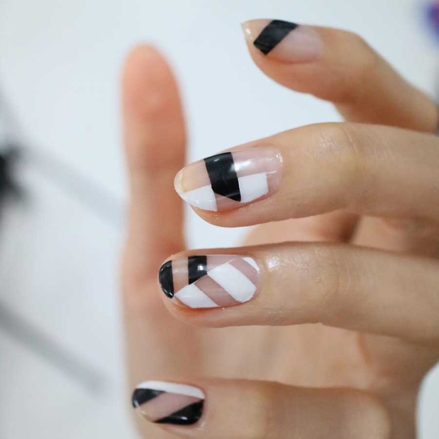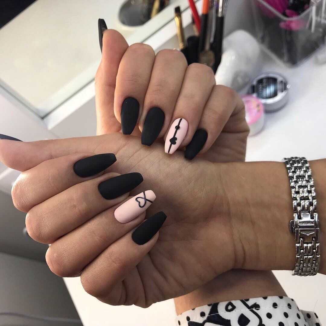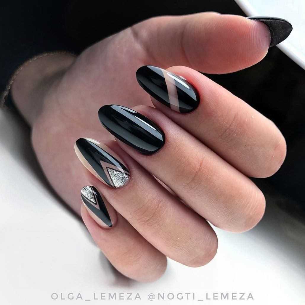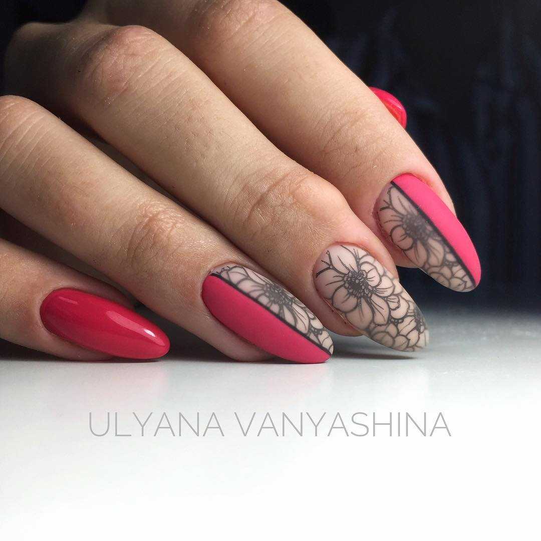 Геометрический рисунок — один из лучших способов продемонстрировать длинные нарощенные ногти. У вас будет достаточно места, чтобы использовать контрастные формы, цвета и узоры. Обязательно используйте два контрастных цвета — например, черный и телесный, чтобы резкие узоры выделялись.