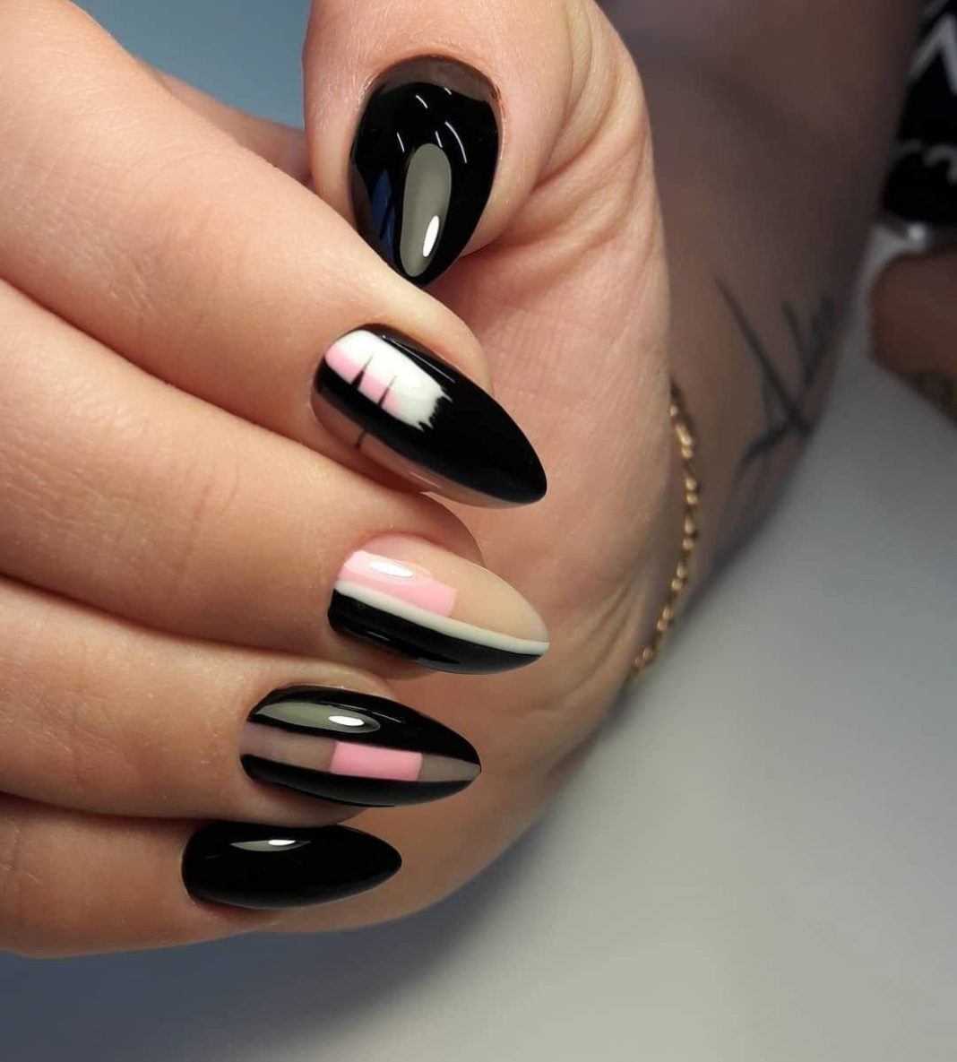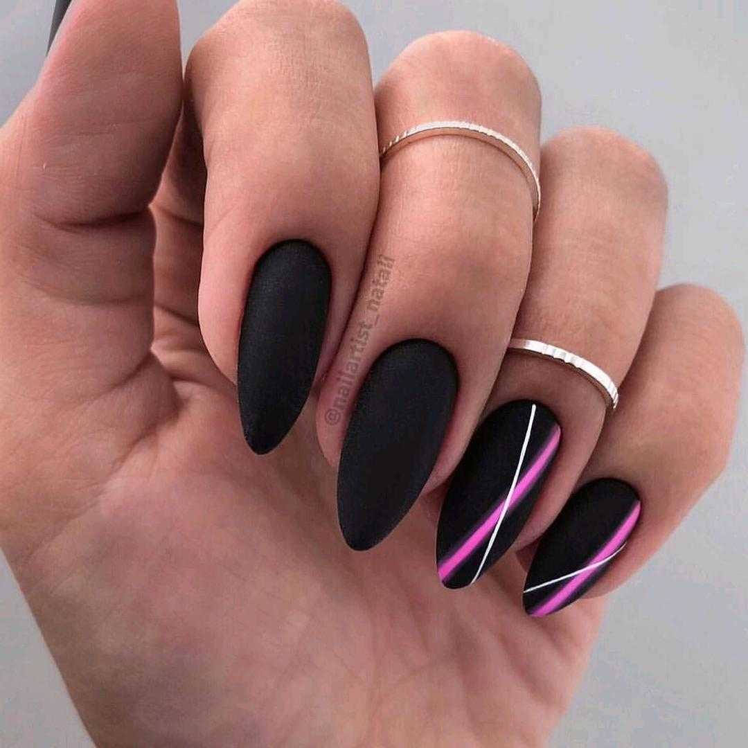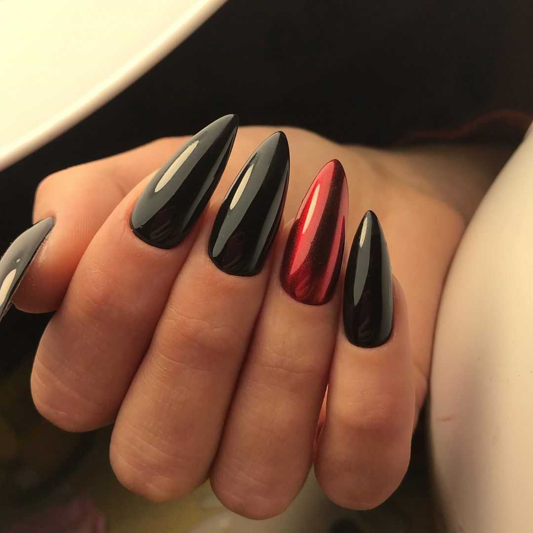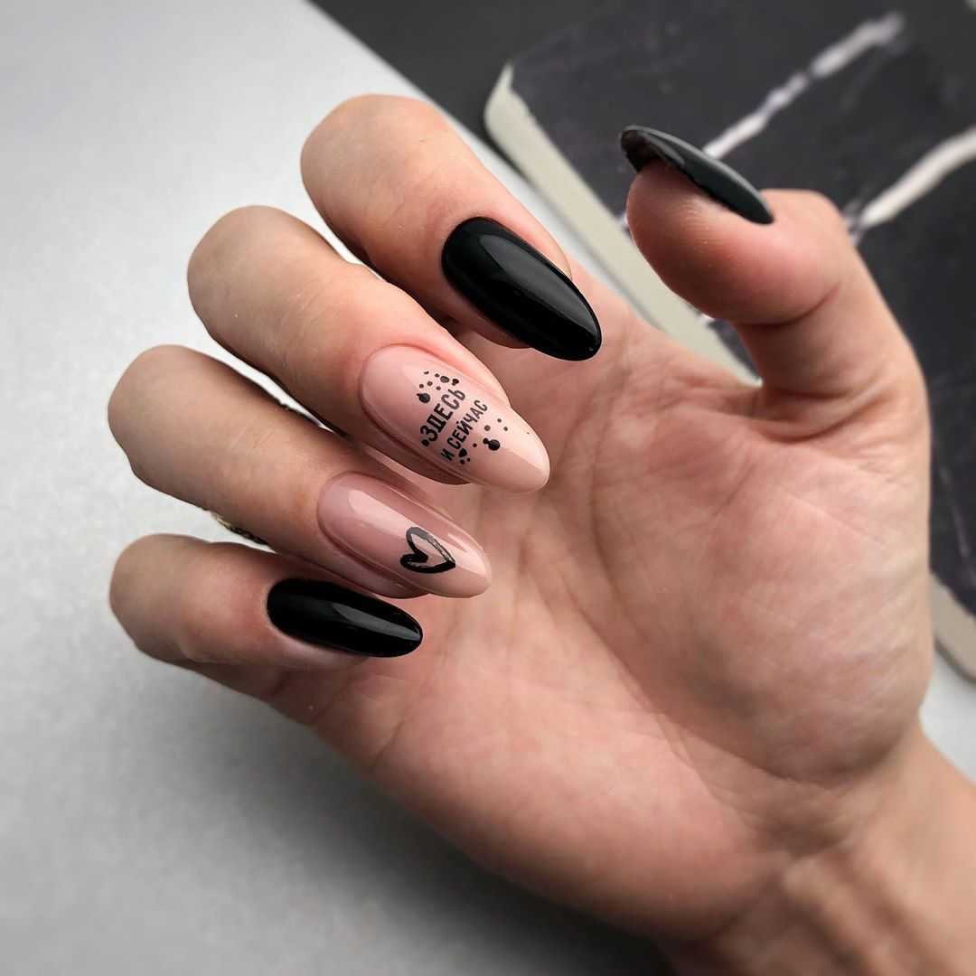 Геометрический рисунок — один из лучших способов продемонстрировать длинные нарощенные ногти. У вас будет достаточно места, чтобы использовать контрастные формы, цвета и узоры. Обязательно используйте два контрастных цвета — например, черный и телесный, чтобы резкие узоры выделялись.
