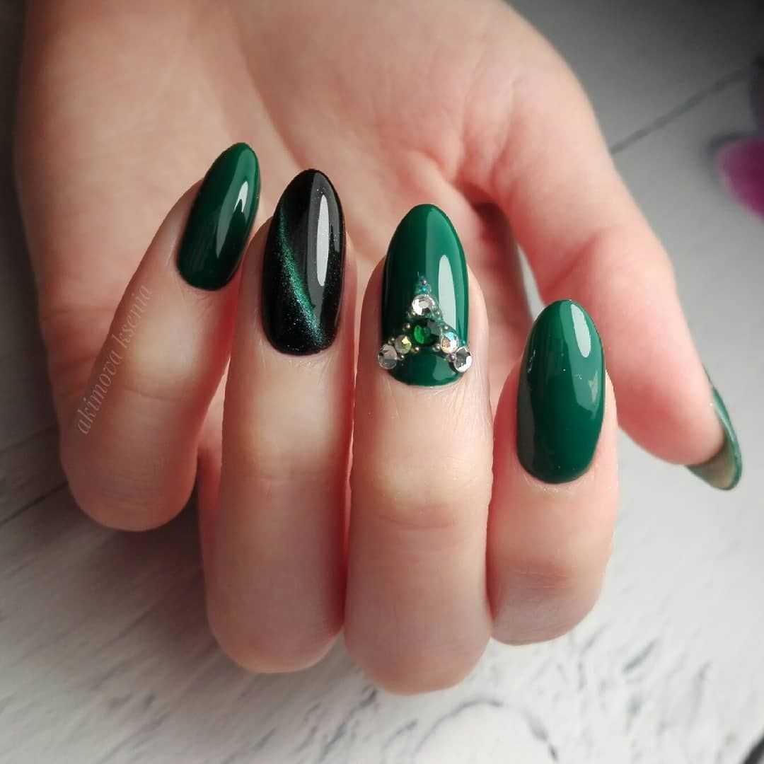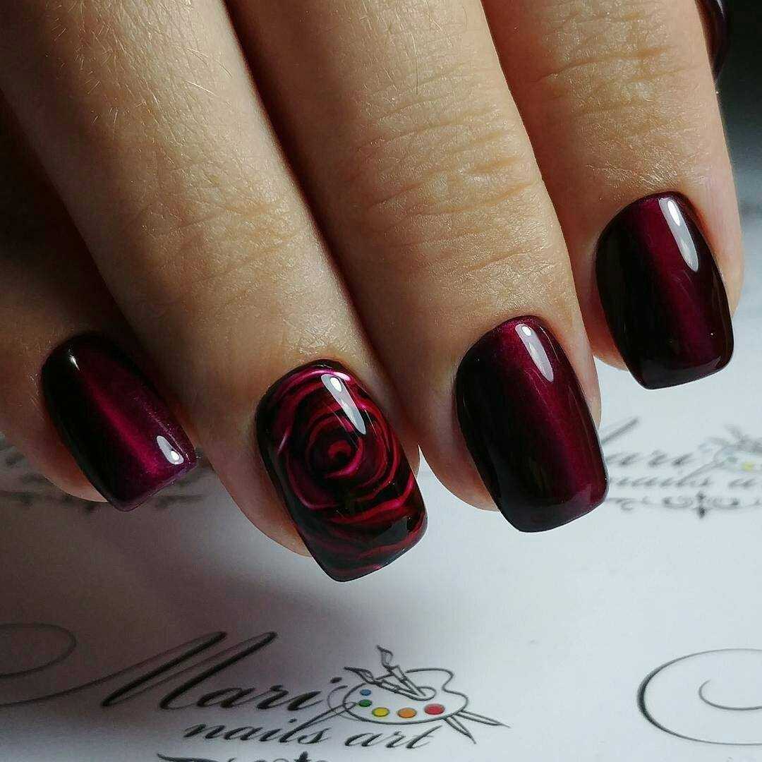 В вечернем образе великолепно смотрится бордовый, изумрудный, черный цвета. Они шикарно переливаются, выглядят объемно и очень красиво. Магнитные нейл-арты чаще всего не нуждаются в дополнительном декоре.