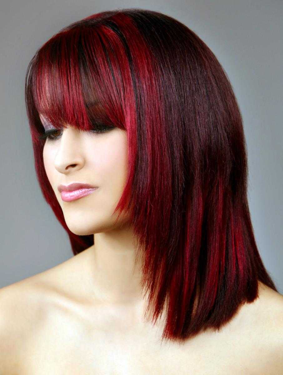 Для людей с темными волосами окрашивание челки связано с большими трудностями, чем для женщин со светлыми в обесцвечиваются (процедура может проходить дважды), а затем уже наносится выбранный колор. Для брюнеток подходят сливовые, фиолетовые и красные тона. Для девушек с рыжими волосами выбор цвета практически неограничен, но нужно все же сначала обесцветить локоны, и только потом приступать к нанесению.