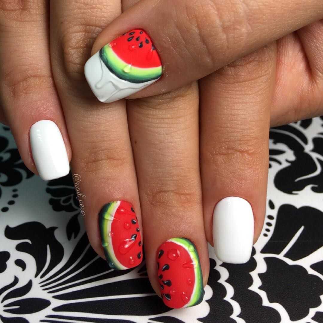 Еще один вариант дизайна – фрукты в разрезе. На коротких ногтях такой узор будет смотреться гораздо заметнее и ярче, чем обычные фрукты. Такой декор можно дополнить стразами, глиттером и другим блестящим декором. Фруктовый дизайн лучше располагать на 1-2 акцентных ногтях, остальные ногти окрасьте в молочный или другой светлый оттенок.