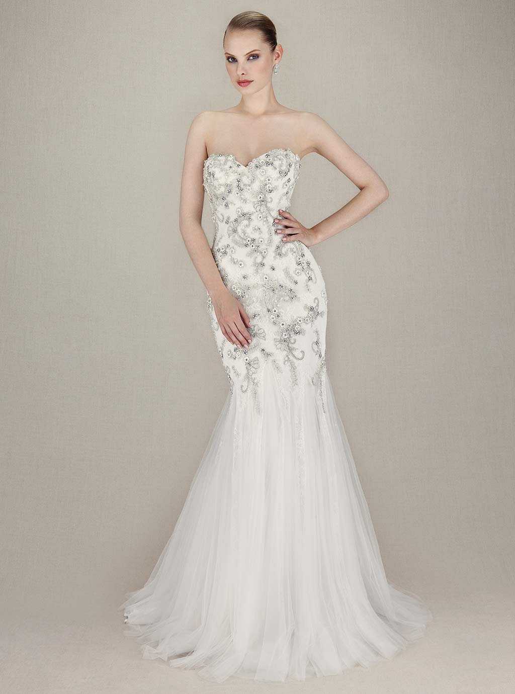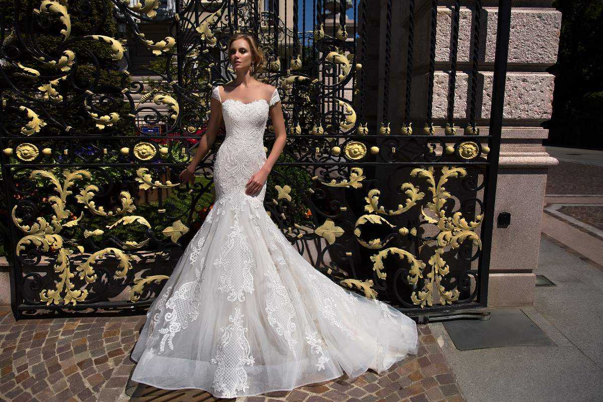 Лидирующее место среди венчальных платьев занимает именно платье-русалка. Верхняя его часть обтягивает фигуру девушки от лифа до середины бёдер или колен, нижняя представляет широкую юбку. Наряд действительно напоминает русалку и выглядит торжественно и стильно. Подойдет такое платье не всем – оно очень требовательно к параметрам невесты. “Рыбка” украсит девушек: