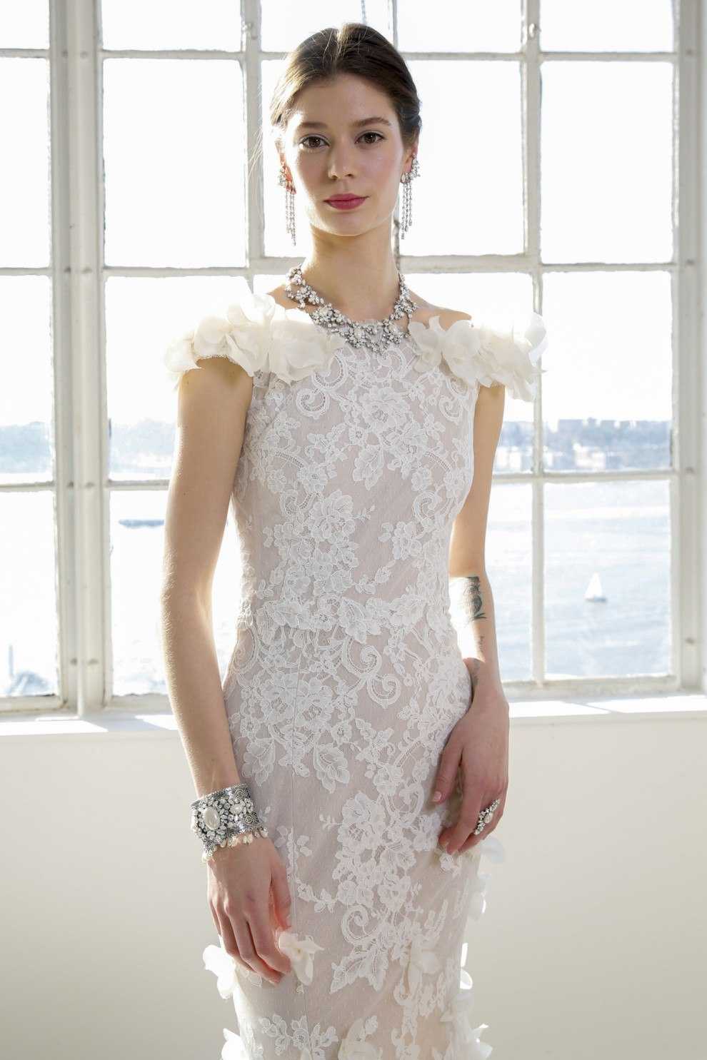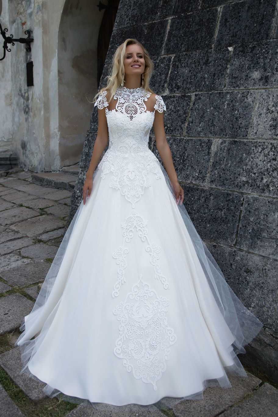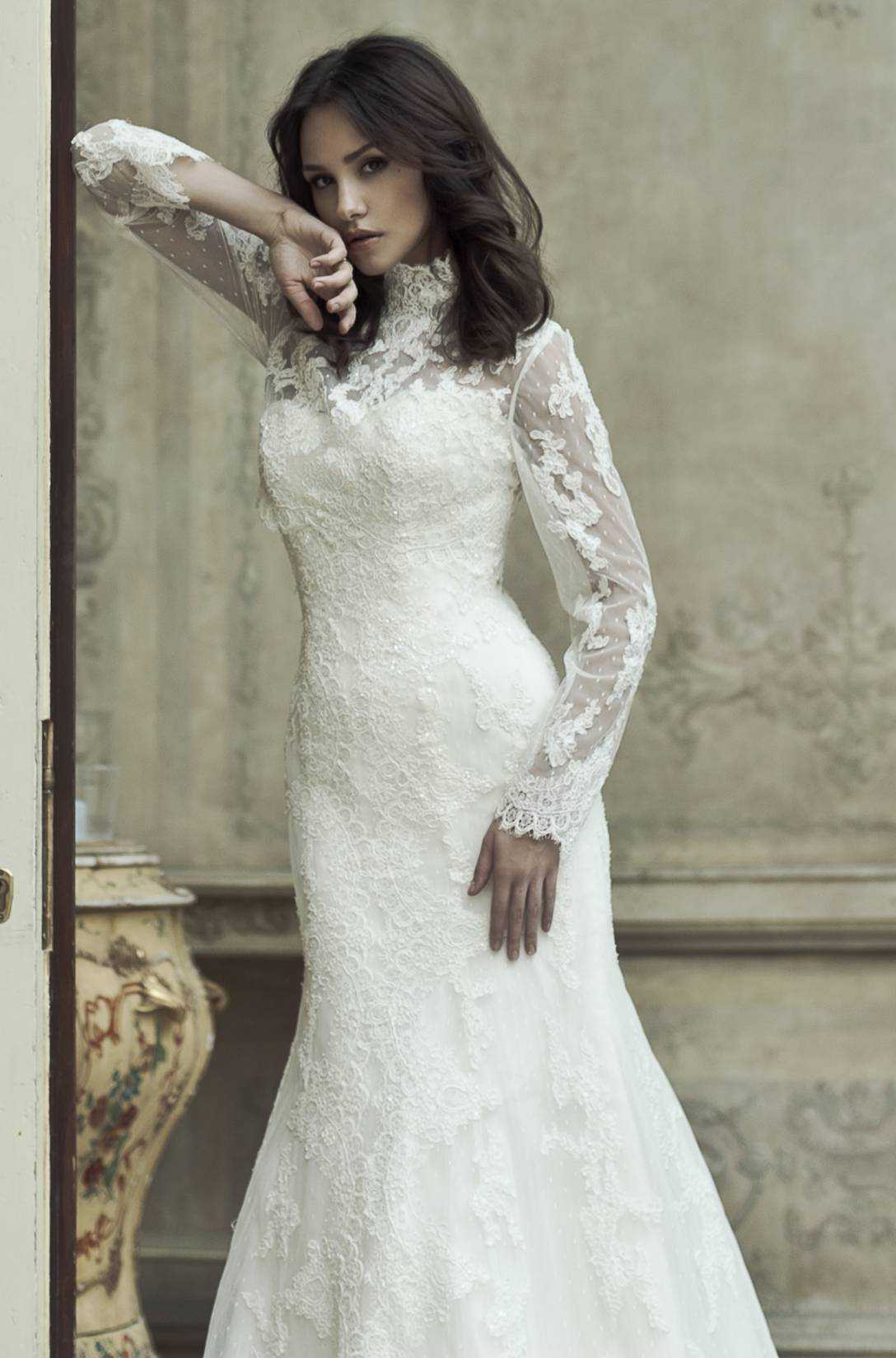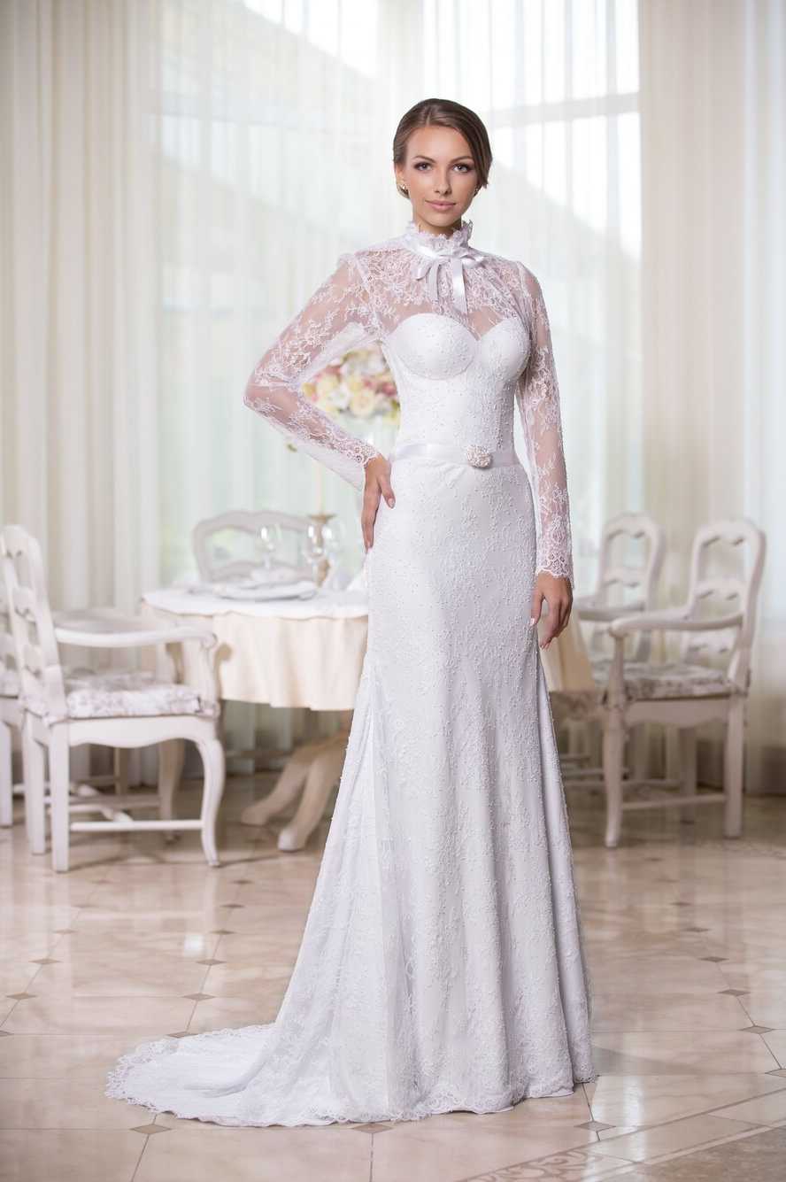 Модные свадебные платья нынешнего сезона поддерживают тенденцию предыдущего года к высоким воротникам. Модели на фэшн-показах дефилируют в одеждах, верх которых повторяет крой офисной рубашки или напоминает строгий гольф, декорированный ажурной перфорацией.