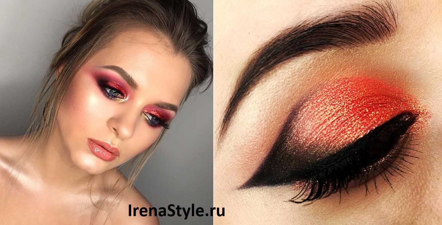 Отличным дополнением к ярким губам станет насыщенный макияж глаз: насыщенные палитры теней для век с шиммером и блеском, блестки, пайетки, кристаллики, стразинки на веках и ресницах.