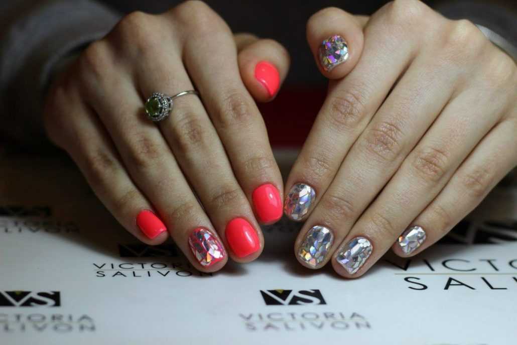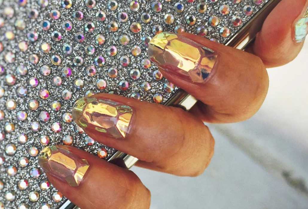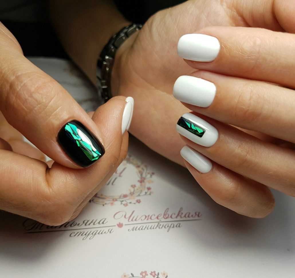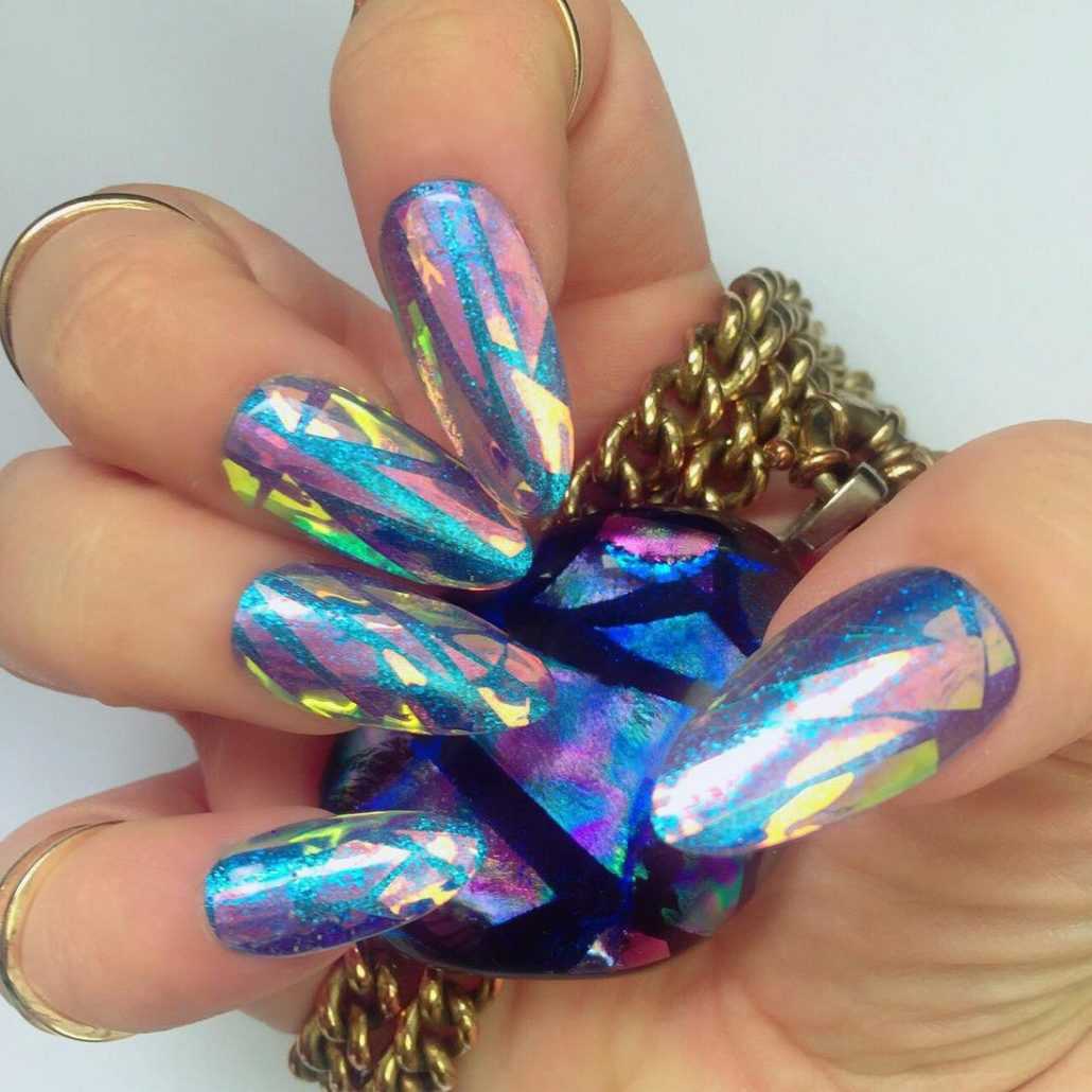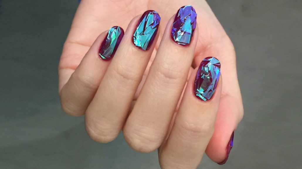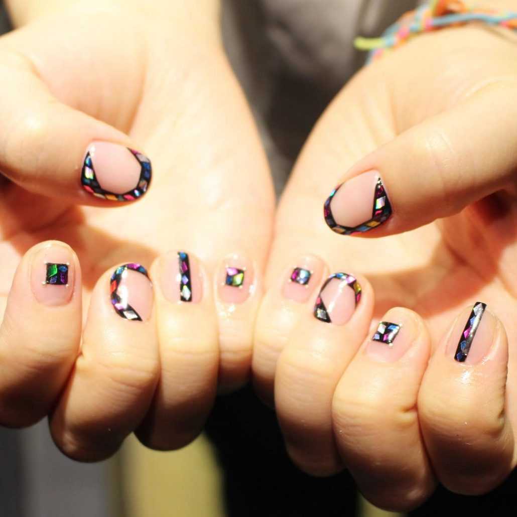 Также весной 2019 еще одна актуальная идея декора ногтей – это битое стекло. С помощью данного элемента украшения ногтей также можно выполнить различные геометрические фигуры любых цветов.