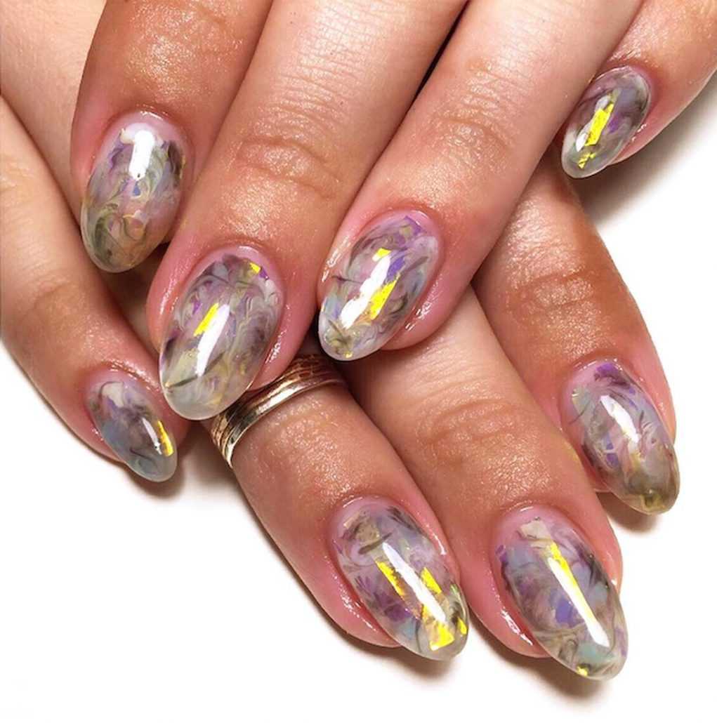 Что же касаемо природных фактур на ногтях. Этот дизайн по-своему уникален. Если вы не знаете, что сделать себе из новых артов весной, то попробуйте этот необычный дизайн — мрамор, бирюза, гранит подойдёт под любую длину. Добавить в него можно золотые полоски из фольги. Вы подобрали для себя такой вариант? И нам он очень пришелся по вкусу.